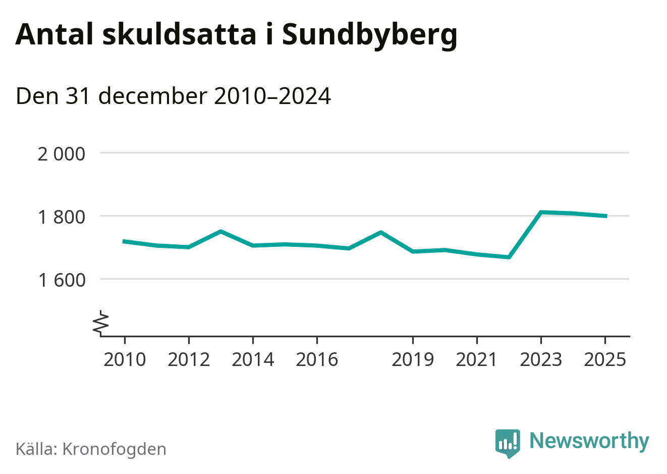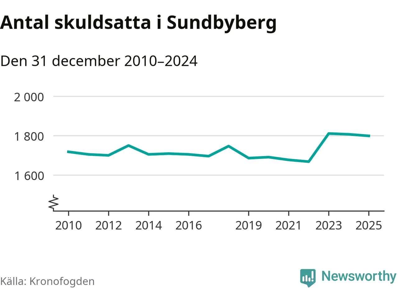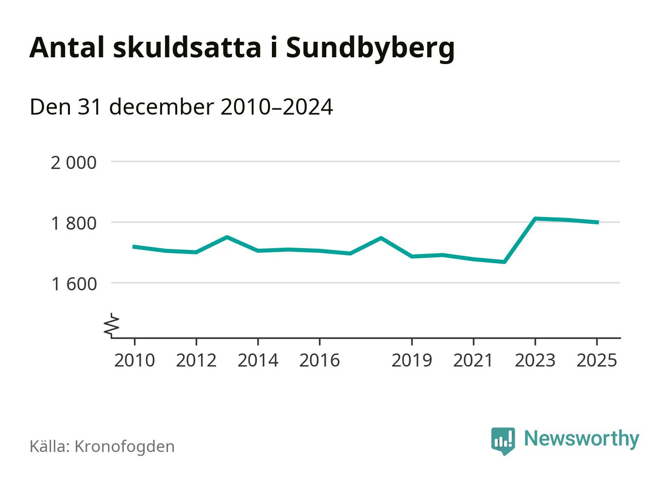 Vid årskiftet var 4 procent av alla Sundbybergs­bor över 18 år registrerade hos Kronofogden. Störst andel skuldsatta i länet finns i Botkyrka (6 procent), medan den lägsta andelen finns i Danderyd (1 procent).