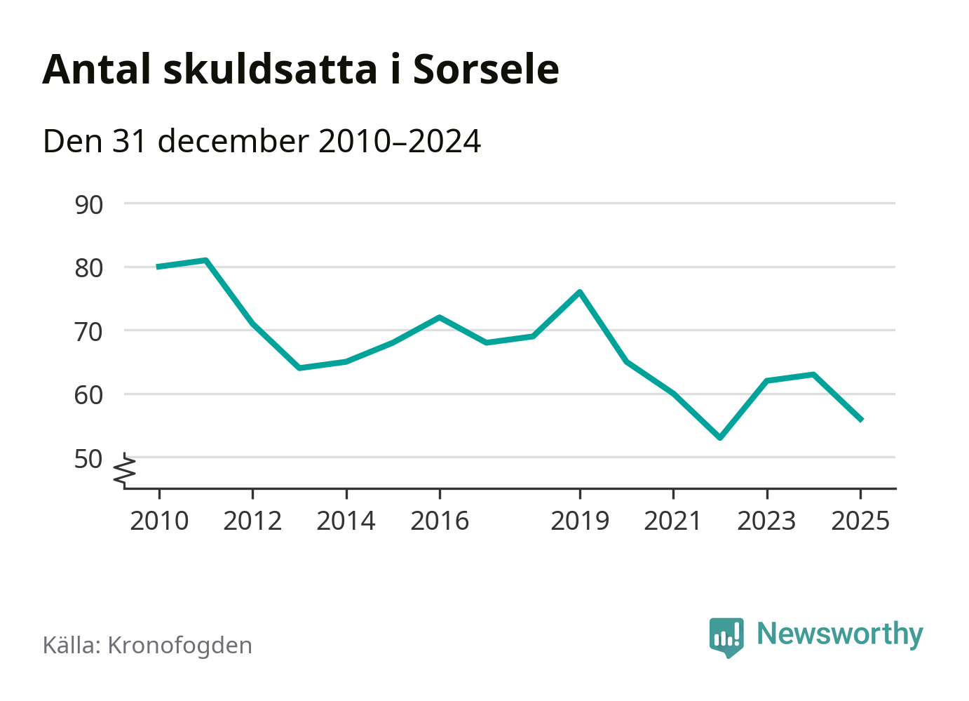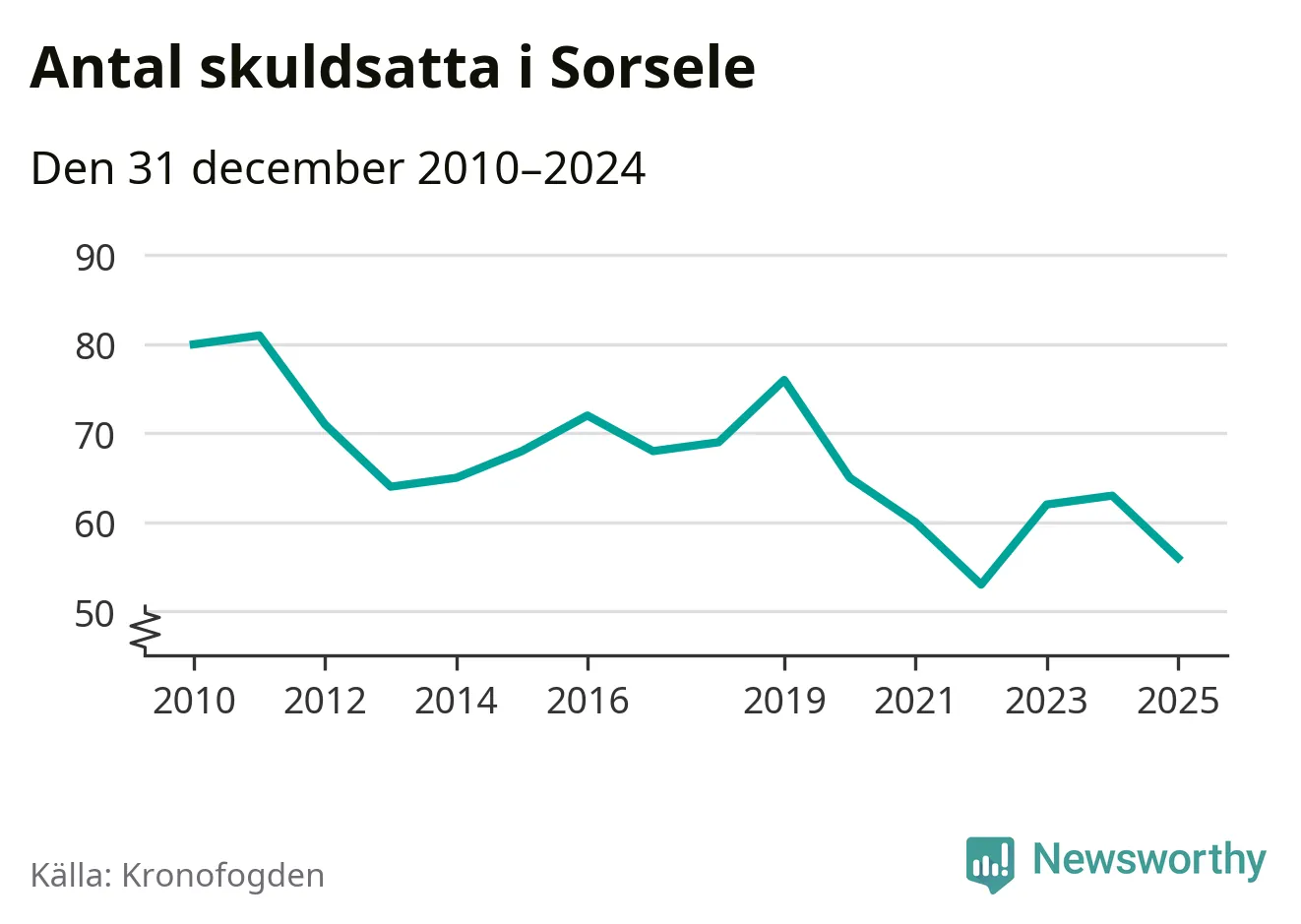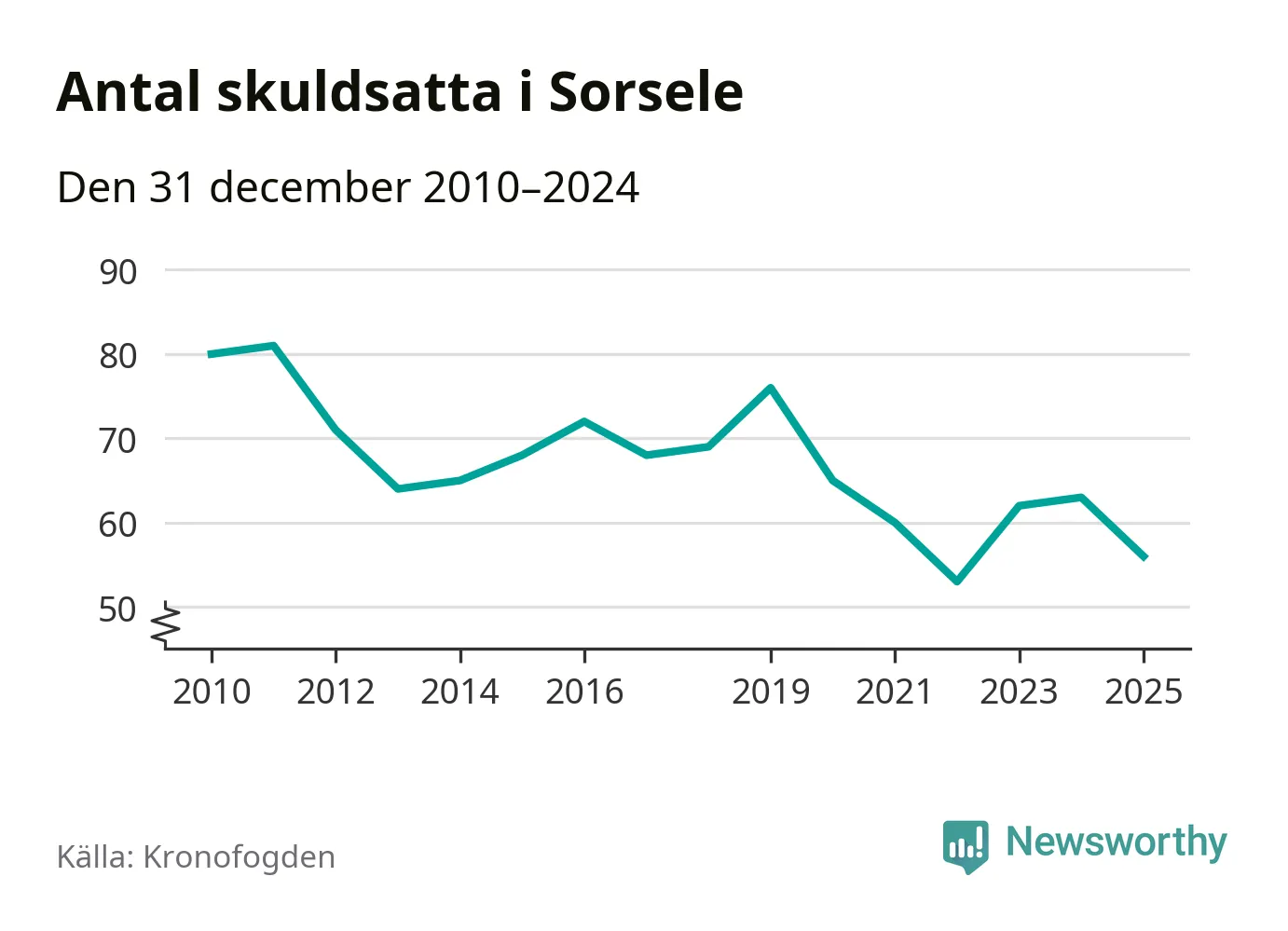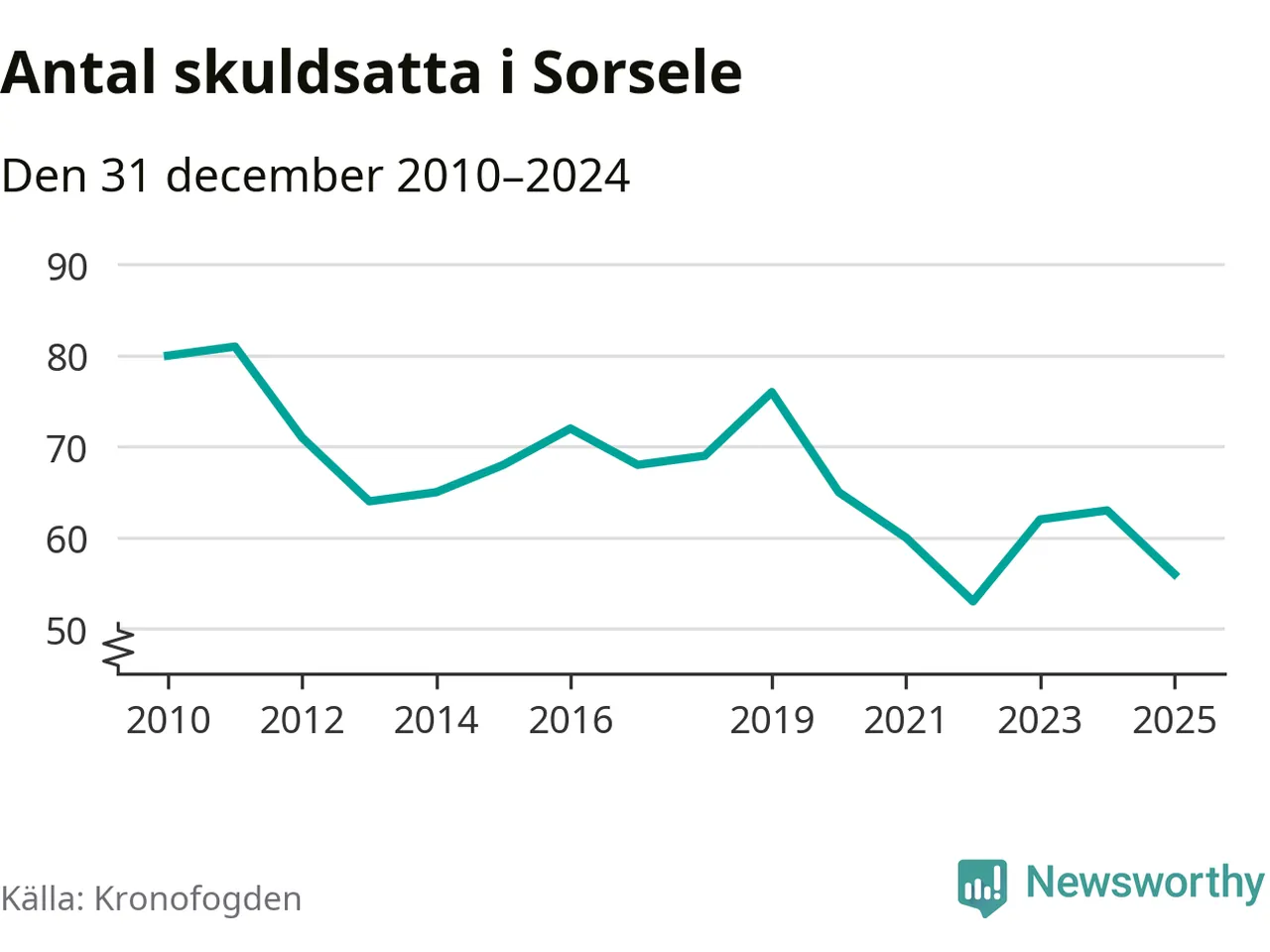 Antalet Sorselebor hos Kronofogden minskade i fjol. Vid årskiftet var 56 invånare i kommunen skyldiga totalt 13,2 miljoner kronor. Det är en minskning med sju personer jämfört med året innan.