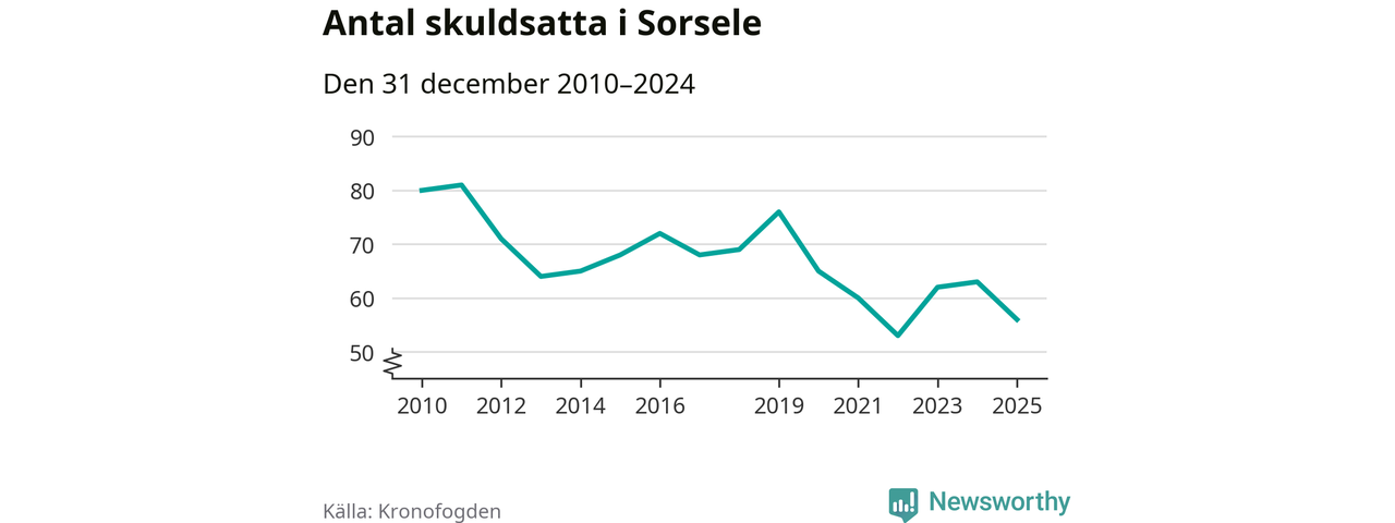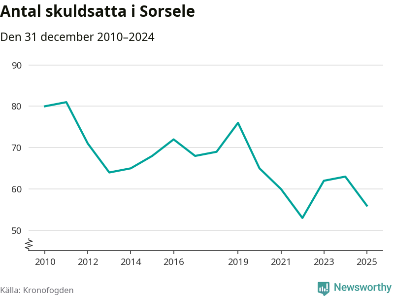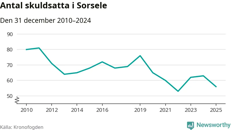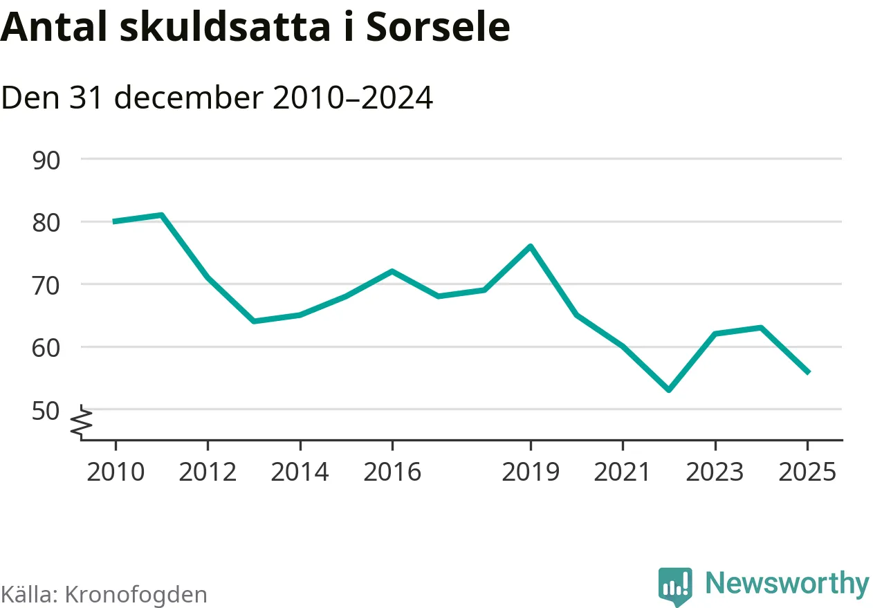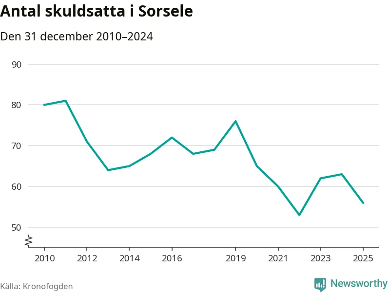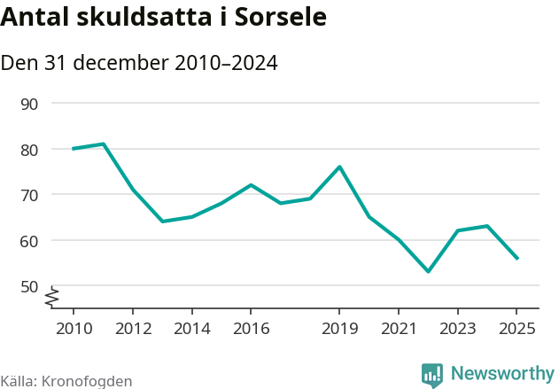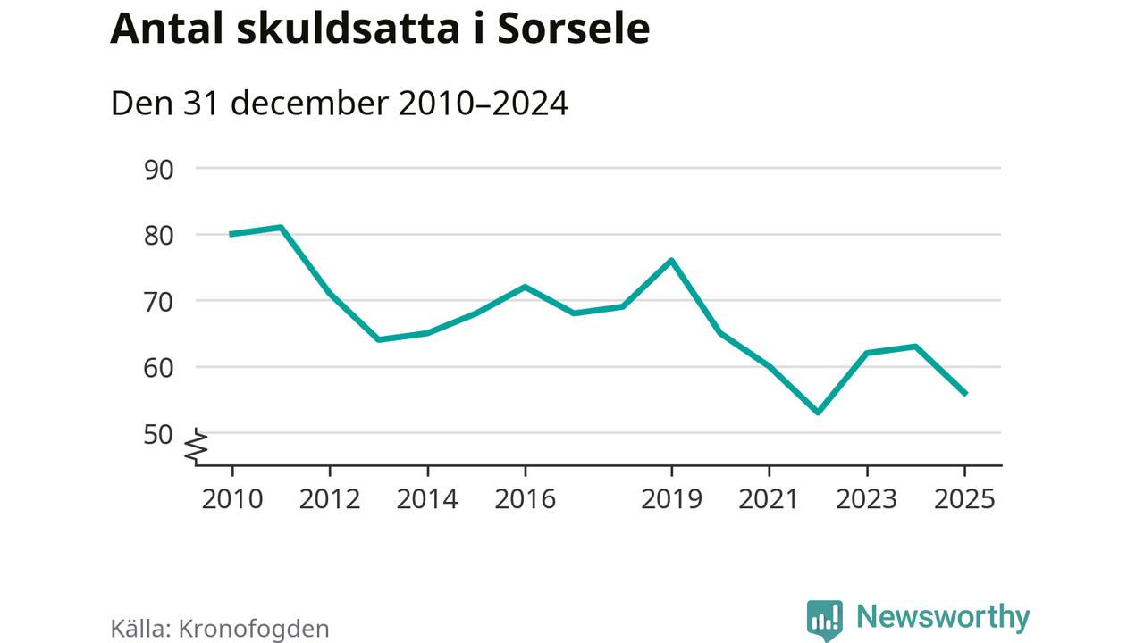 Antalet Sorselebor hos Kronofogden minskade i fjol. Vid årskiftet var 56 invånare i kommunen skyldiga totalt 13,2 miljoner kronor. Det är en minskning med sju personer jämfört med året innan.
