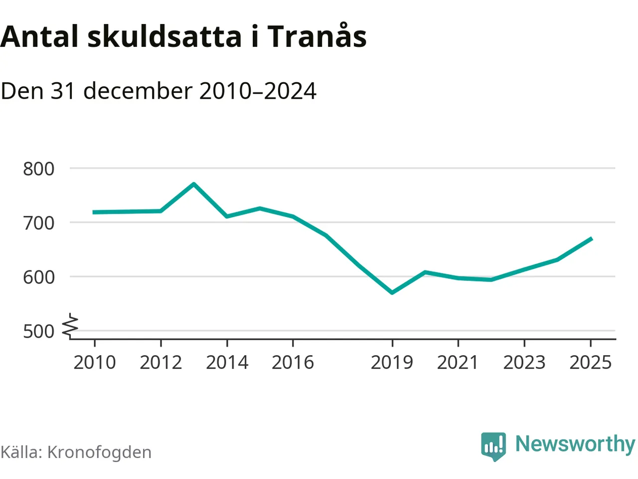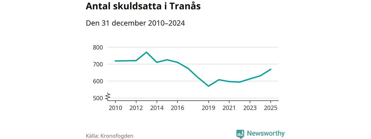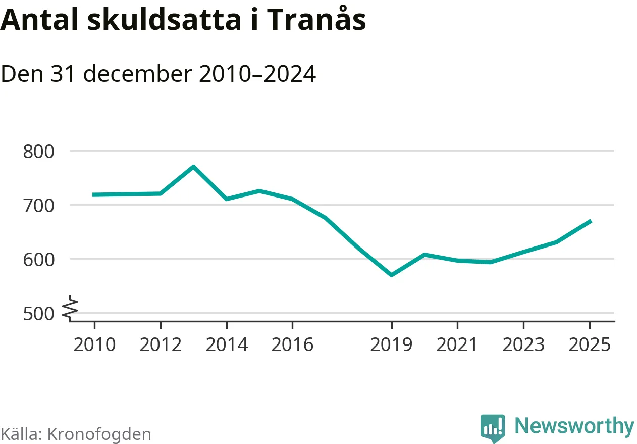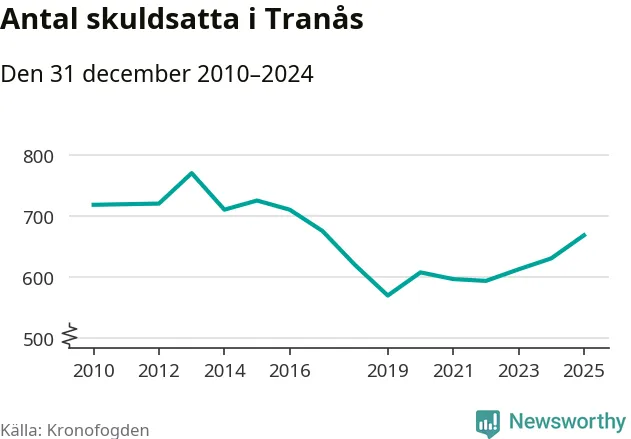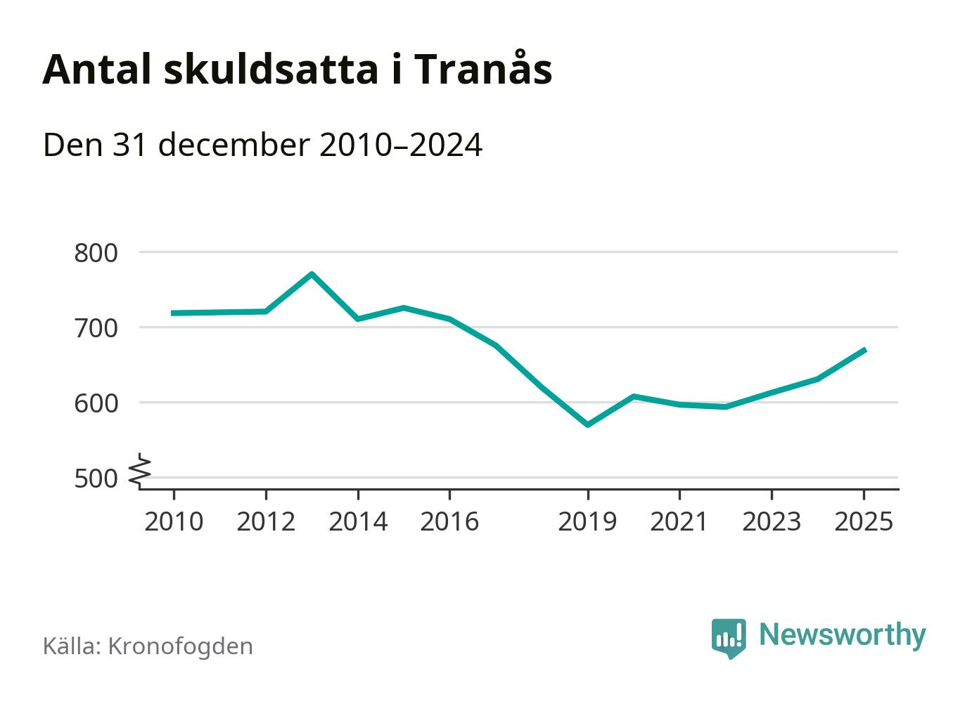 Allt fler Tranåsbor hamnar hos Kronofogden. Vid årskiftet var 668 invånare i kommunen skyldiga totalt 175,5 miljoner kronor. Det är en ökning med 38 personer – eller 6 procent – jämfört med året innan. Det är det högsta antalet sedan 2017.