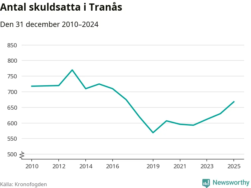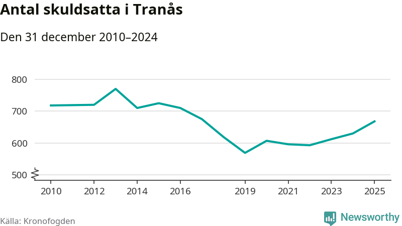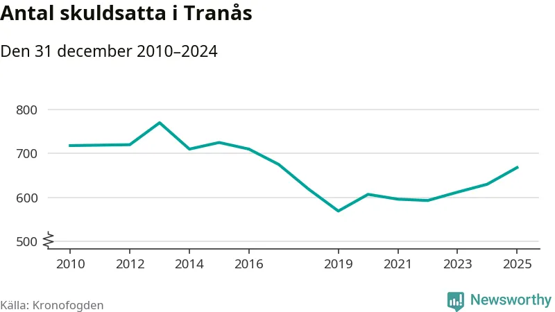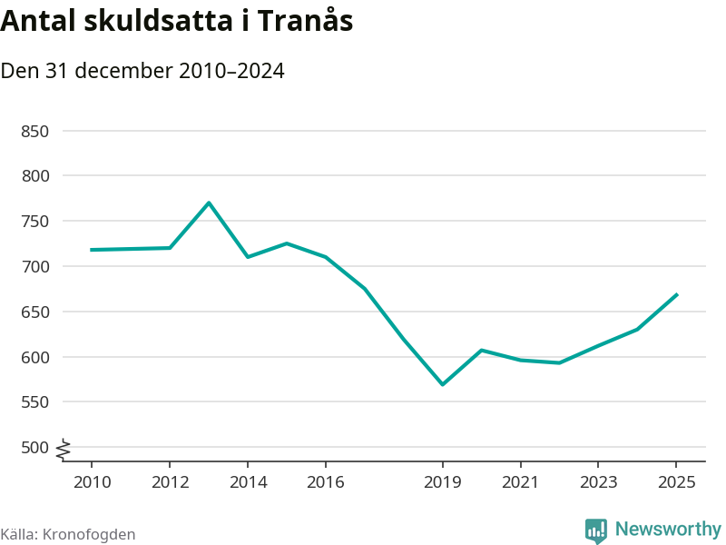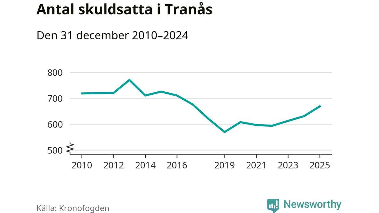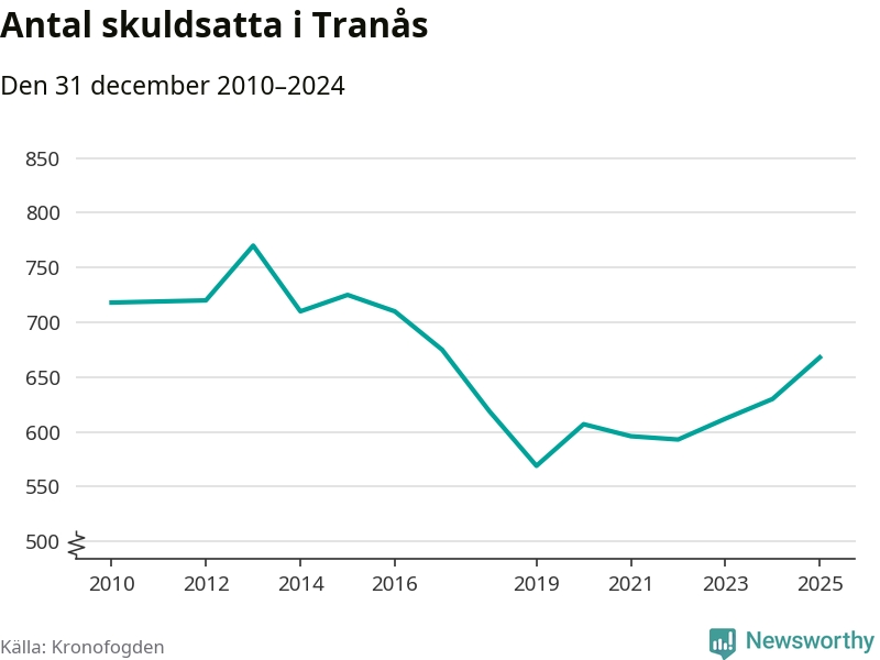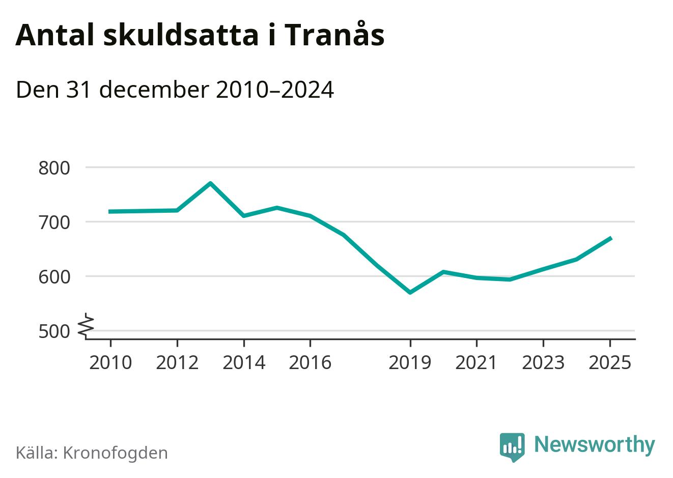 Allt fler Tranåsbor hamnar hos Kronofogden. Vid årskiftet var 668 invånare i kommunen skyldiga totalt 175,5 miljoner kronor. Det är en ökning med 38 personer – eller 6 procent – jämfört med året innan. Det är det högsta antalet sedan 2017.