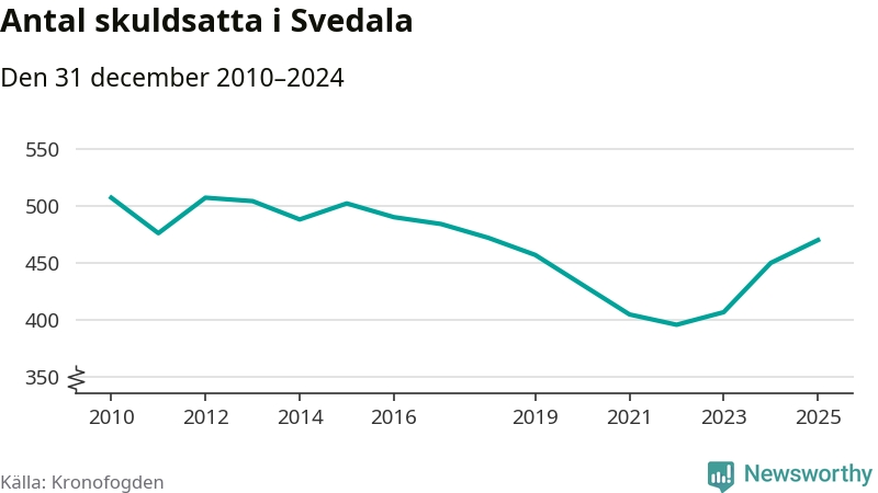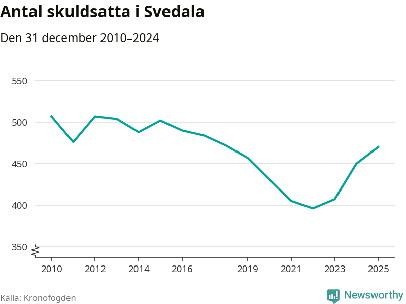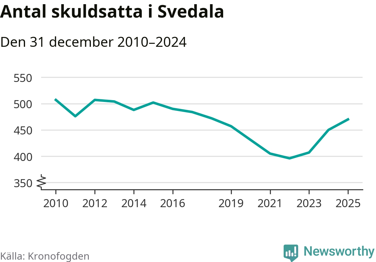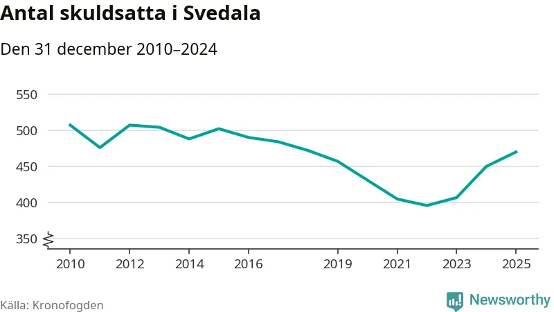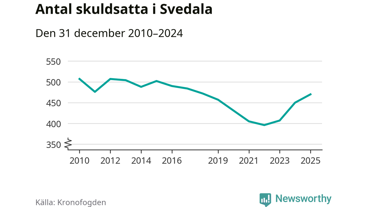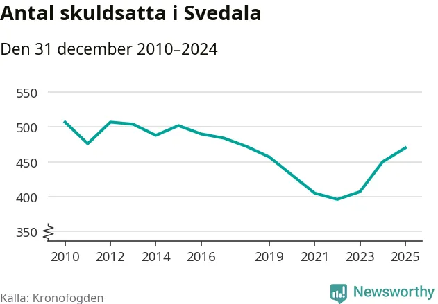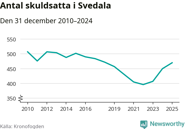 Allt fler Svedala­bor hamnar hos Kronofogden. Vid årskiftet var 470 invånare i kommunen skyldiga totalt 167,5 miljoner kronor. Det är en ökning med 20 personer – eller 4 procent – jämfört med året innan. Det är det högsta antalet sedan 2018.