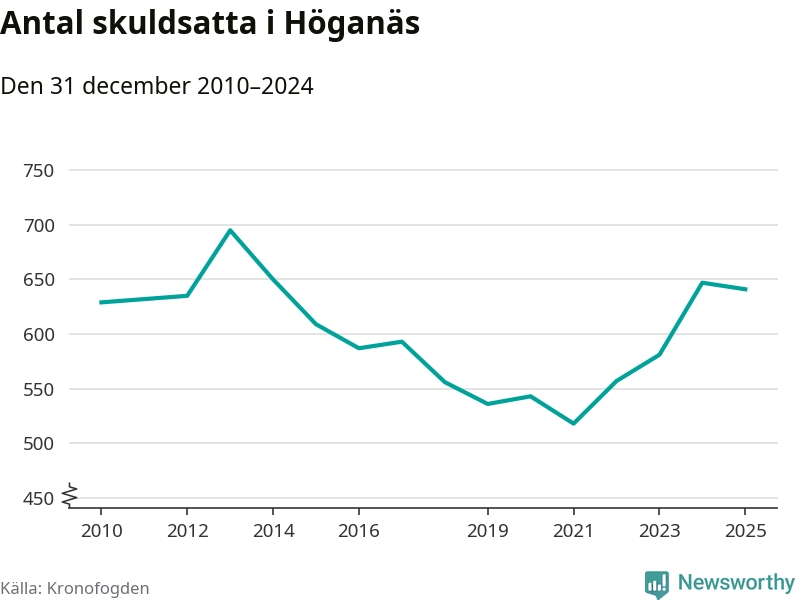 Vid årskiftet var 3 procent av alla Höganäsbor över 18 år registrerade hos Kronofogden. Störst andel skuldsatta i länet finns i Perstorp (9 procent), medan den lägsta andelen finns i Lomma (1 procent).