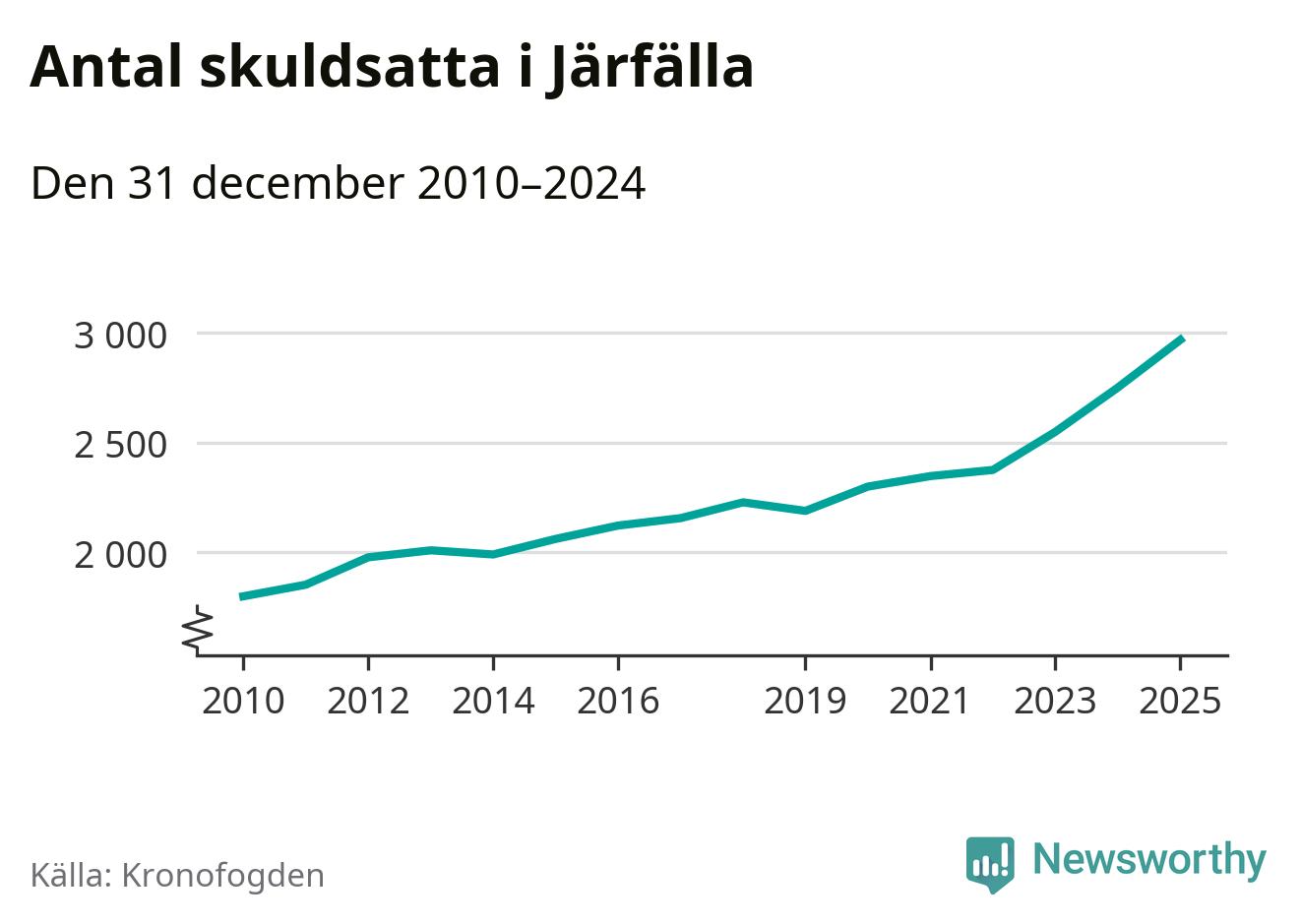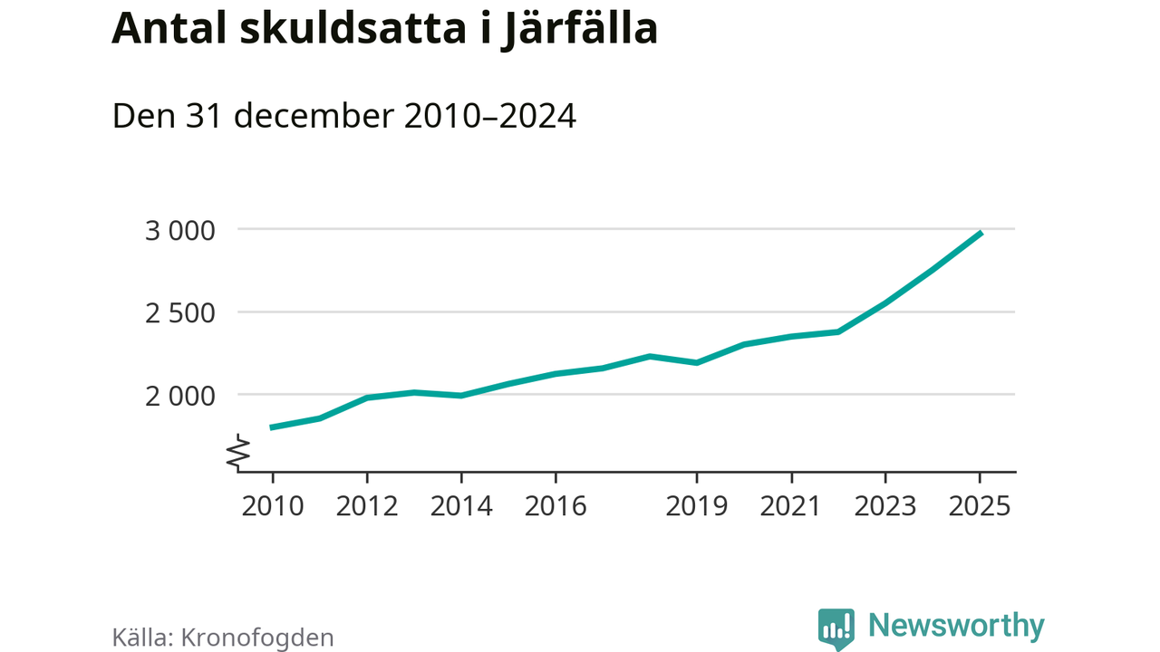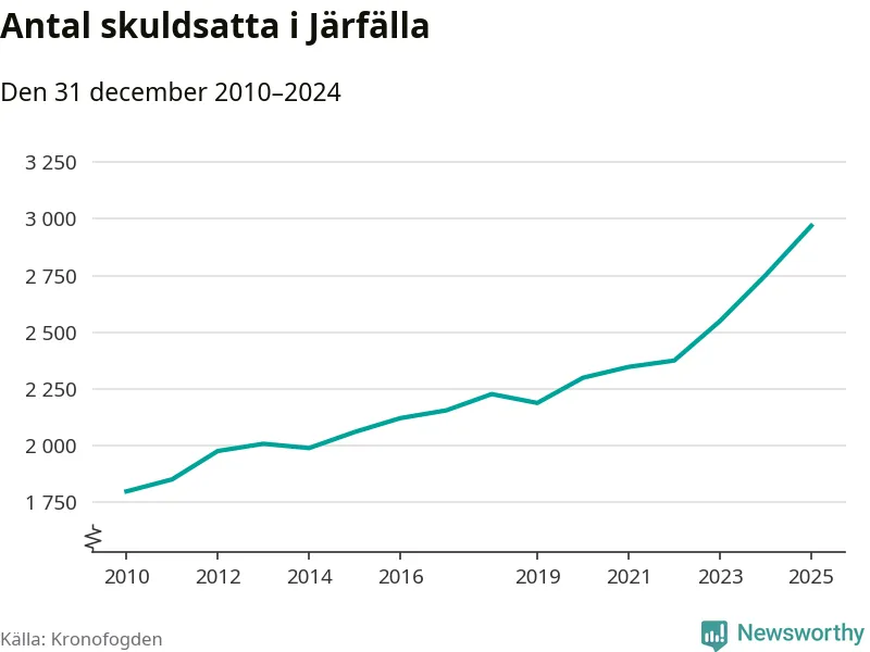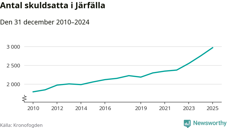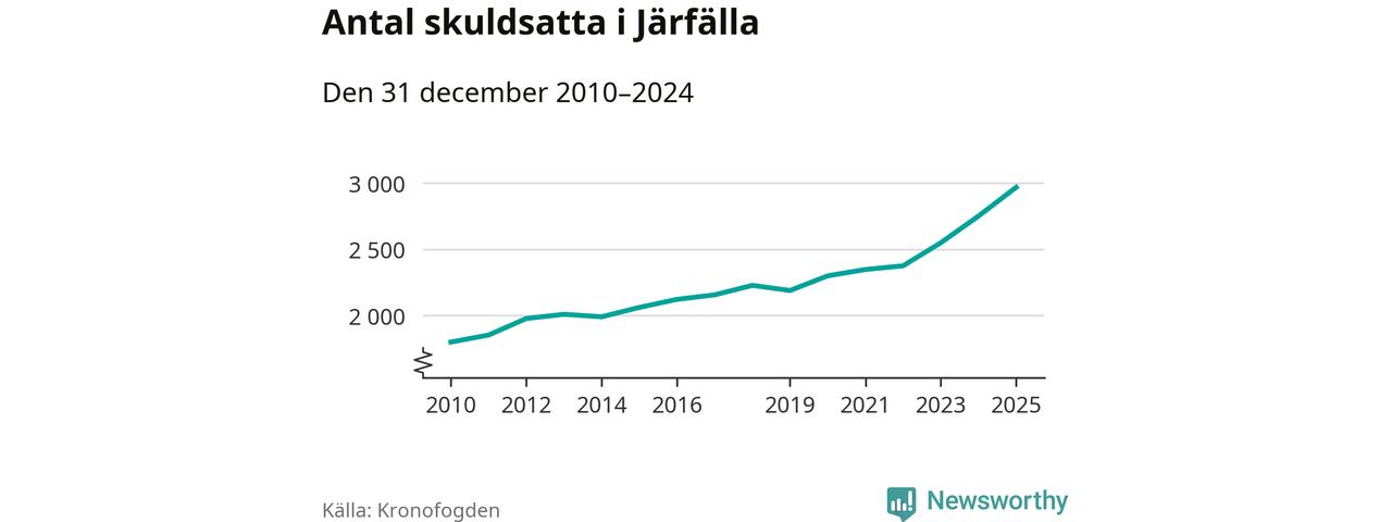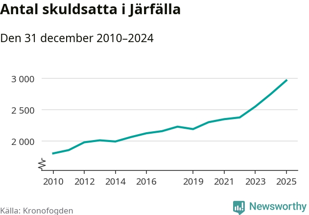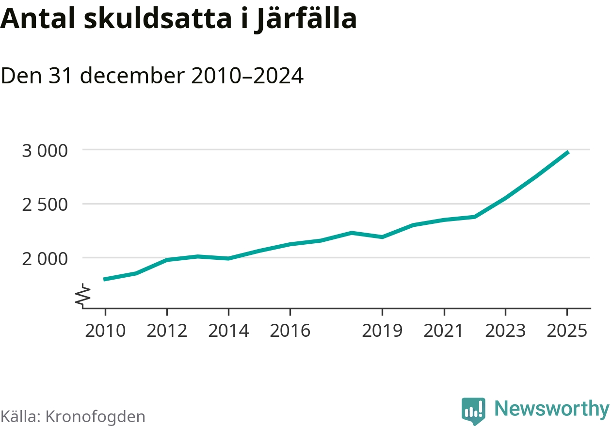 Inte sedan åtminstone 2010 har så många Järfällabor hamnat hos Kronofogden. Vid årskiftet var 2 969 invånare i kommunen skyldiga totalt två miljarder kronor. Det är en ökning med 218 personer – eller 8 procent – jämfört med året innan.