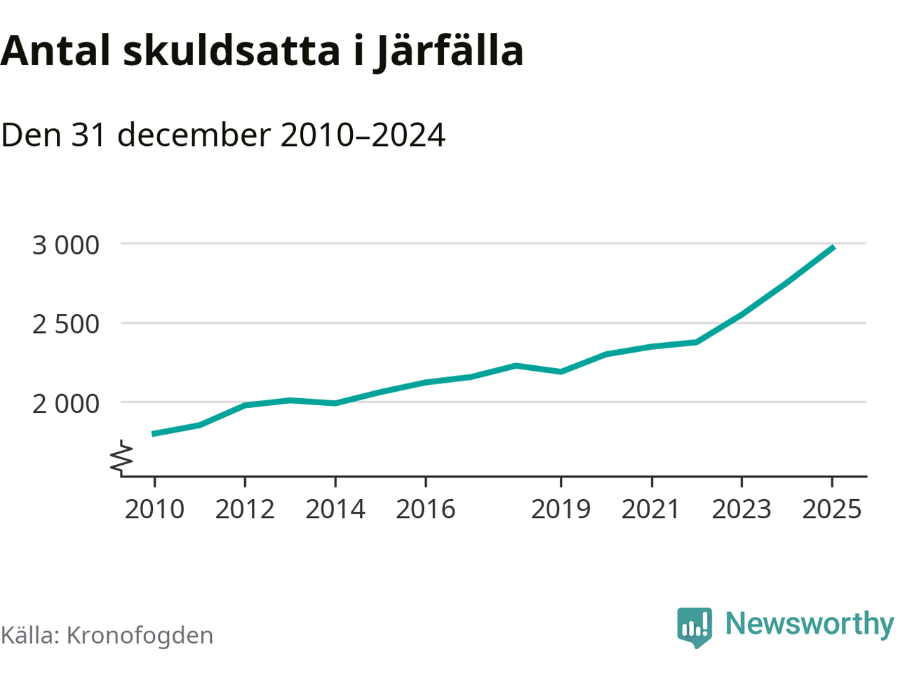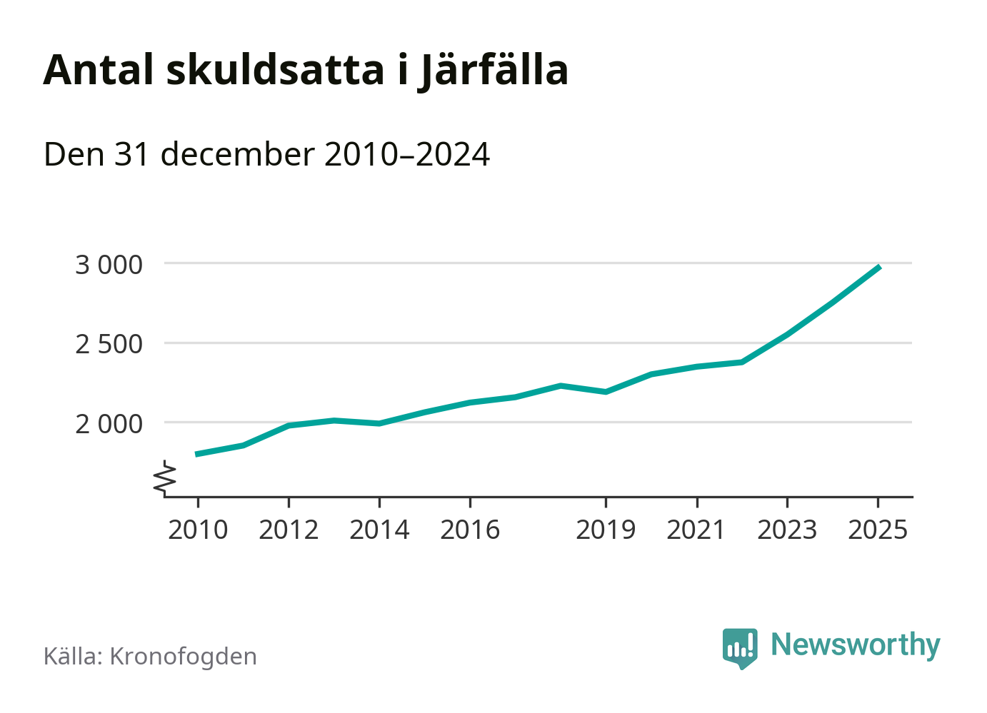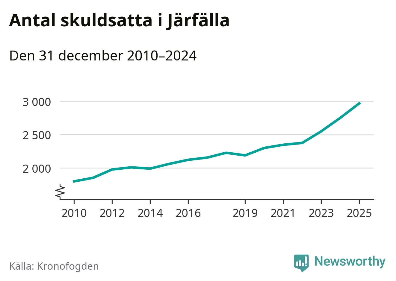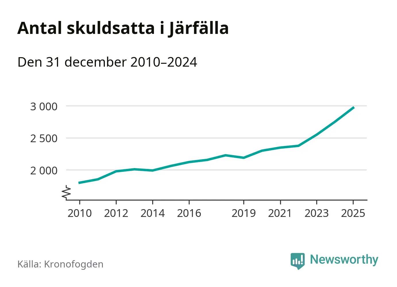 Inte sedan åtminstone 2010 har så många Järfällabor hamnat hos Kronofogden. Vid årskiftet var 2 969 invånare i kommunen skyldiga totalt två miljarder kronor. Det är en ökning med 218 personer – eller 8 procent – jämfört med året innan.