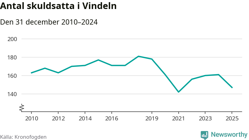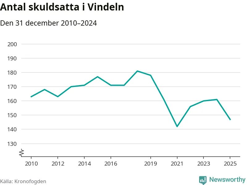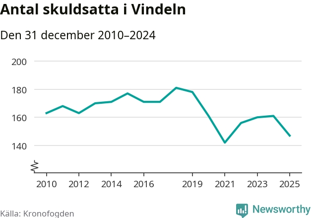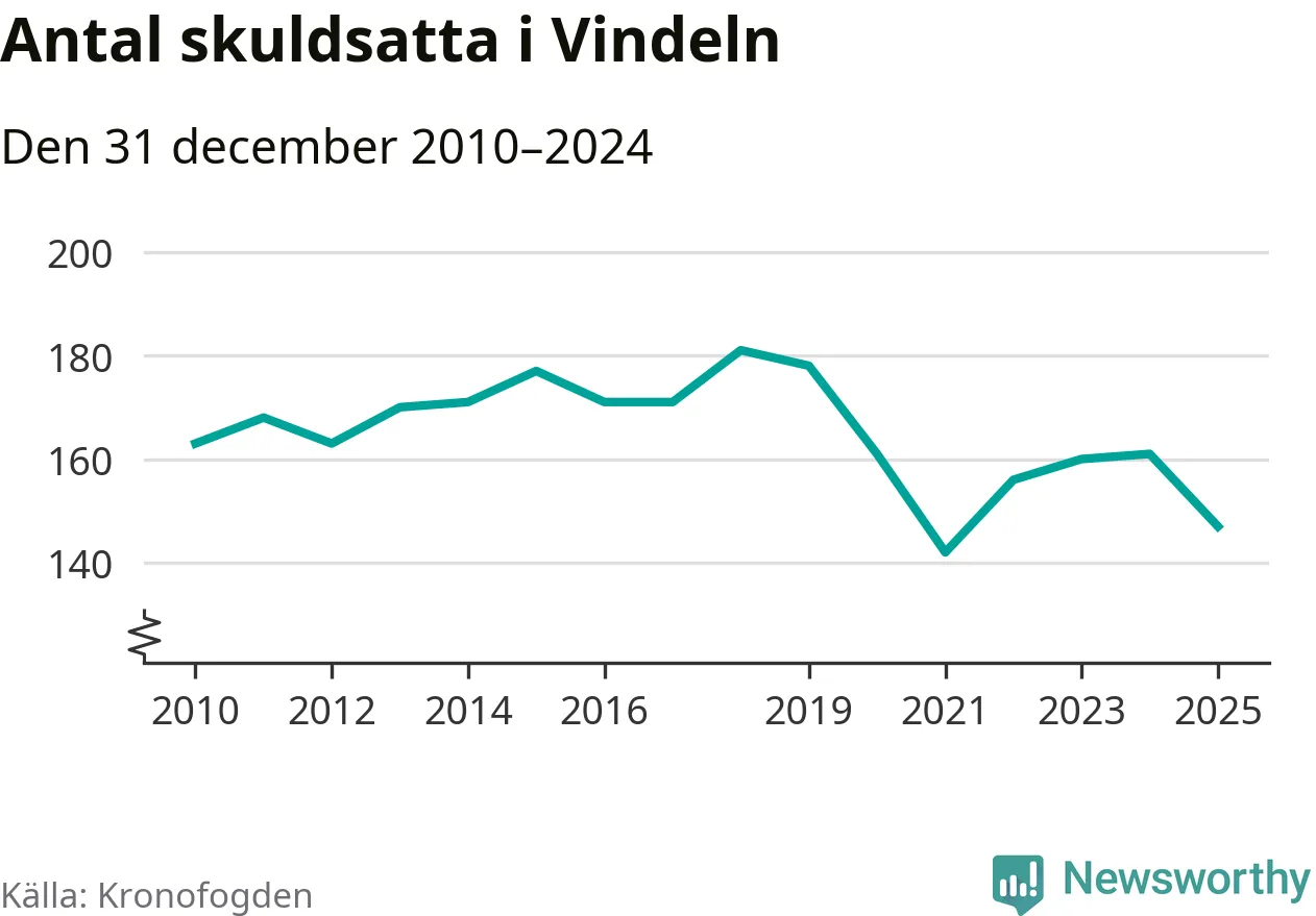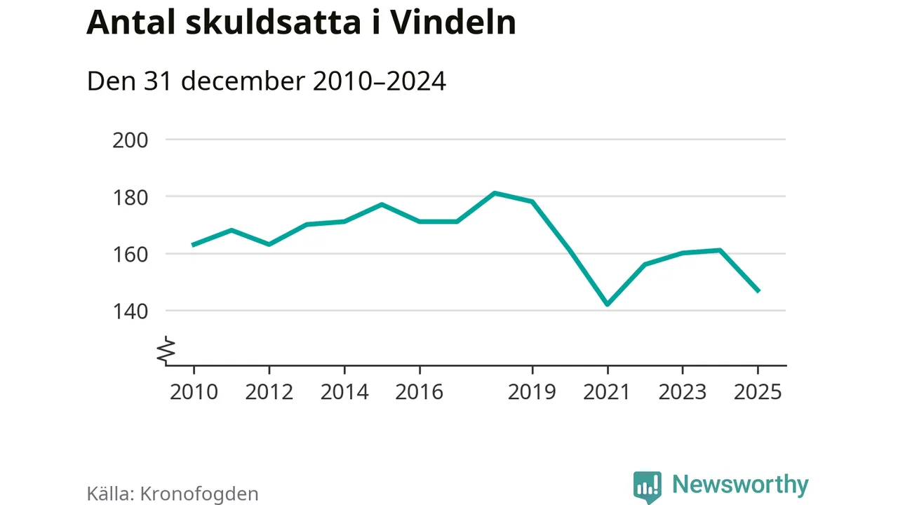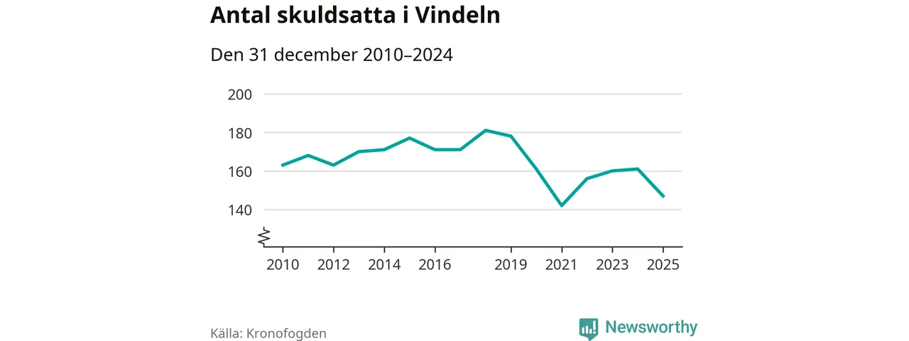 Antalet Vindelnbor hos Kronofogden minskade i fjol. Vid årskiftet var 147 invånare i kommunen skyldiga totalt 48,1 miljoner kronor. Det är en minskning med 14 personer – eller 9 procent – jämfört med året innan.