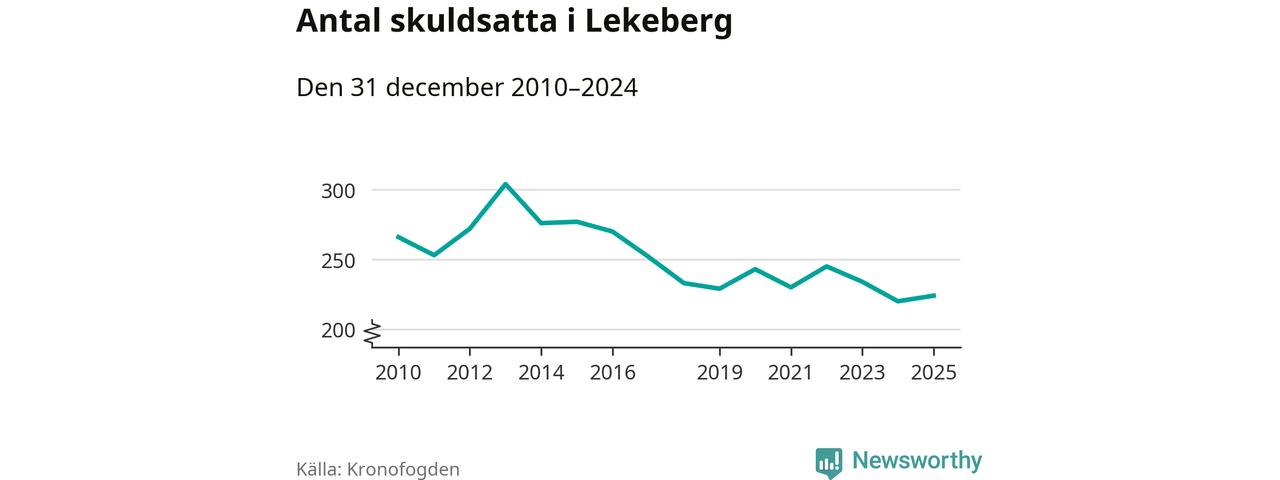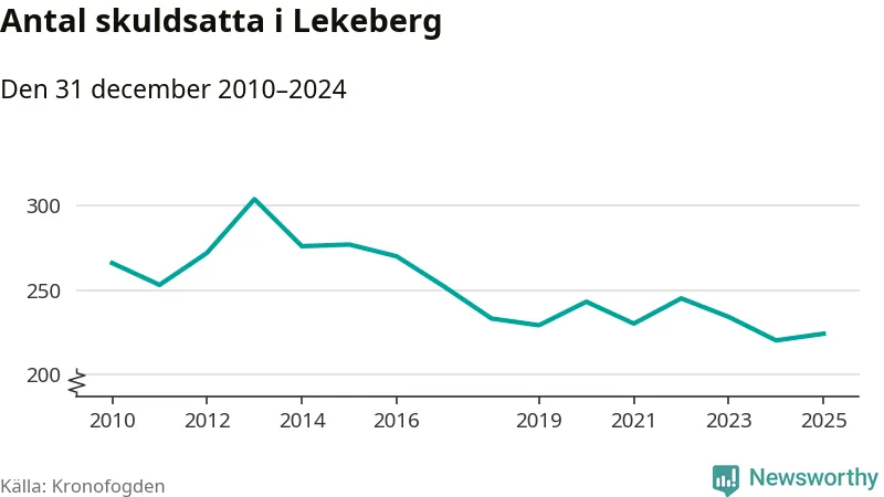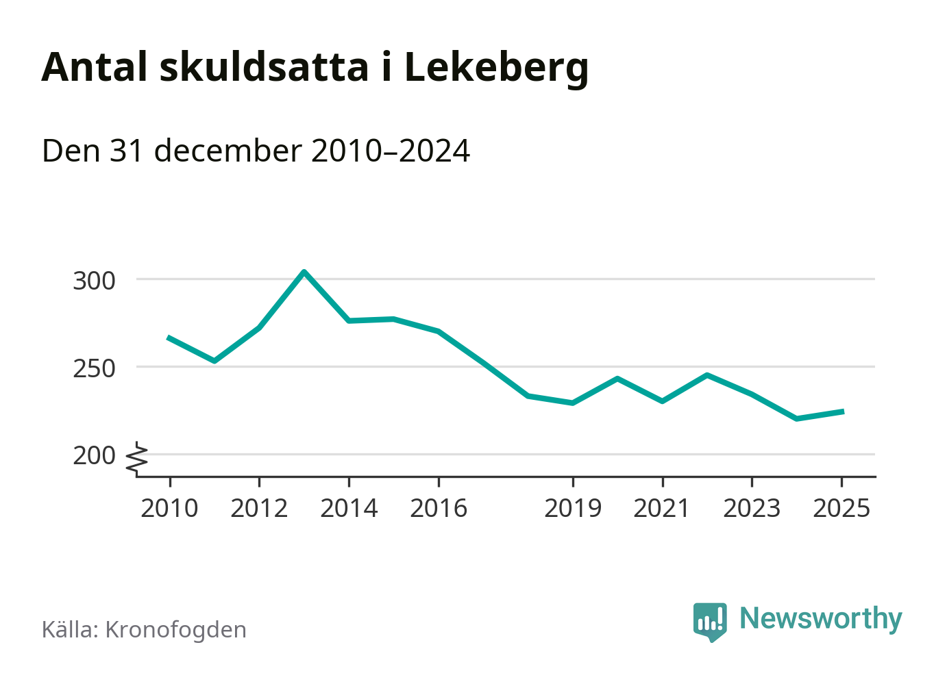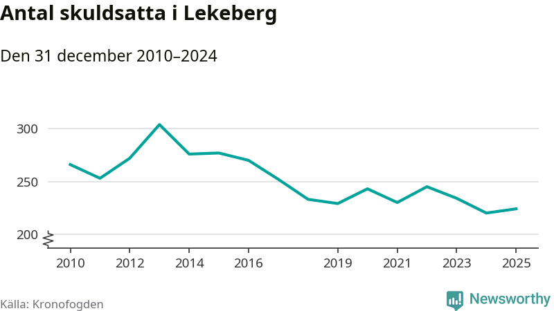 Vid årskiftet var 3 procent av alla Lekebergs­bor över 18 år registrerade hos Kronofogden. Det är den lägsta andelen av alla kommuner i Örebro län. Störst andel skuldsatta i länet finns i Ljusnarsberg (9 procent).