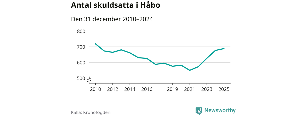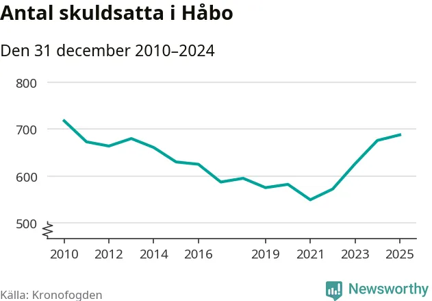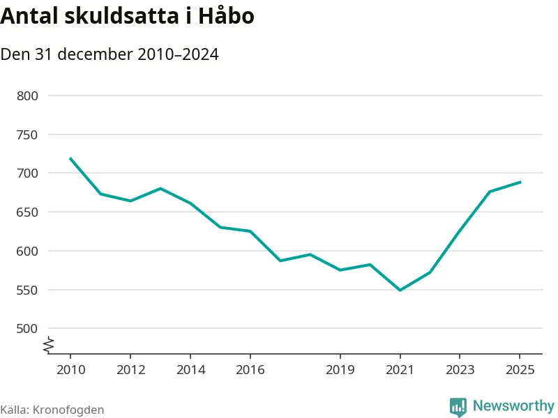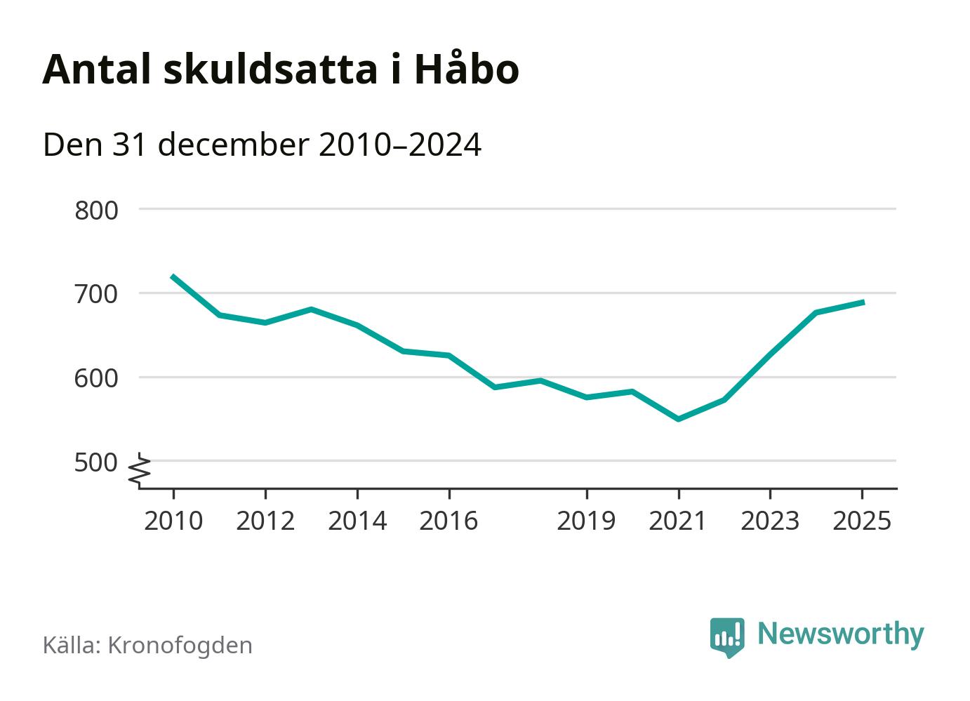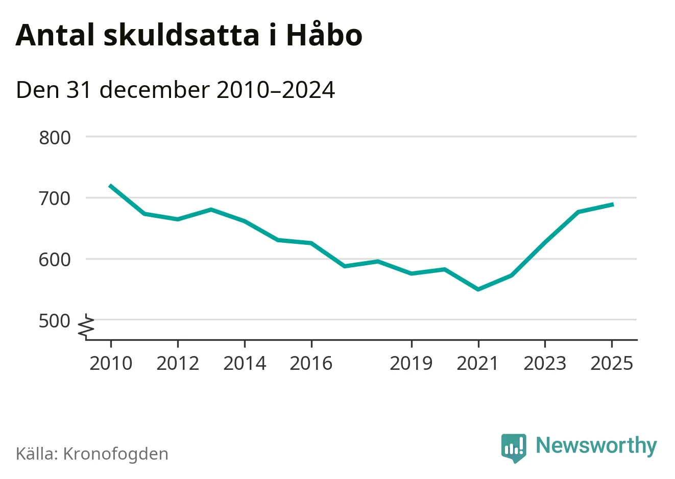 Allt fler Håbo­bor hamnar hos Kronofogden. Vid årskiftet var 688 invånare i kommunen skyldiga totalt 317,8 miljoner kronor. Det är en ökning med tolv personer – eller 2 procent – jämfört med året innan. Det är det högsta antalet sedan 2010.