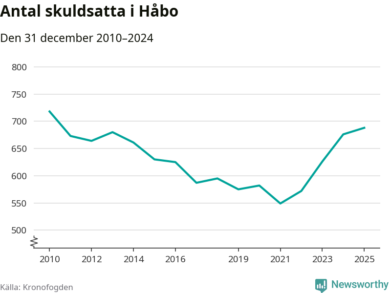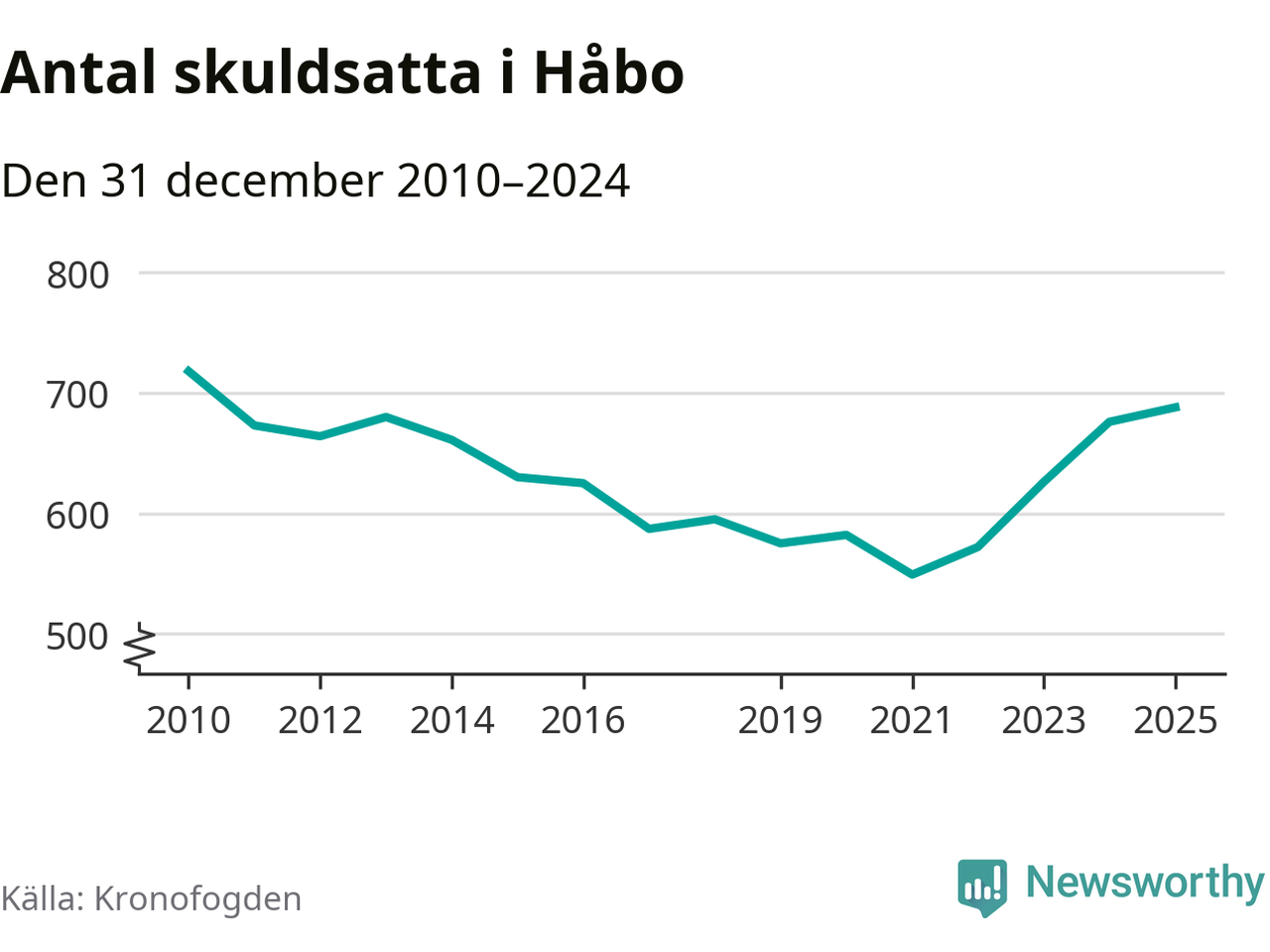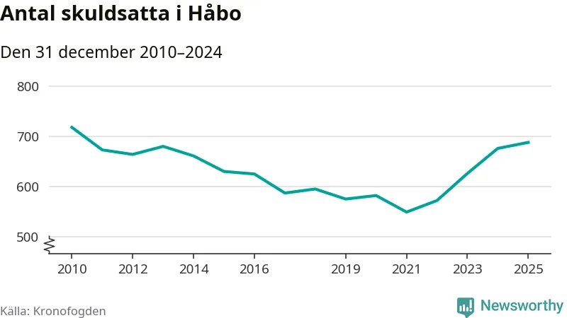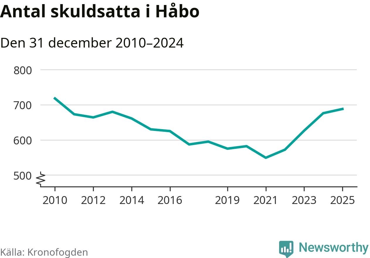 Allt fler Håbo­bor hamnar hos Kronofogden. Vid årskiftet var 688 invånare i kommunen skyldiga totalt 317,8 miljoner kronor. Det är en ökning med tolv personer – eller 2 procent – jämfört med året innan. Det är det högsta antalet sedan 2010.