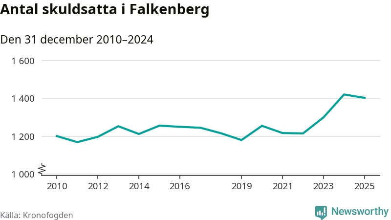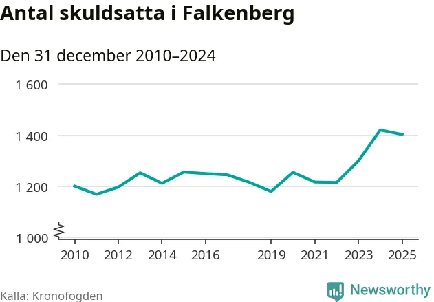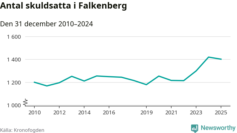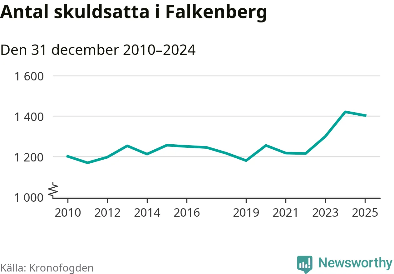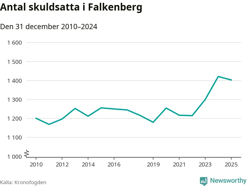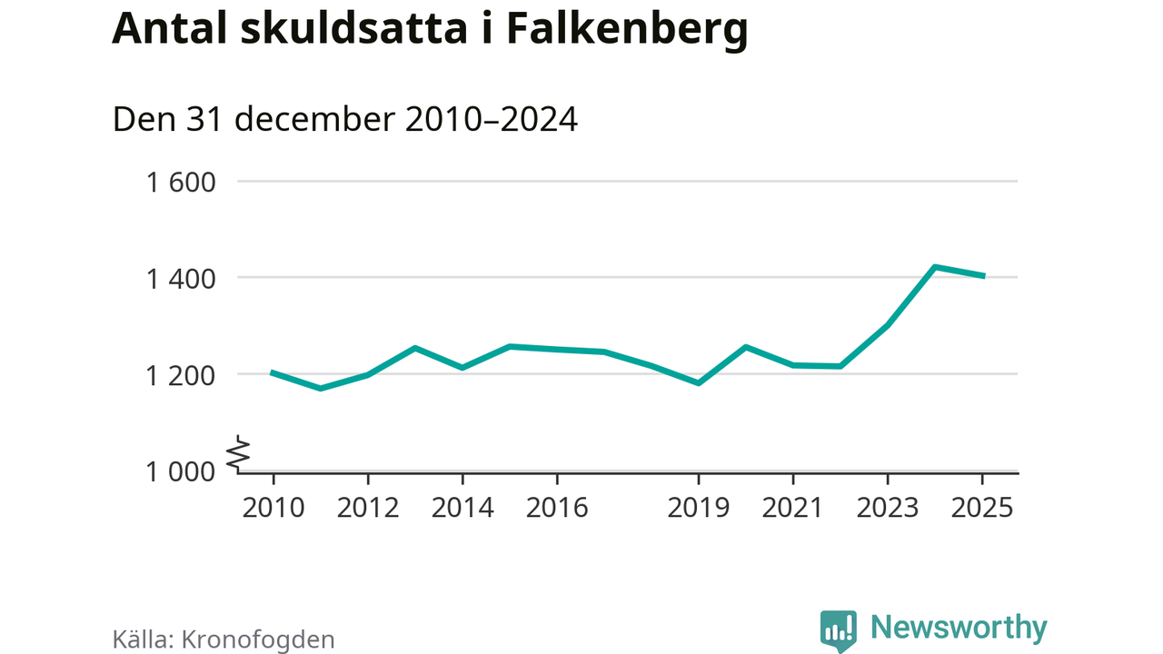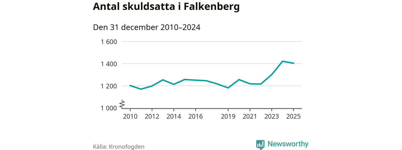 Vid årskiftet var 4 procent av alla Falkenbergs­bor över 18 år registrerade hos Kronofogden. Störst andel skuldsatta i länet finns i Hylte (6 procent), medan den lägsta andelen finns i Kungsbacka (2 procent).