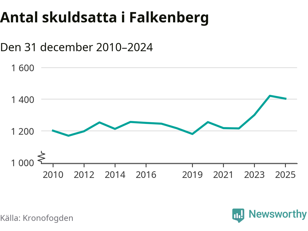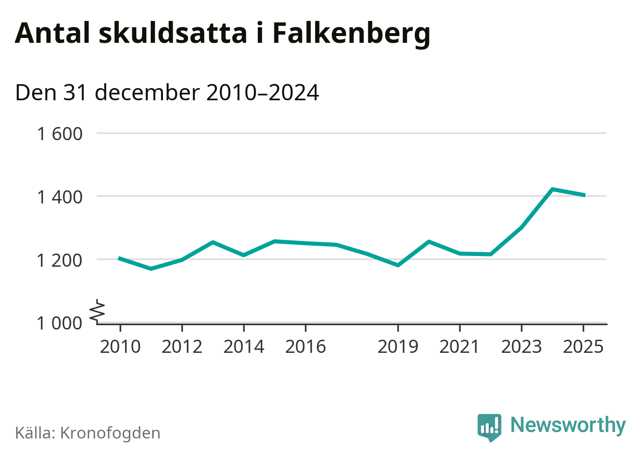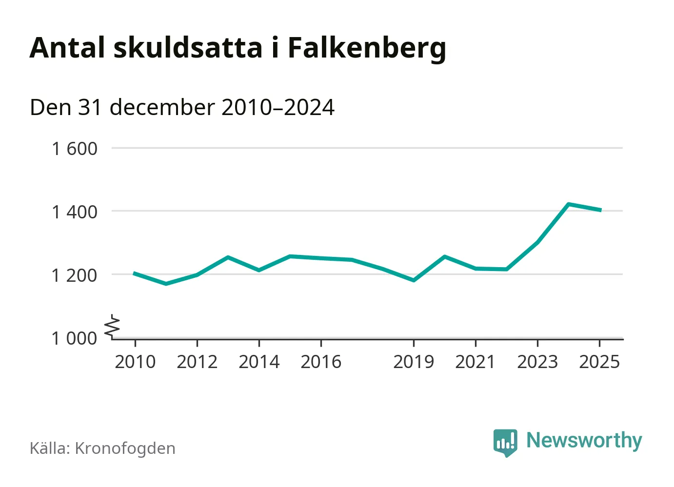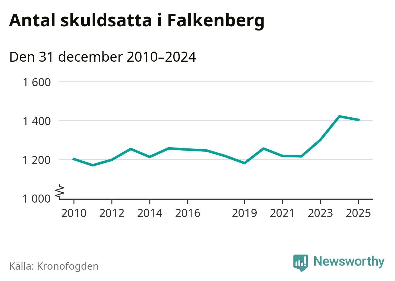 Vid årskiftet var 4 procent av alla Falkenbergs­bor över 18 år registrerade hos Kronofogden. Störst andel skuldsatta i länet finns i Hylte (6 procent), medan den lägsta andelen finns i Kungsbacka (2 procent).