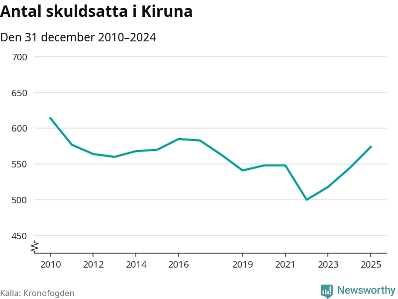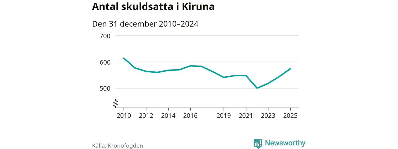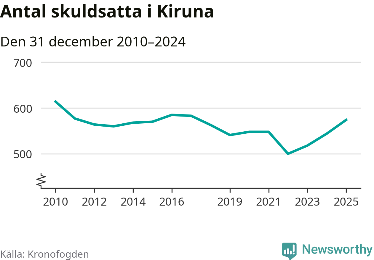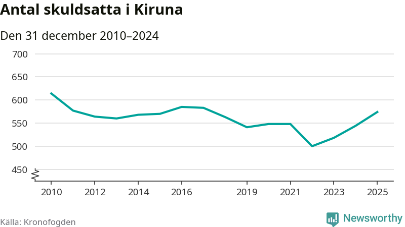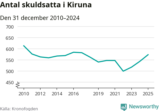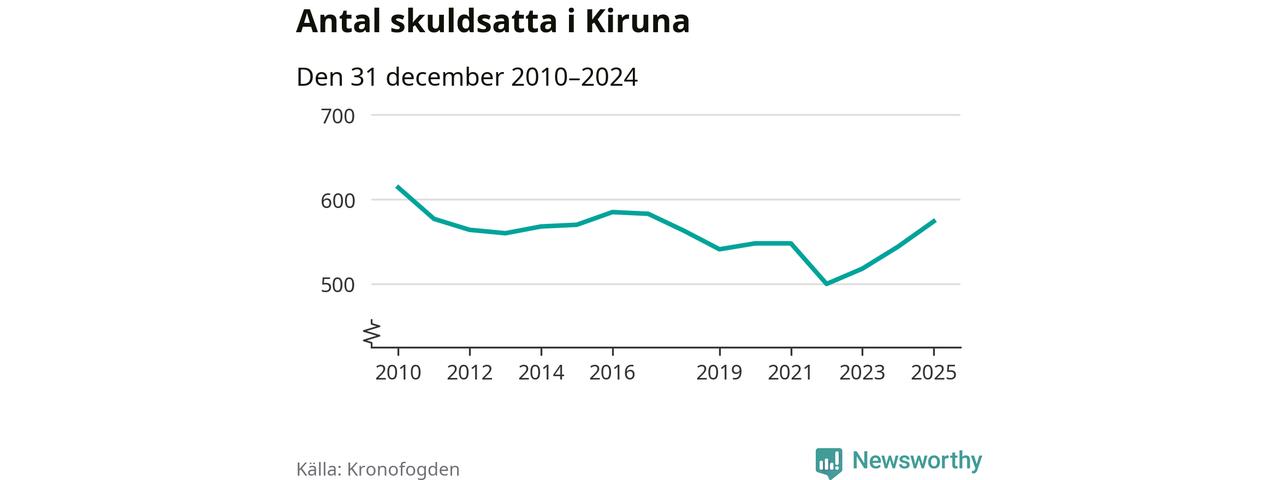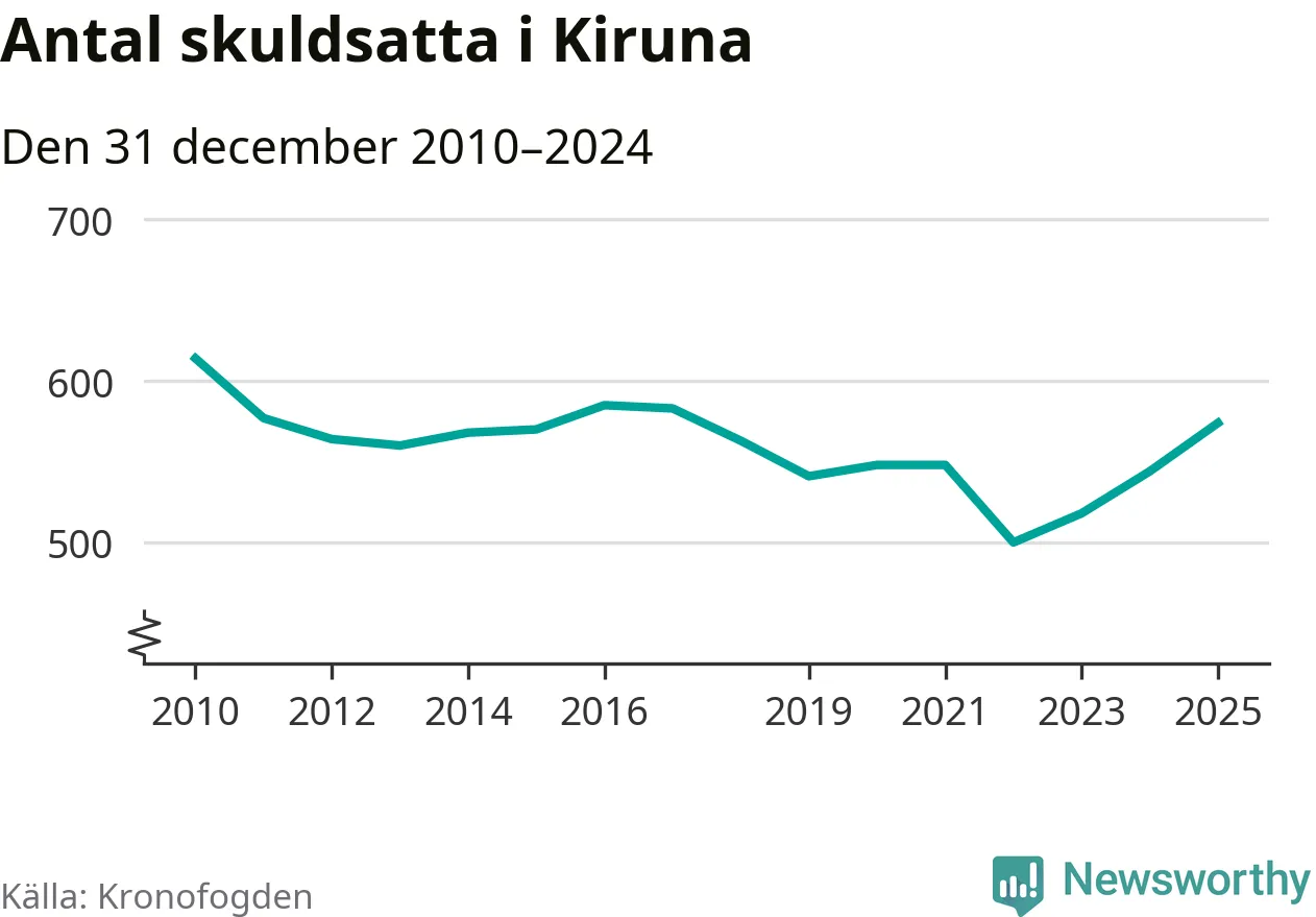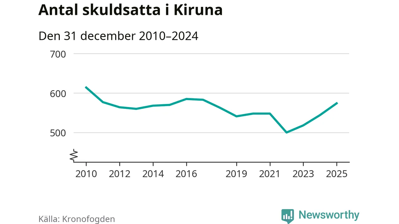 Allt fler Kiruna­bor hamnar hos Kronofogden. Vid årskiftet var 574 invånare i kommunen skyldiga totalt 192,7 miljoner kronor. Det är en ökning med 30 personer – eller 6 procent – jämfört med året innan. Det är det högsta antalet sedan 2017.