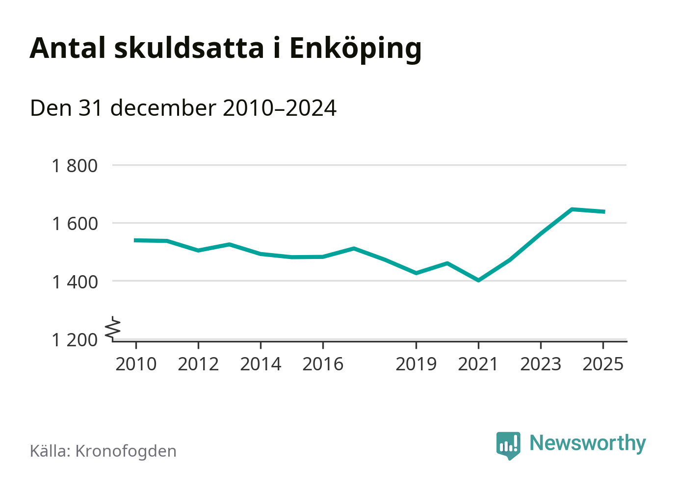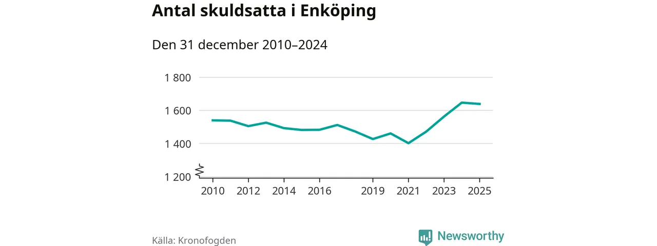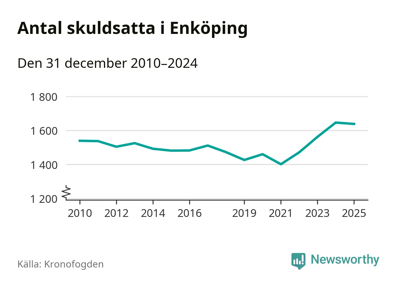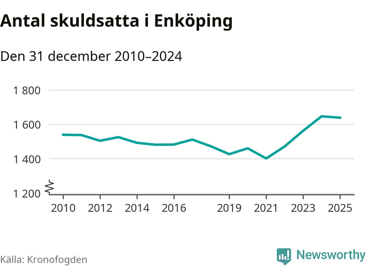 Vid årskiftet var 4 procent av alla Enköpingsbor över 18 år registrerade hos Kronofogden. Störst andel skuldsatta i länet finns i Tierp (6 procent), medan den lägsta andelen finns i Knivsta (3 procent).