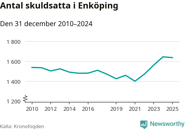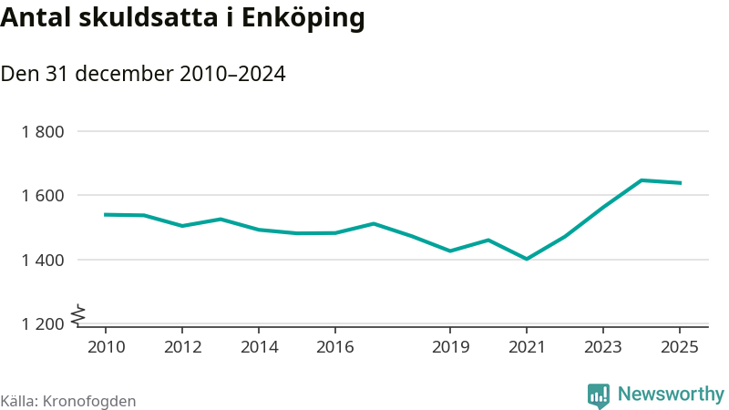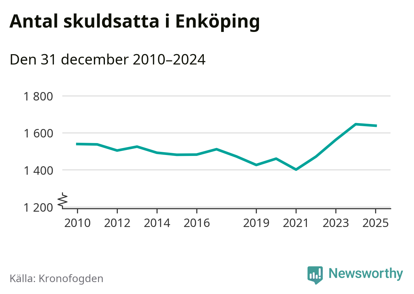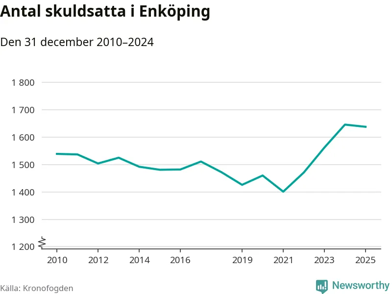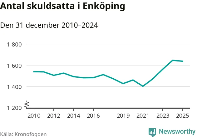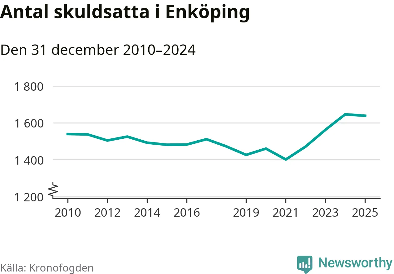 Vid årskiftet var 4 procent av alla Enköpingsbor över 18 år registrerade hos Kronofogden. Störst andel skuldsatta i länet finns i Tierp (6 procent), medan den lägsta andelen finns i Knivsta (3 procent).