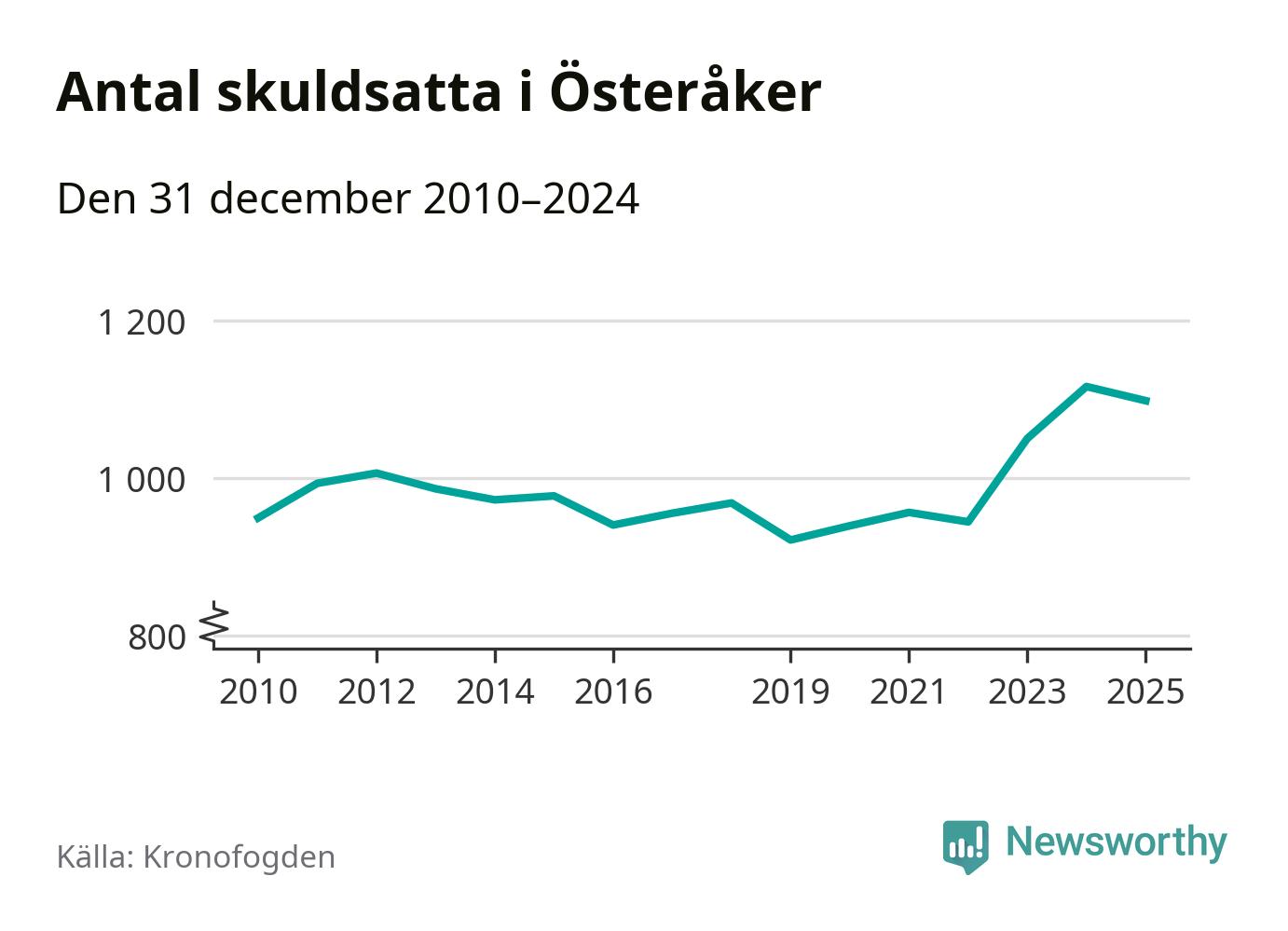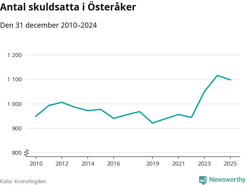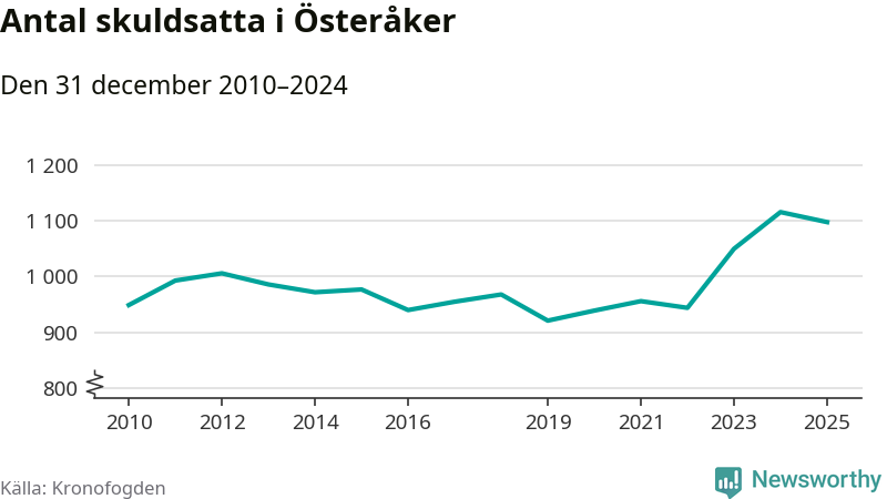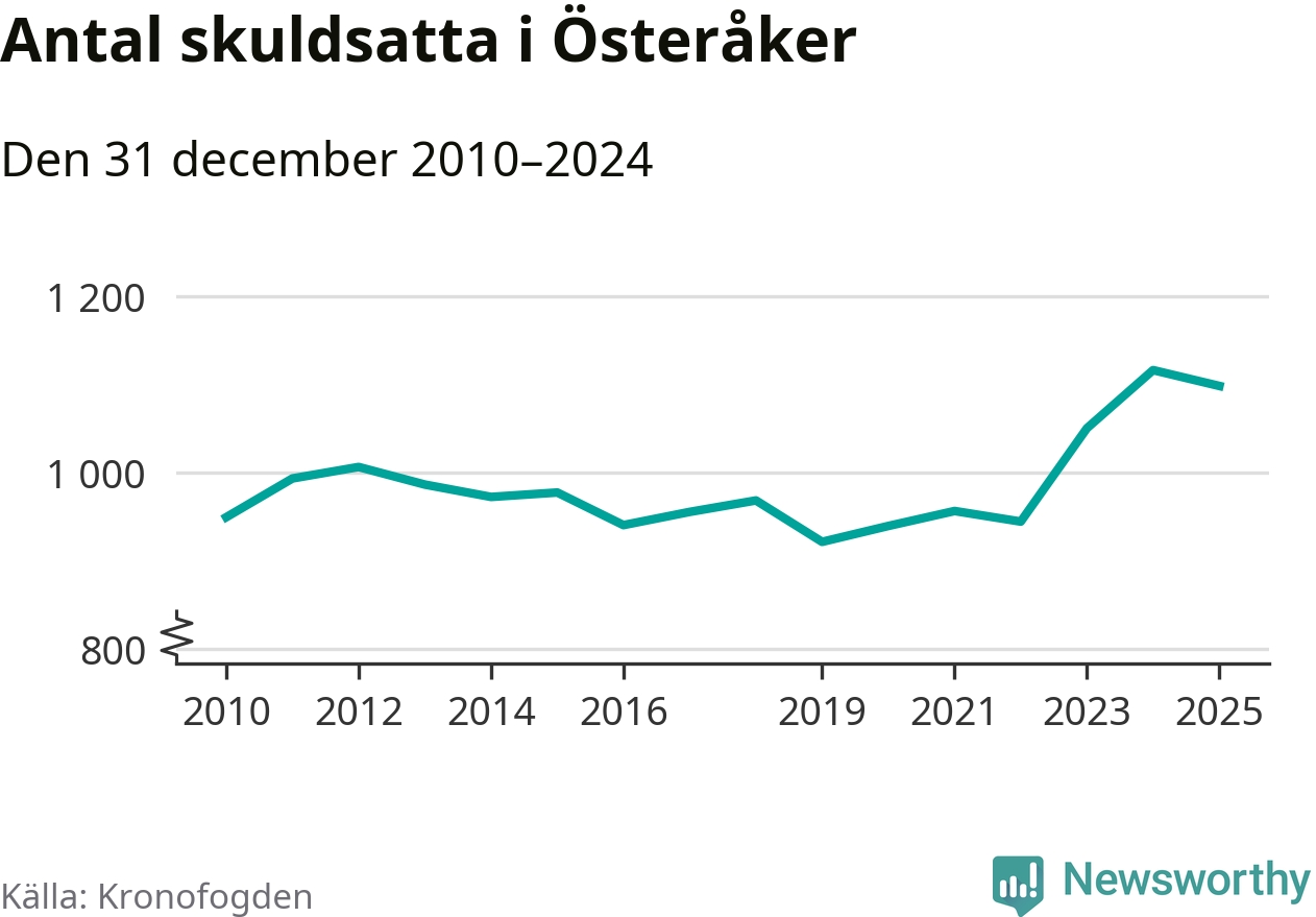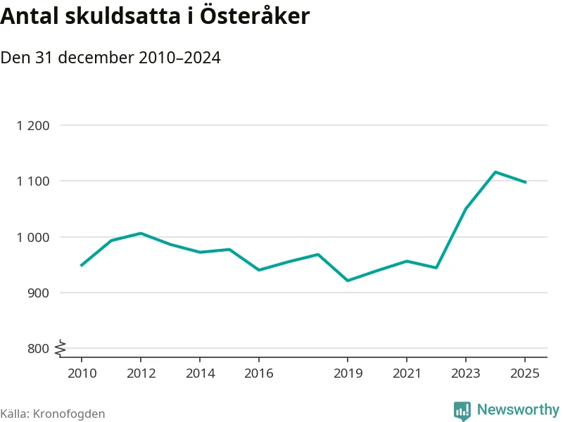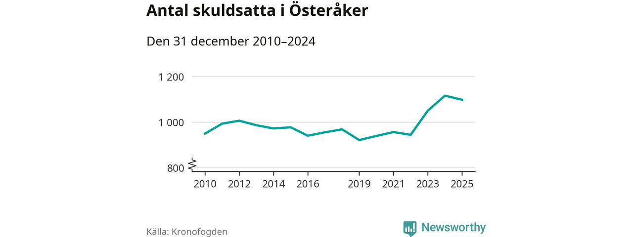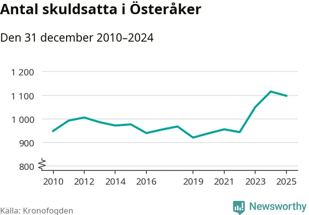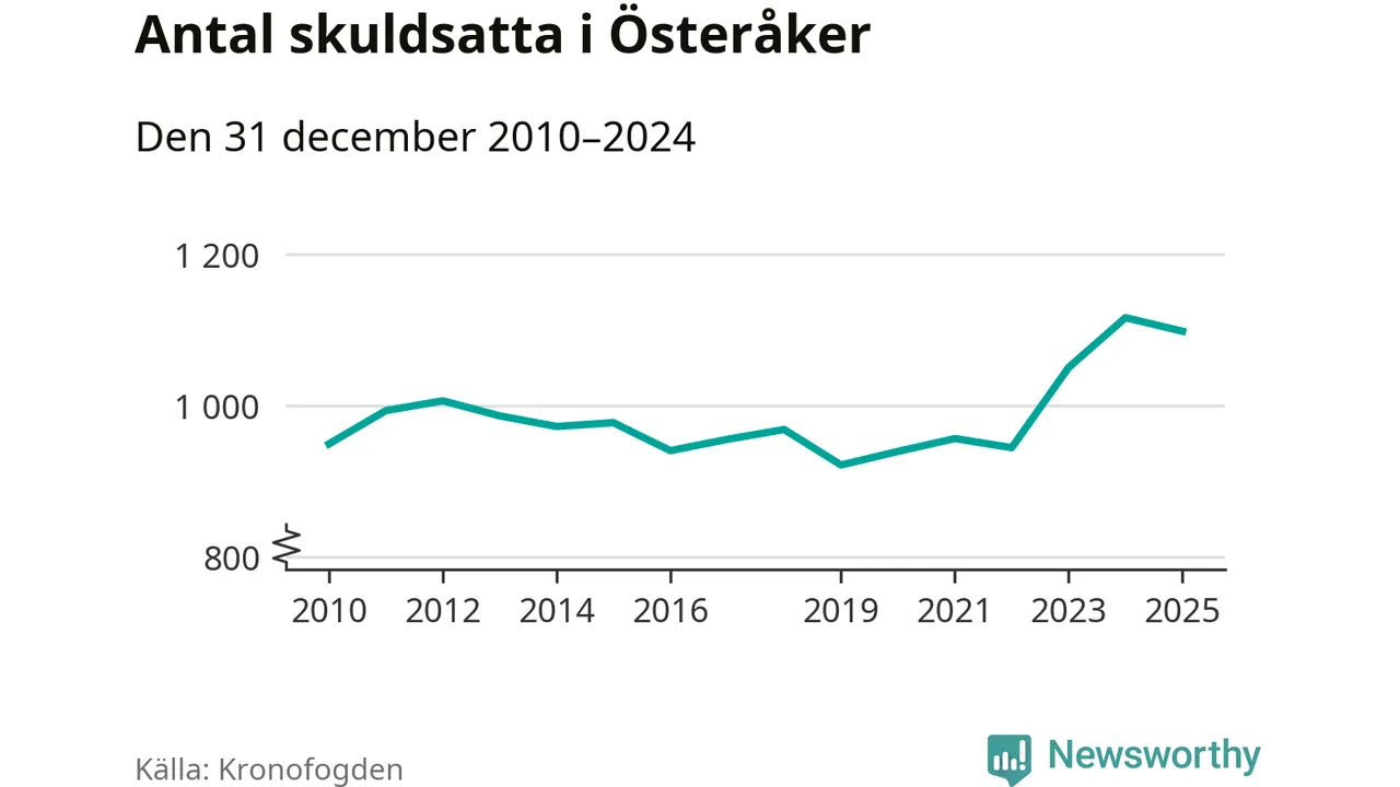 Vid årskiftet var 3 procent av alla Österåkersbor över 18 år registrerade hos Kronofogden. Störst andel skuldsatta i länet finns i Botkyrka (6 procent), medan den lägsta andelen finns i Danderyd (1 procent).