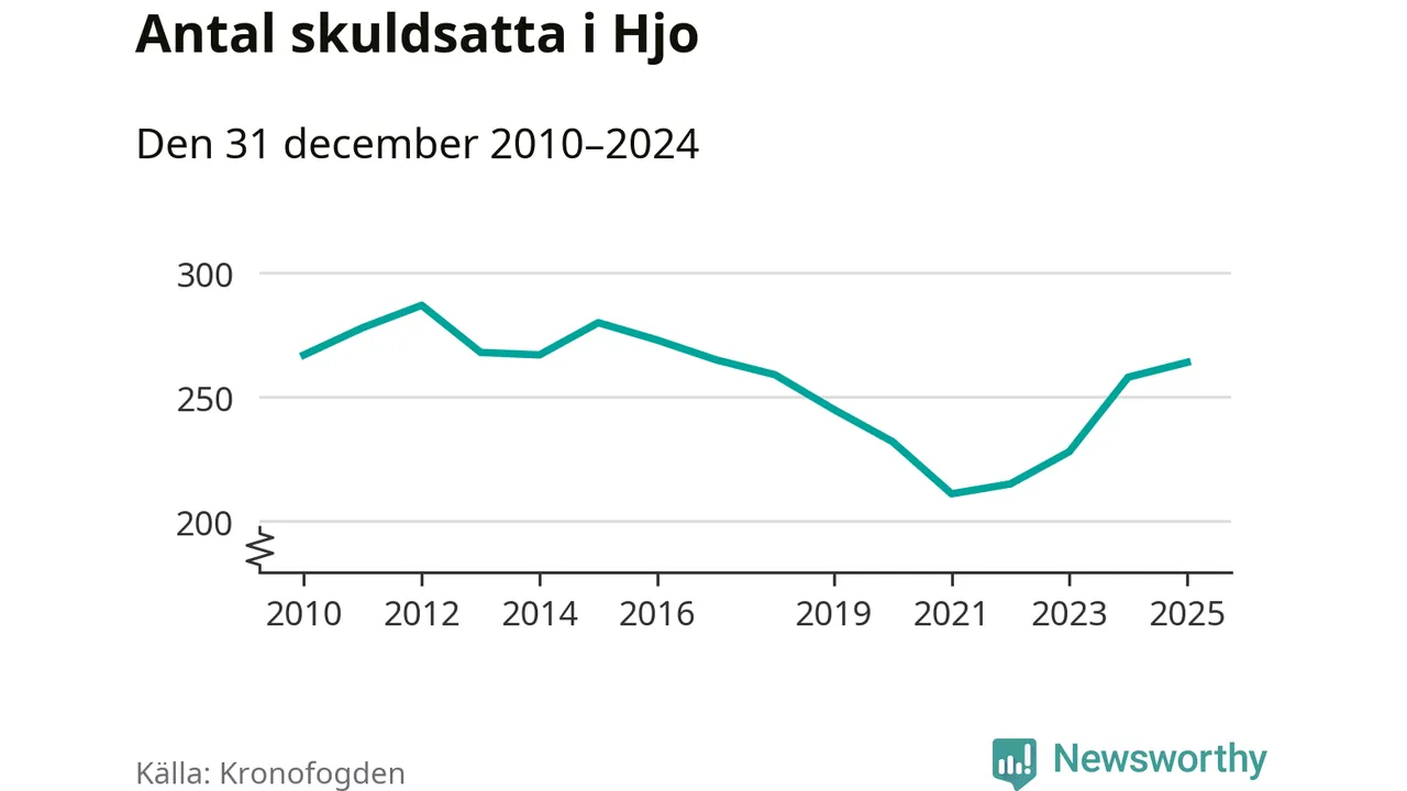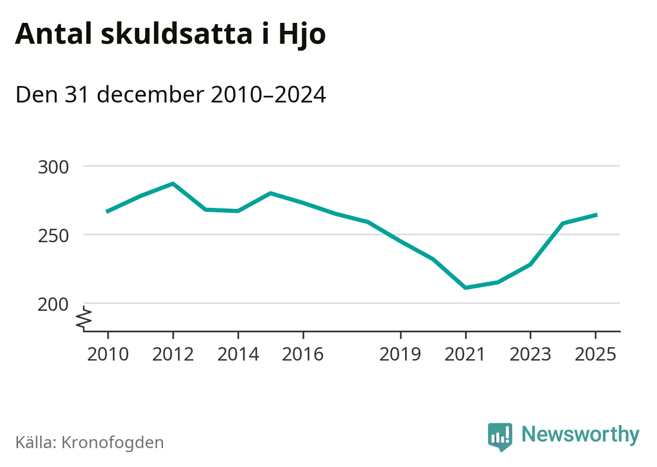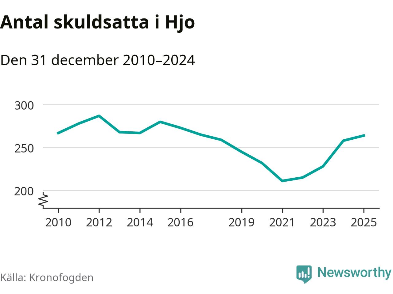 Allt fler Hjo­bor hamnar hos Kronofogden. Vid årskiftet var 264 invånare i kommunen skyldiga totalt 114,9 miljoner kronor. Det är en ökning med sex personer jämfört med året innan. Det är det högsta antalet sedan 2017.