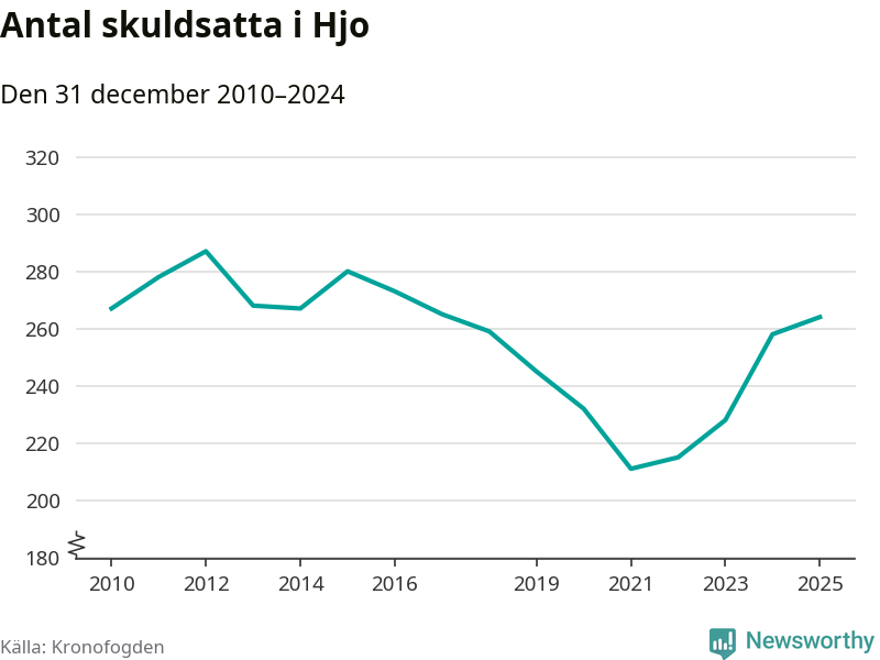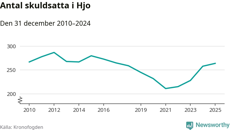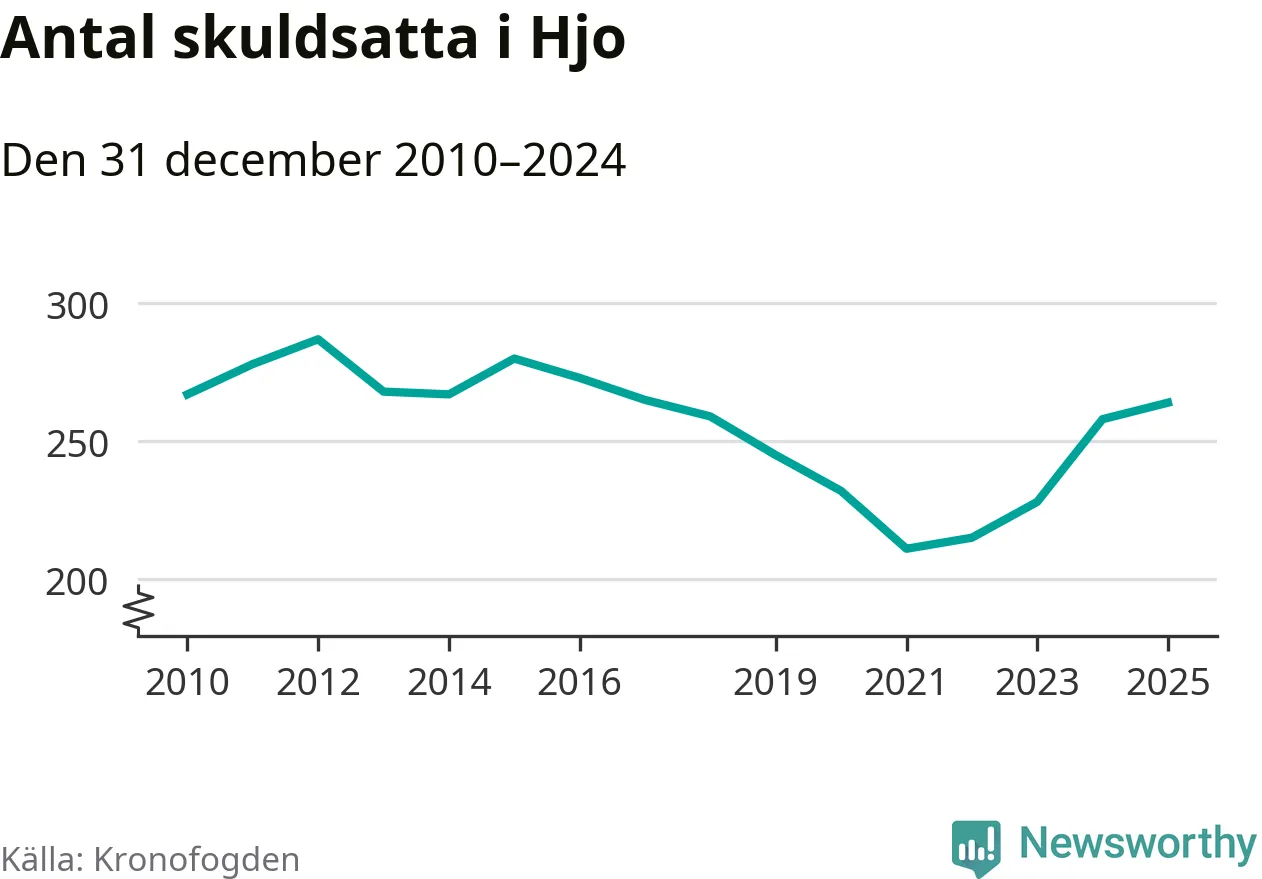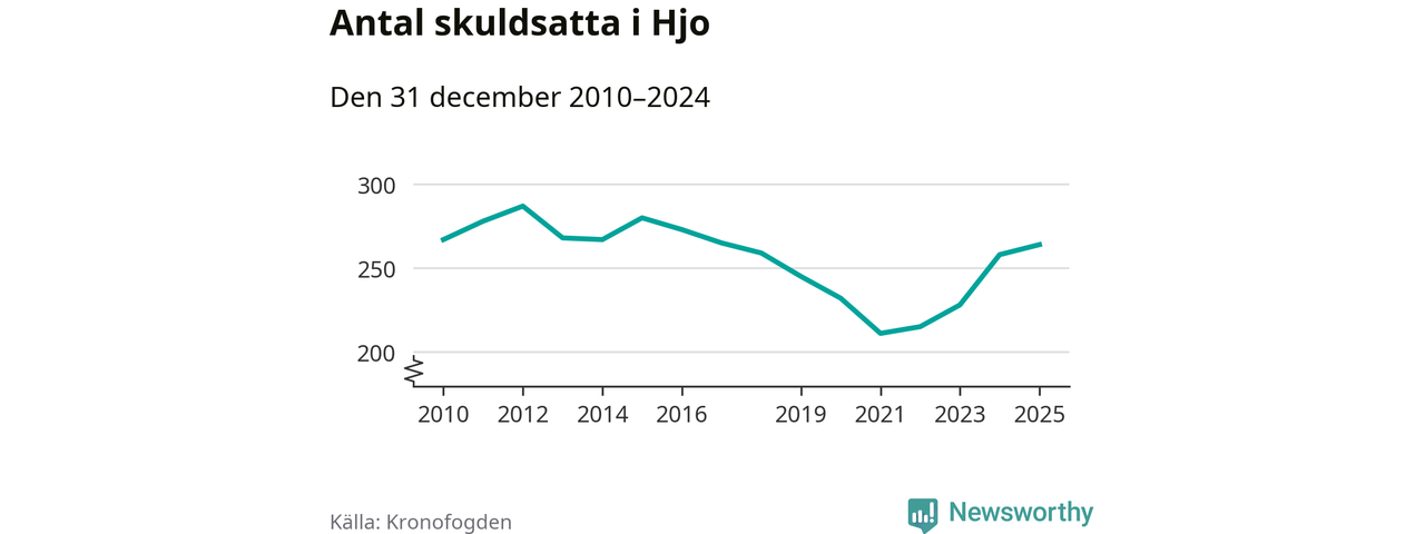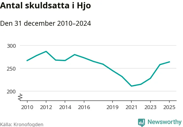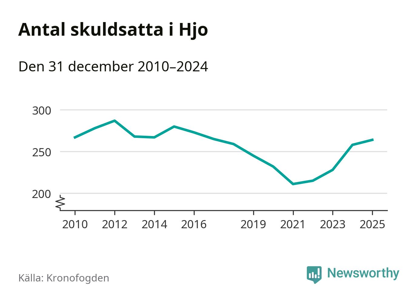 Allt fler Hjo­bor hamnar hos Kronofogden. Vid årskiftet var 264 invånare i kommunen skyldiga totalt 114,9 miljoner kronor. Det är en ökning med sex personer jämfört med året innan. Det är det högsta antalet sedan 2017.