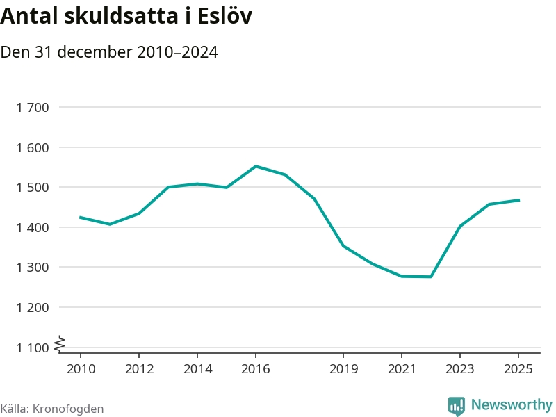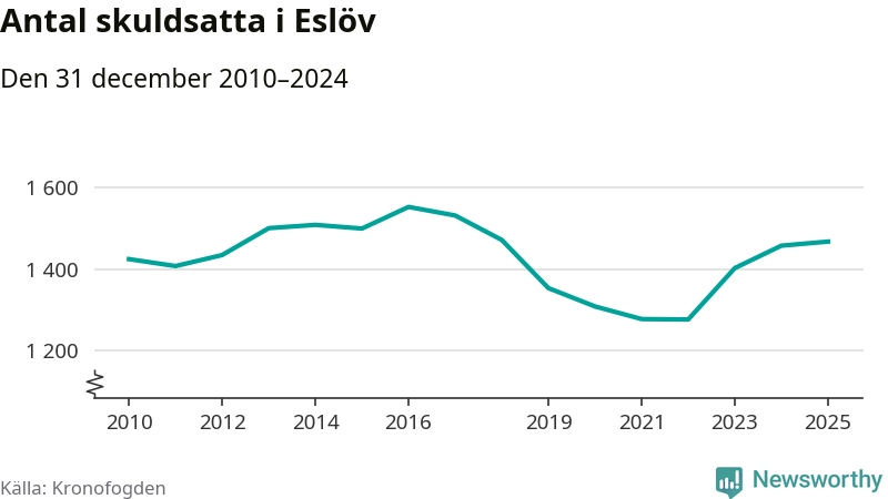 Inte sedan år 2018 har lika många Eslövs­bor varit registrerade hos Kronofogden. Listan toppas av en 34-årig kvinna.