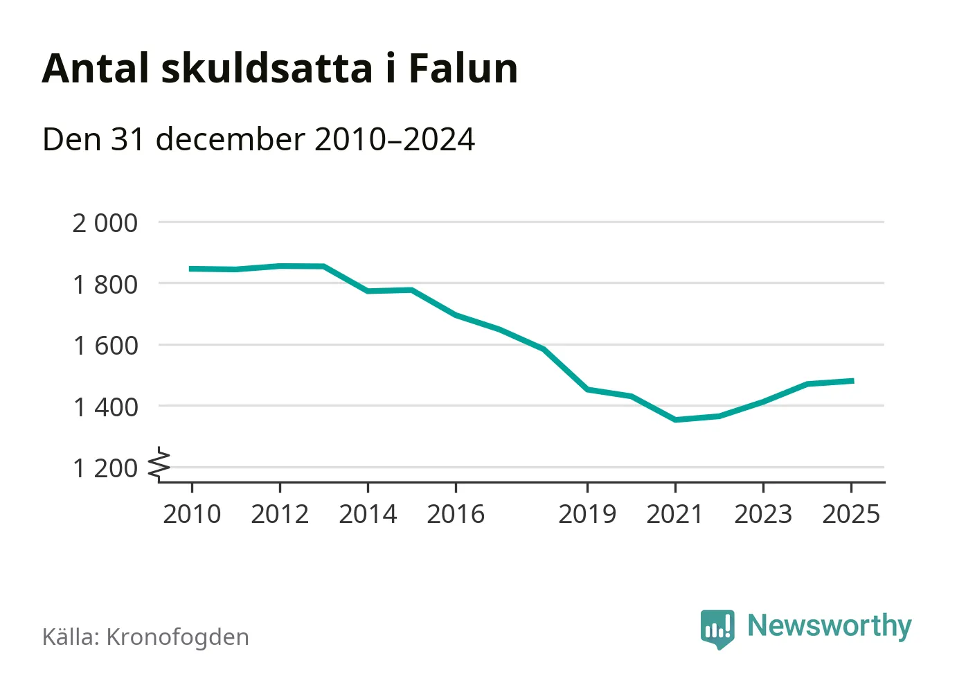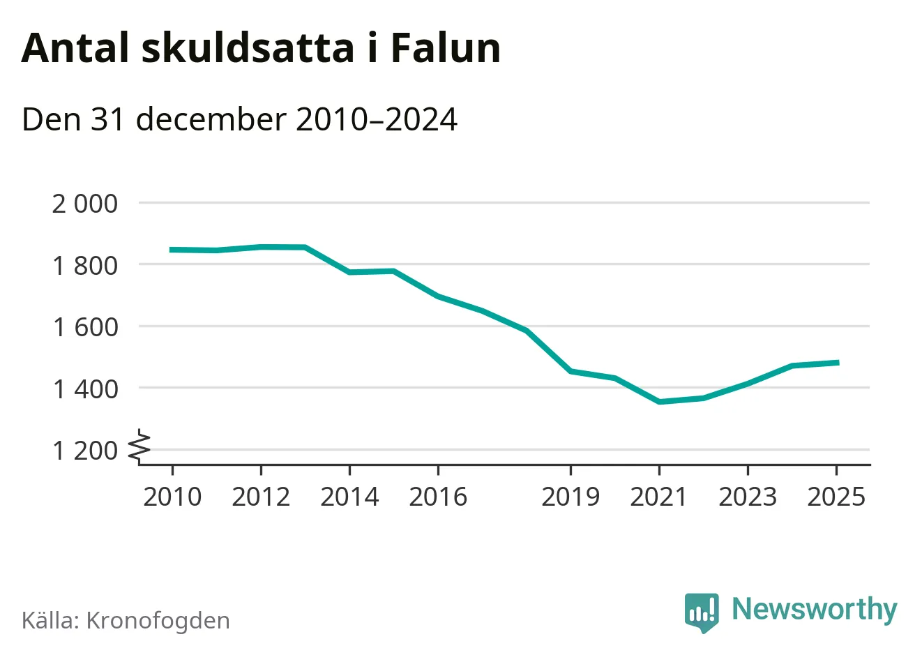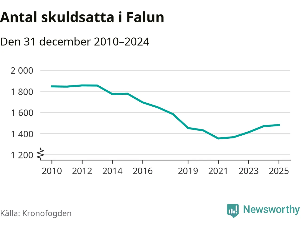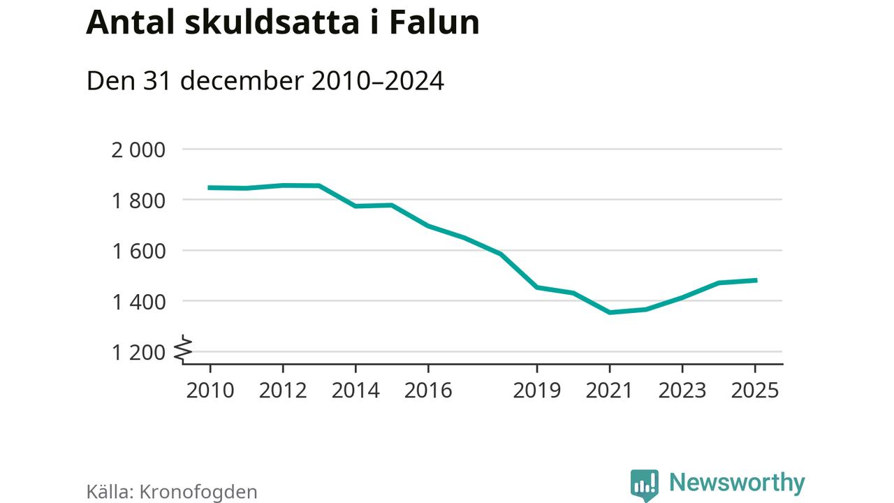 Vid årskiftet var 3 procent av alla Falu­bor över 18 år registrerade hos Kronofogden. Störst andel skuldsatta i länet finns i Hedemora (5 procent), medan den lägsta andelen finns i Gagnef (3 procent).