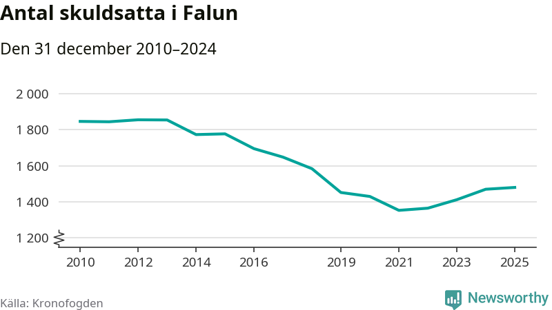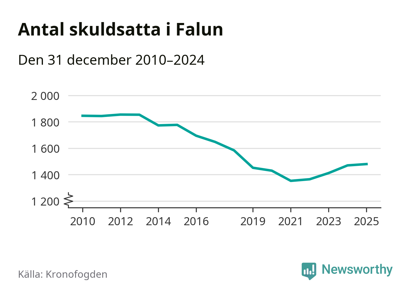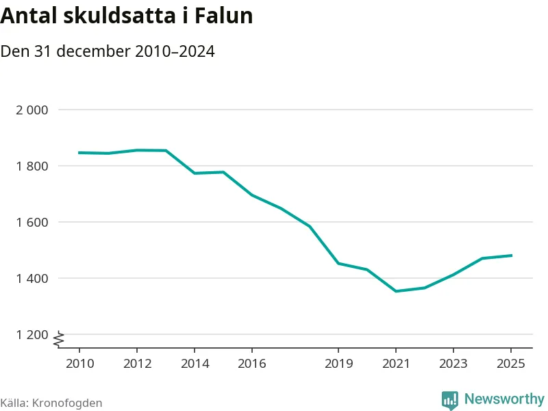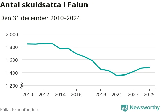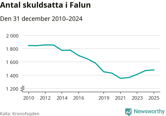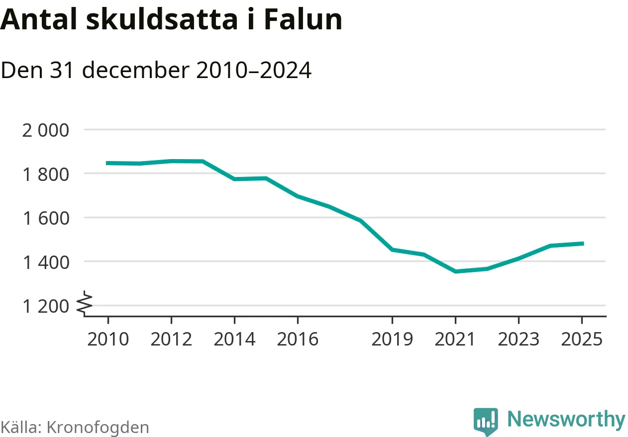 Vid årskiftet var 3 procent av alla Falu­bor över 18 år registrerade hos Kronofogden. Störst andel skuldsatta i länet finns i Hedemora (5 procent), medan den lägsta andelen finns i Gagnef (3 procent).