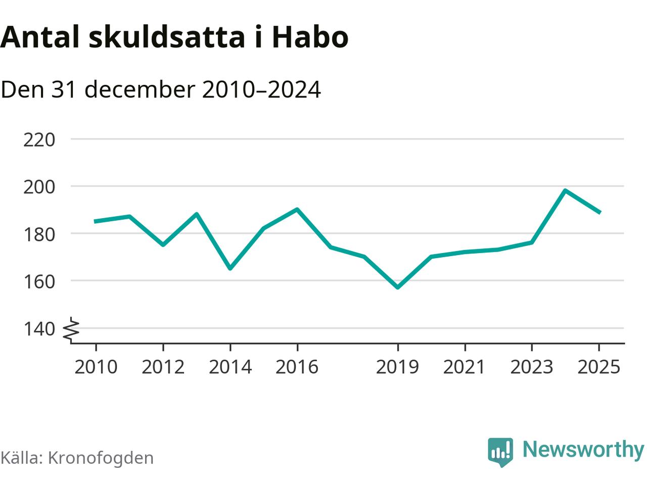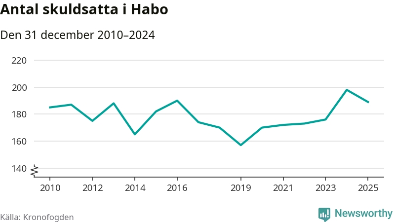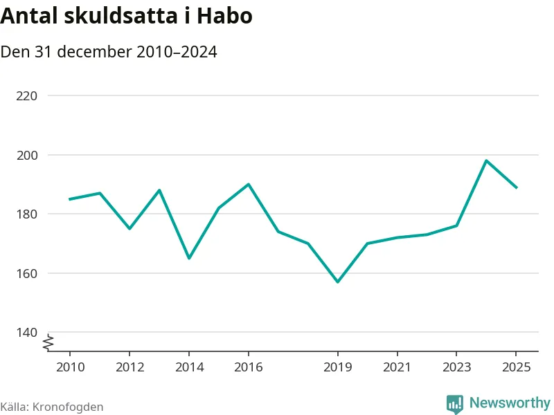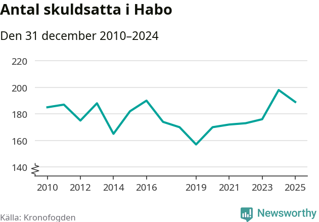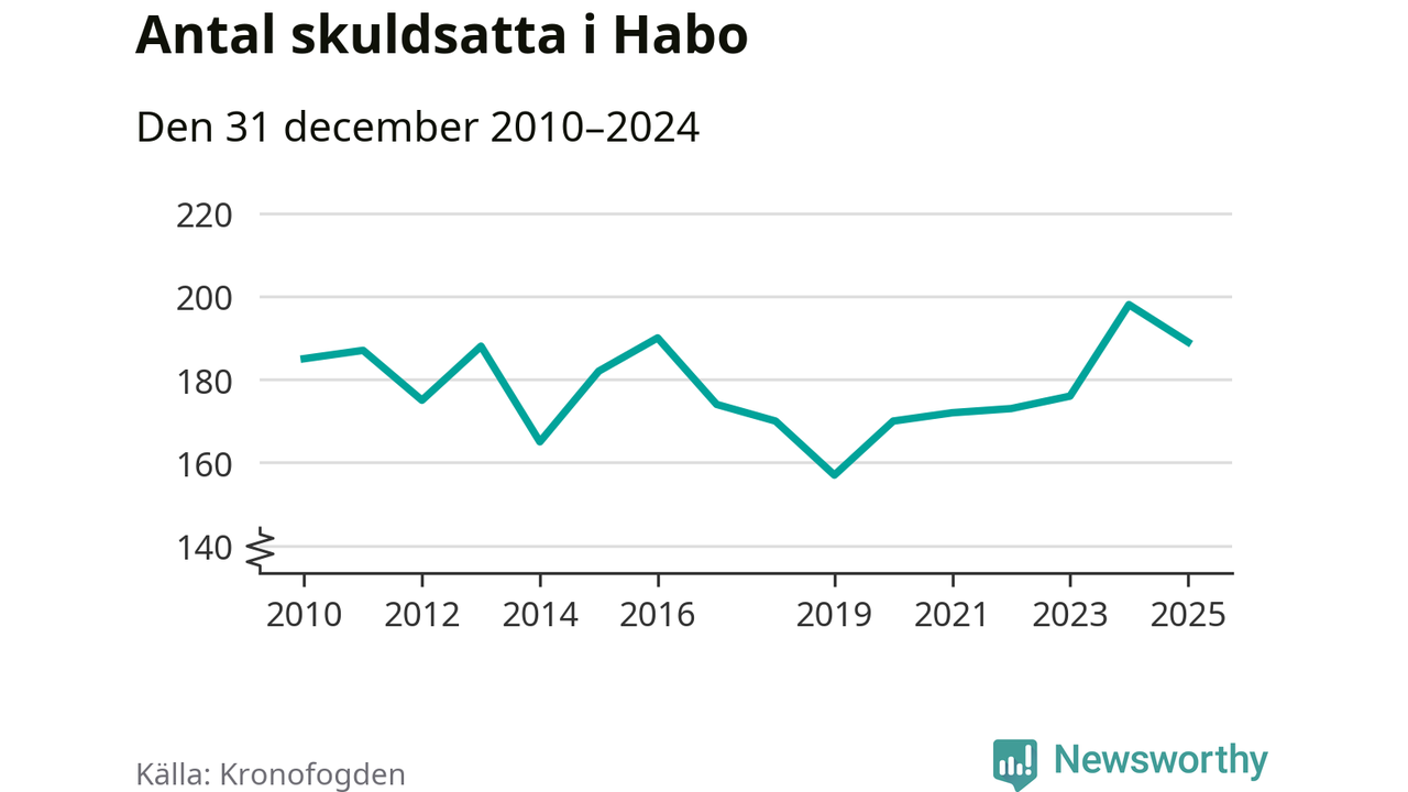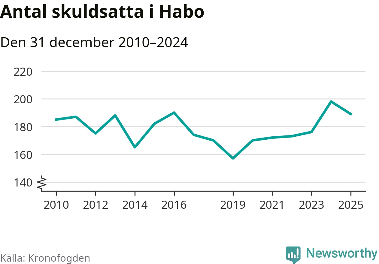 Vid årskiftet var 2 procent av alla Habobor över 18 år registrerade hos Kronofogden. Det är den femte lägsta andelen av alla kommuner i hela Sverige och den lägsta andelen i Jönköpings län. Störst andel skuldsatta i länet finns i Nässjö (5 procent).