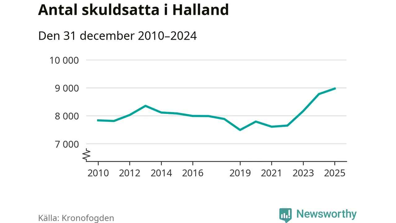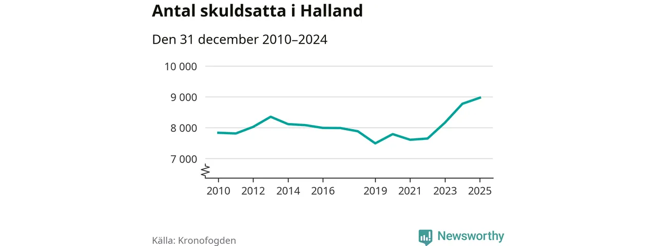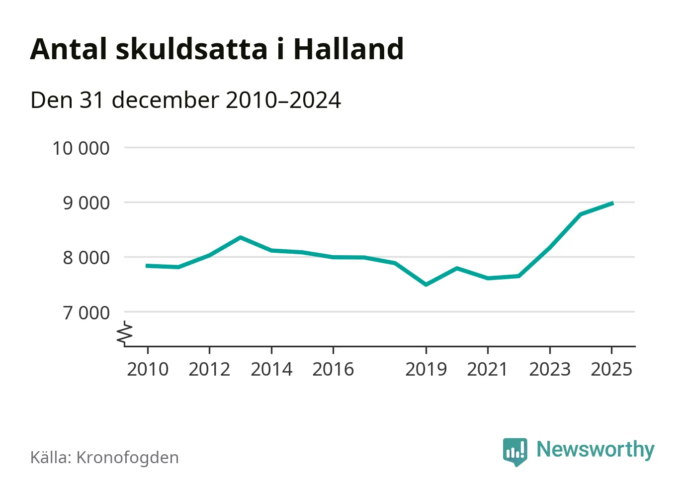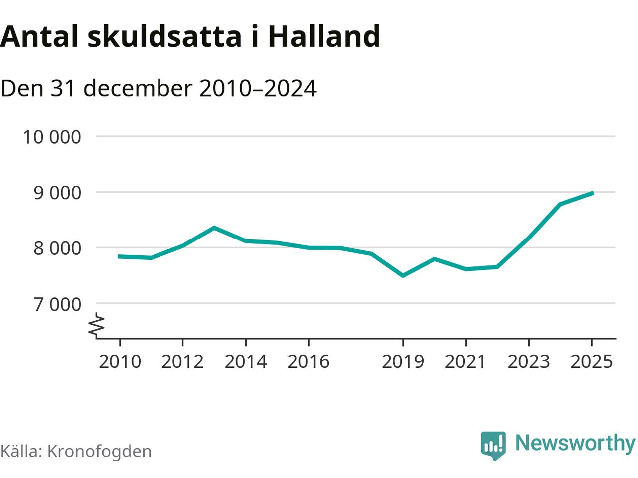 Inte sedan åtminstone 2010 har så många hallänningar hamnat hos Kronofogden. Vid årskiftet var 8 969 invånare i länet skyldiga totalt 3,4 miljarder kronor. Det är en ökning med 196 personer – eller 2 procent – jämfört med året innan.