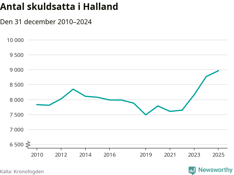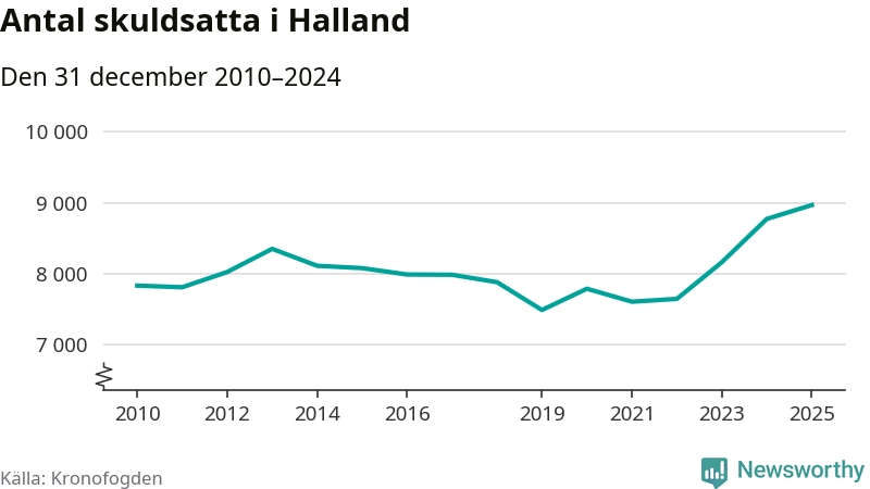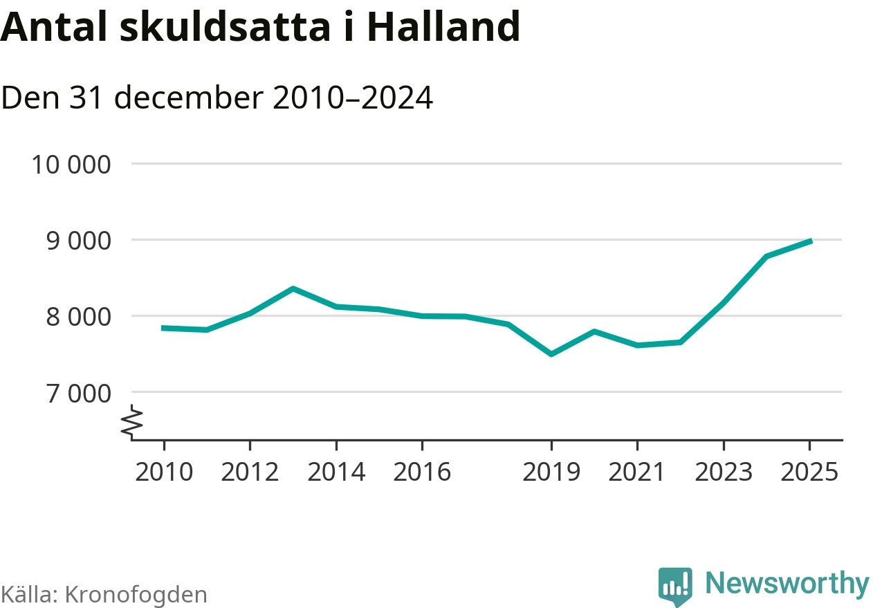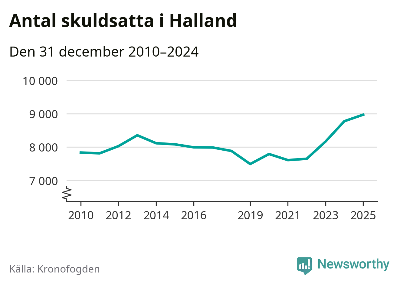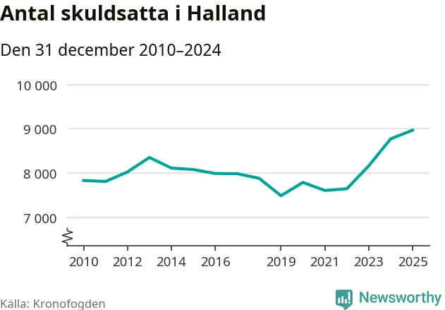 Inte sedan åtminstone 2010 har så många hallänningar hamnat hos Kronofogden. Vid årskiftet var 8 969 invånare i länet skyldiga totalt 3,4 miljarder kronor. Det är en ökning med 196 personer – eller 2 procent – jämfört med året innan.