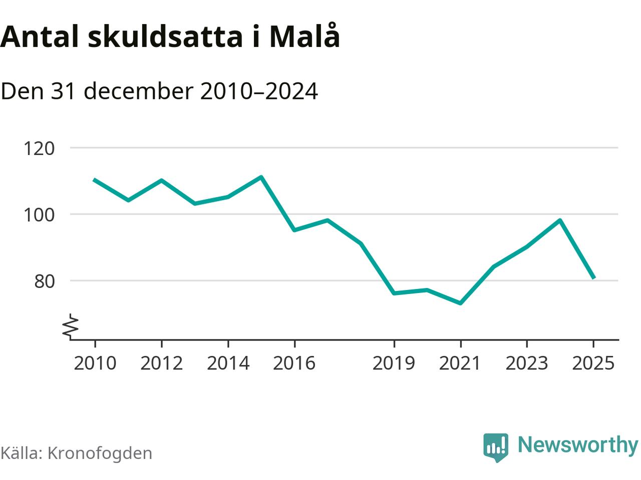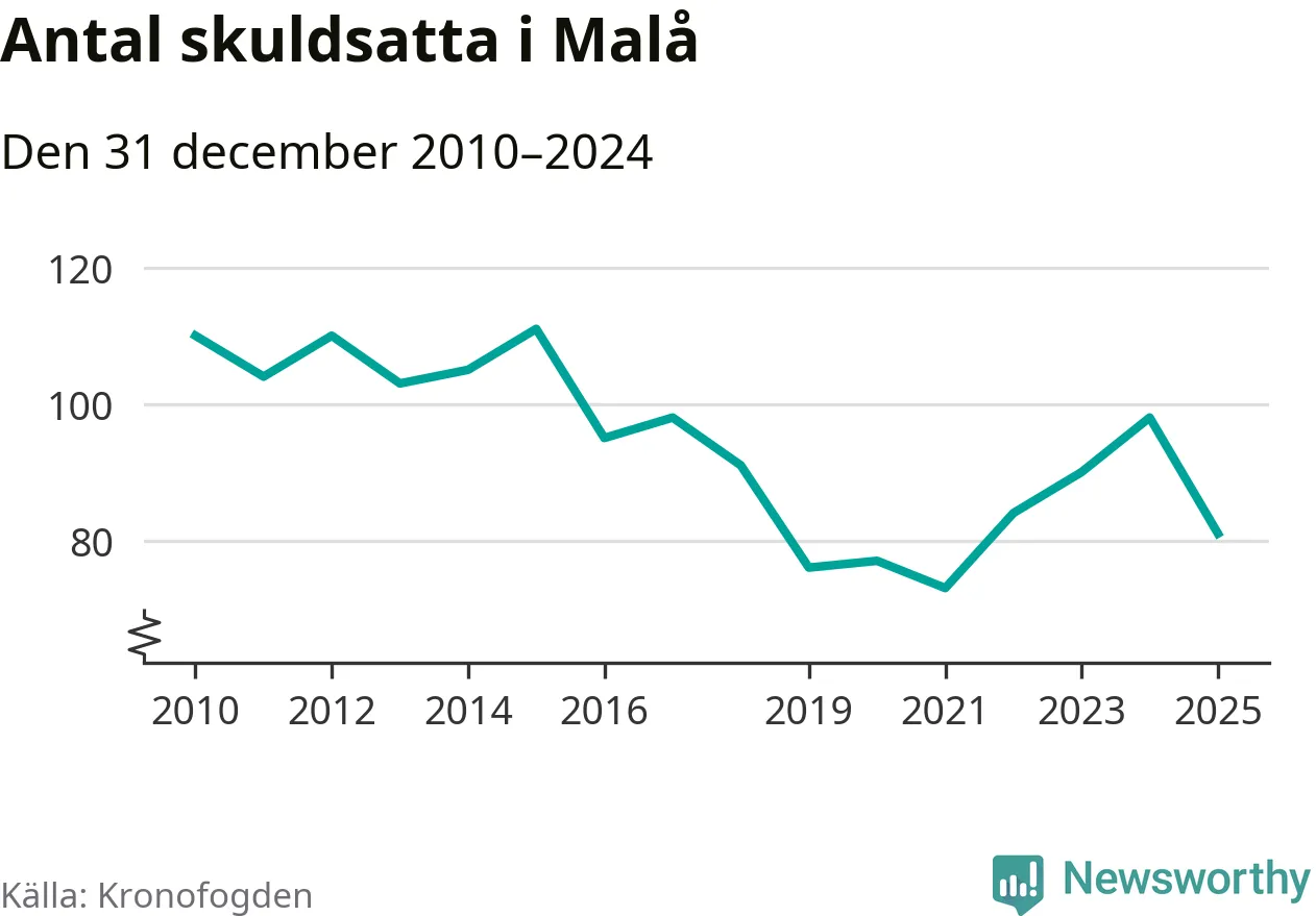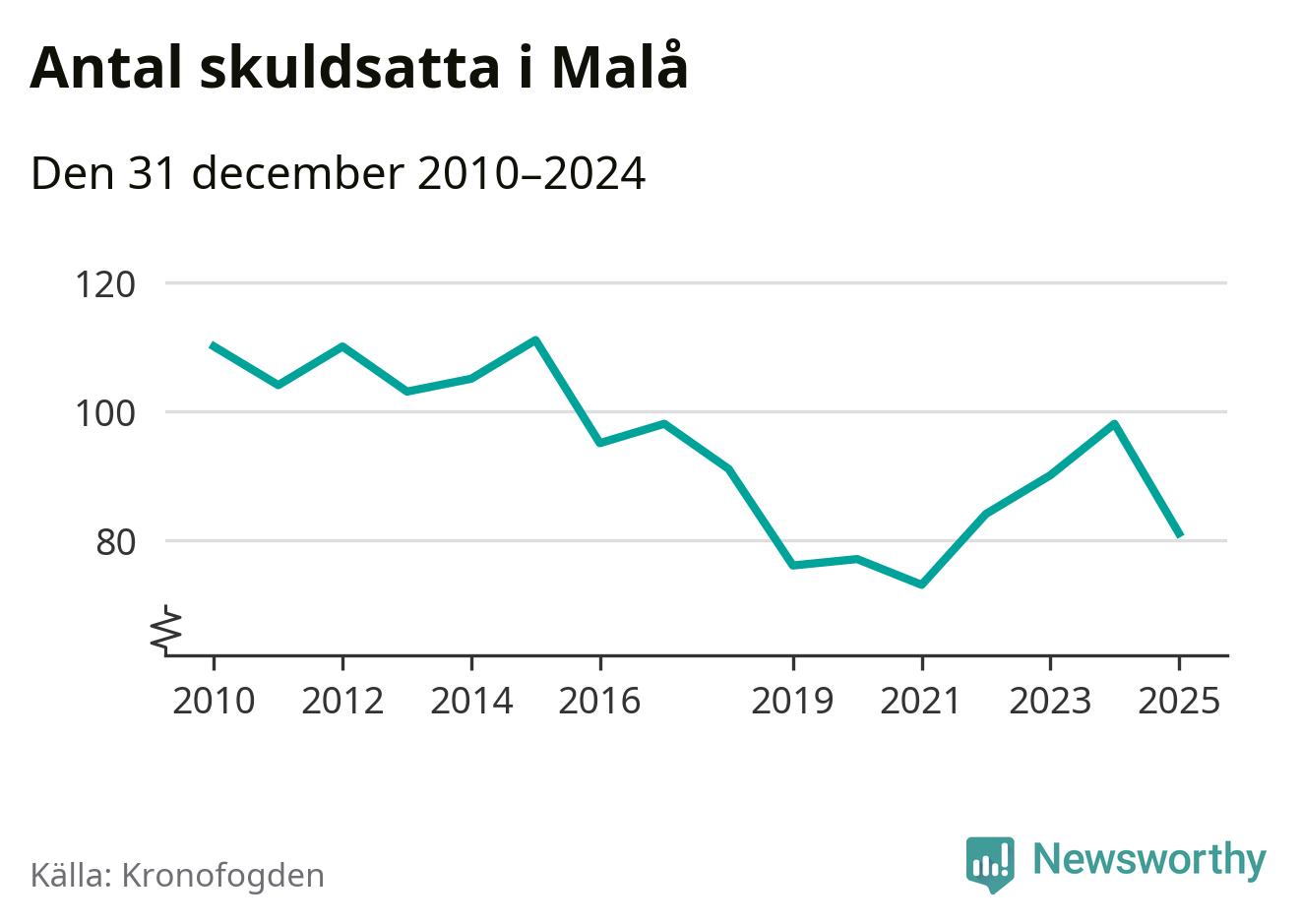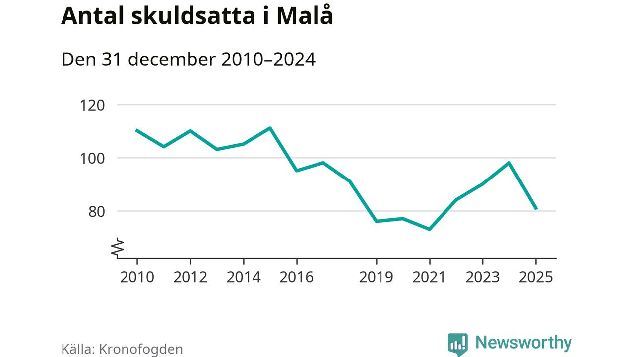 Antalet Malå­bor hos Kronofogden minskade i fjol. Vid årskiftet var 81 invånare i kommunen skyldiga totalt 29,7 miljoner kronor. Det är en minskning med 17 personer – eller 17 procent – jämfört med året innan.