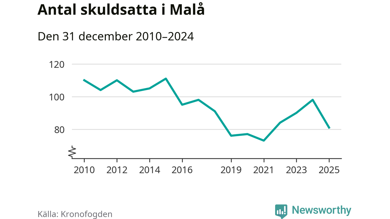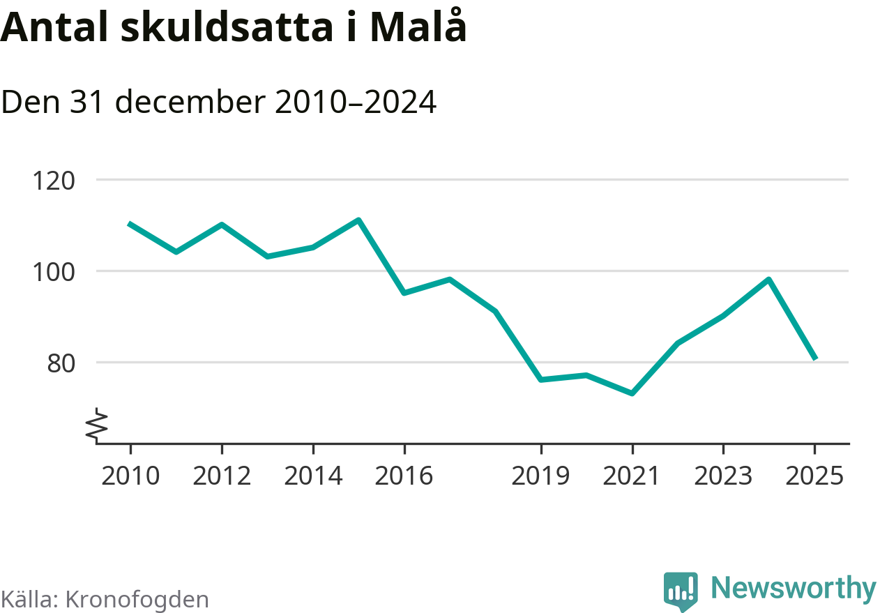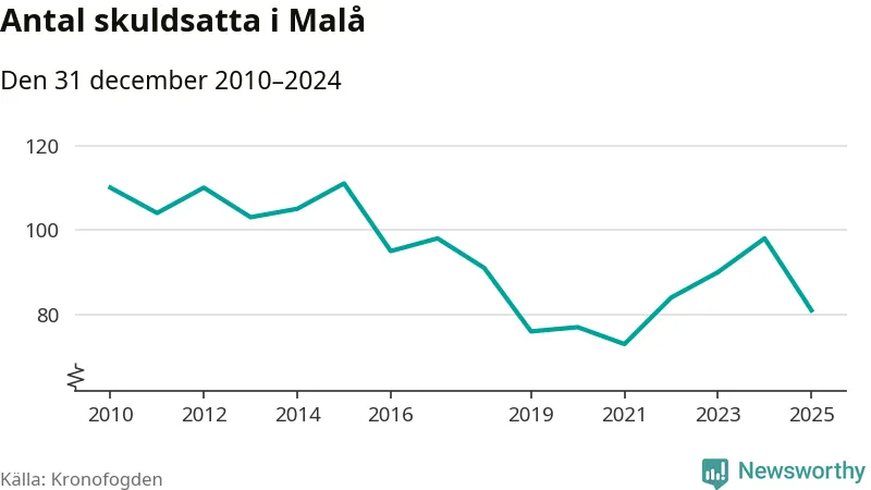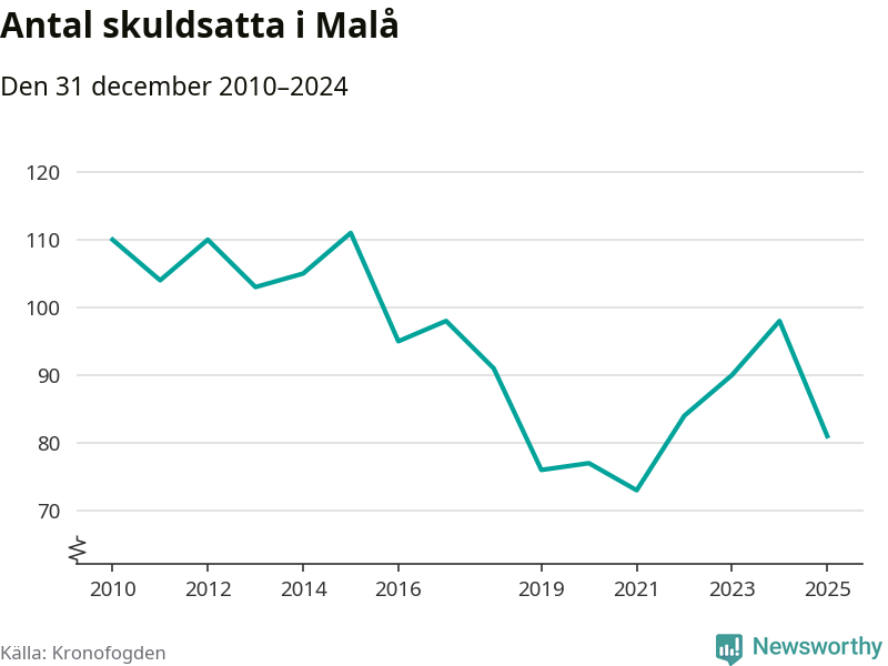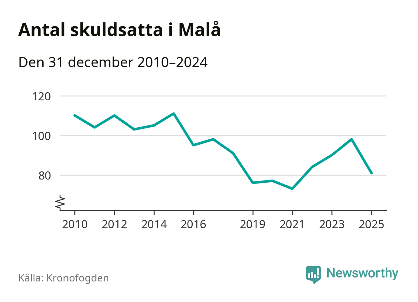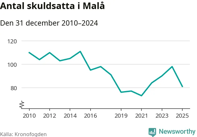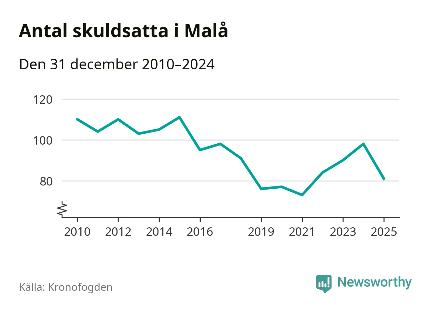 Antalet Malå­bor hos Kronofogden minskade i fjol. Vid årskiftet var 81 invånare i kommunen skyldiga totalt 29,7 miljoner kronor. Det är en minskning med 17 personer – eller 17 procent – jämfört med året innan.