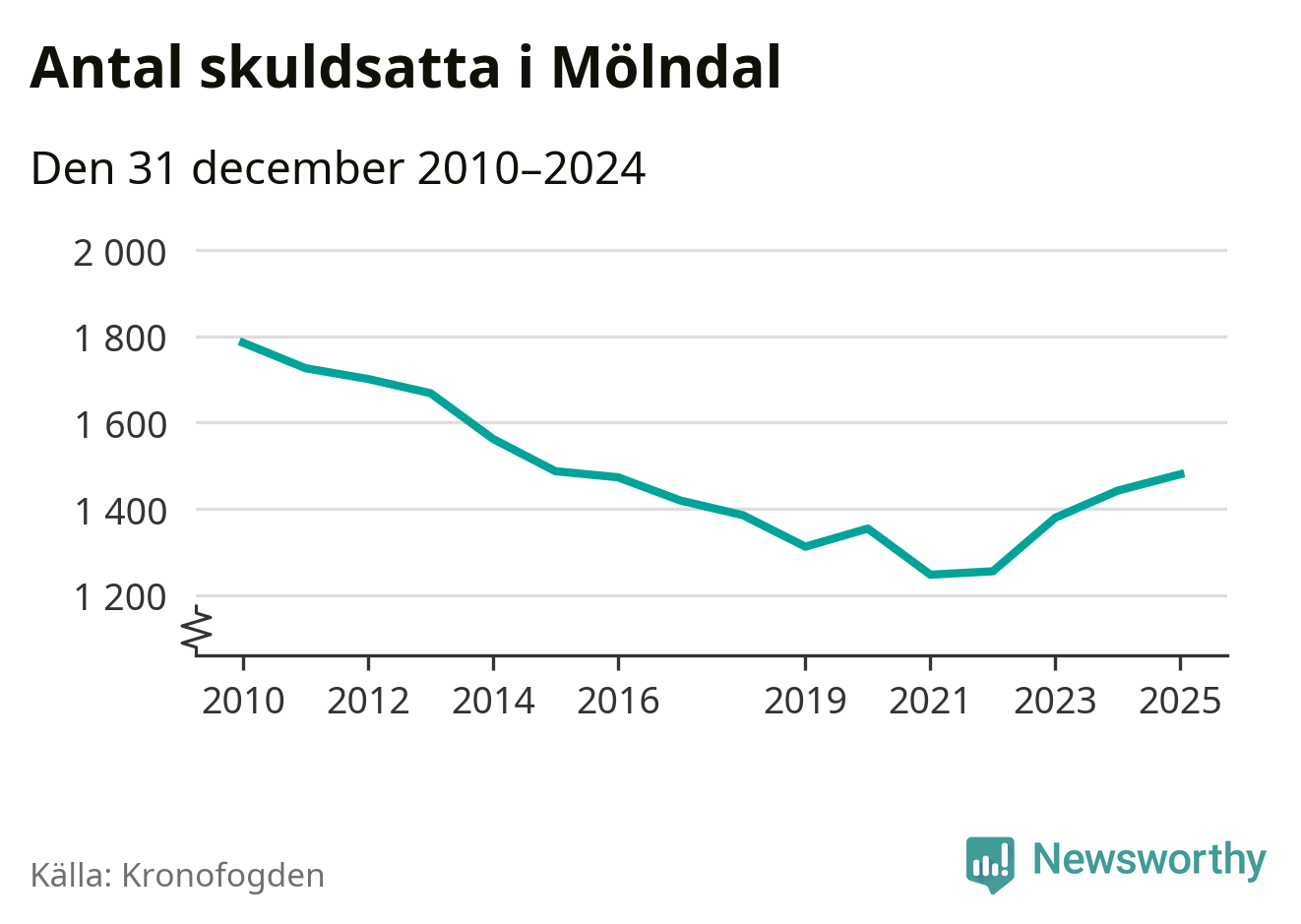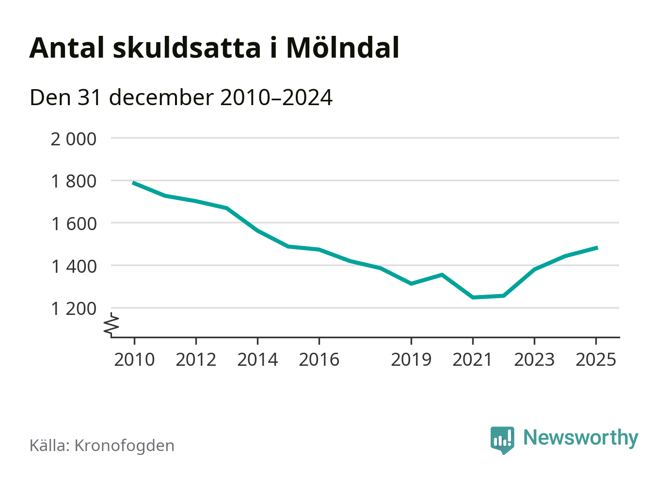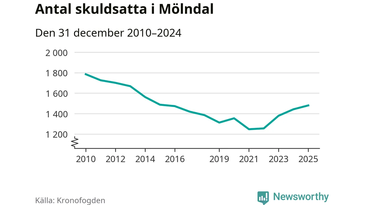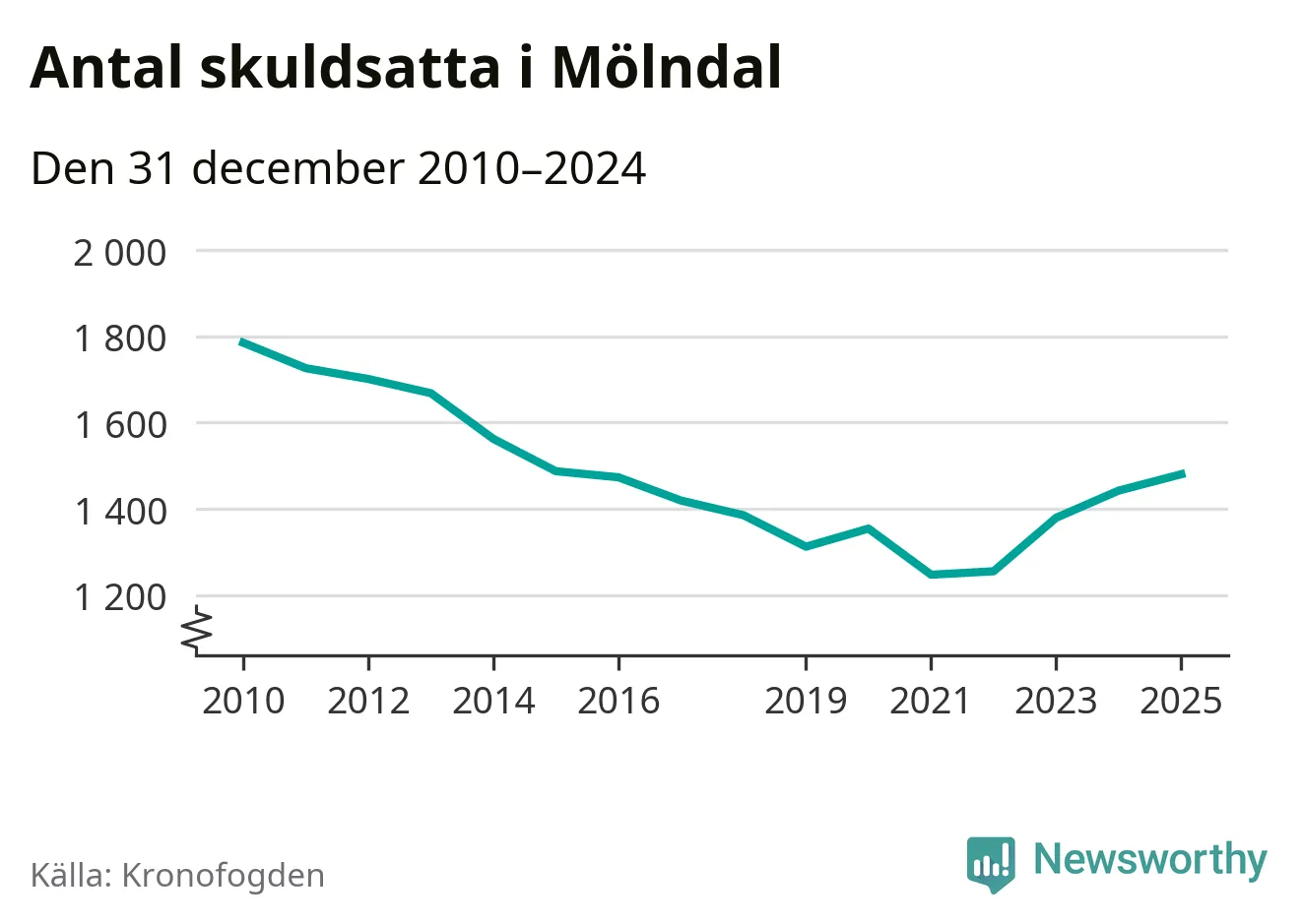 Allt fler Mölndalsbor hamnar hos Kronofogden. Vid årskiftet var 1 480 invånare i kommunen skyldiga totalt 1,6 miljarder kronor. Det är en ökning med 38 personer – eller 3 procent – jämfört med året innan. Det är det högsta antalet sedan 2015.