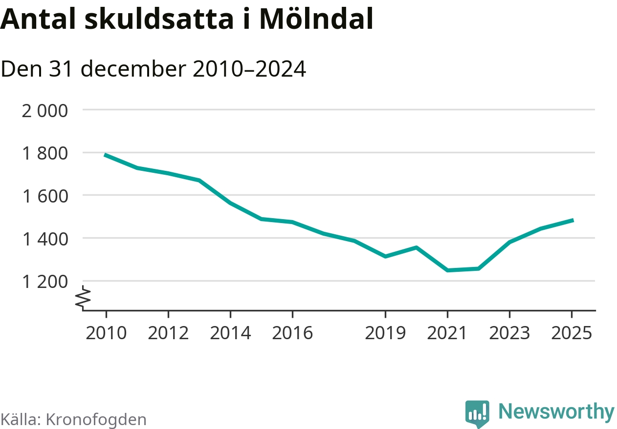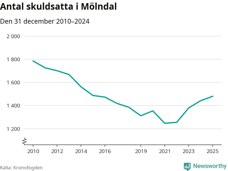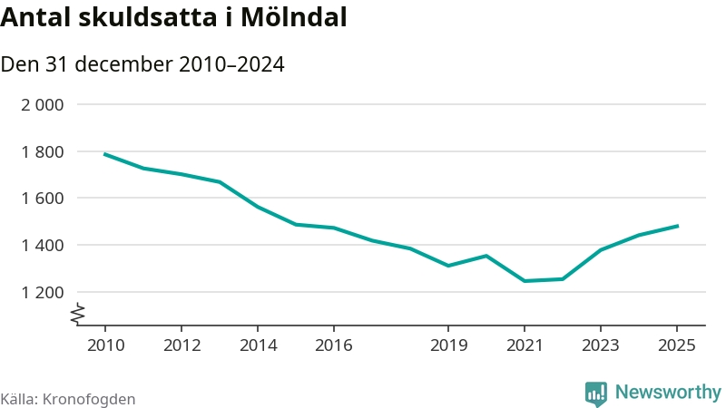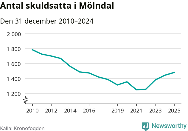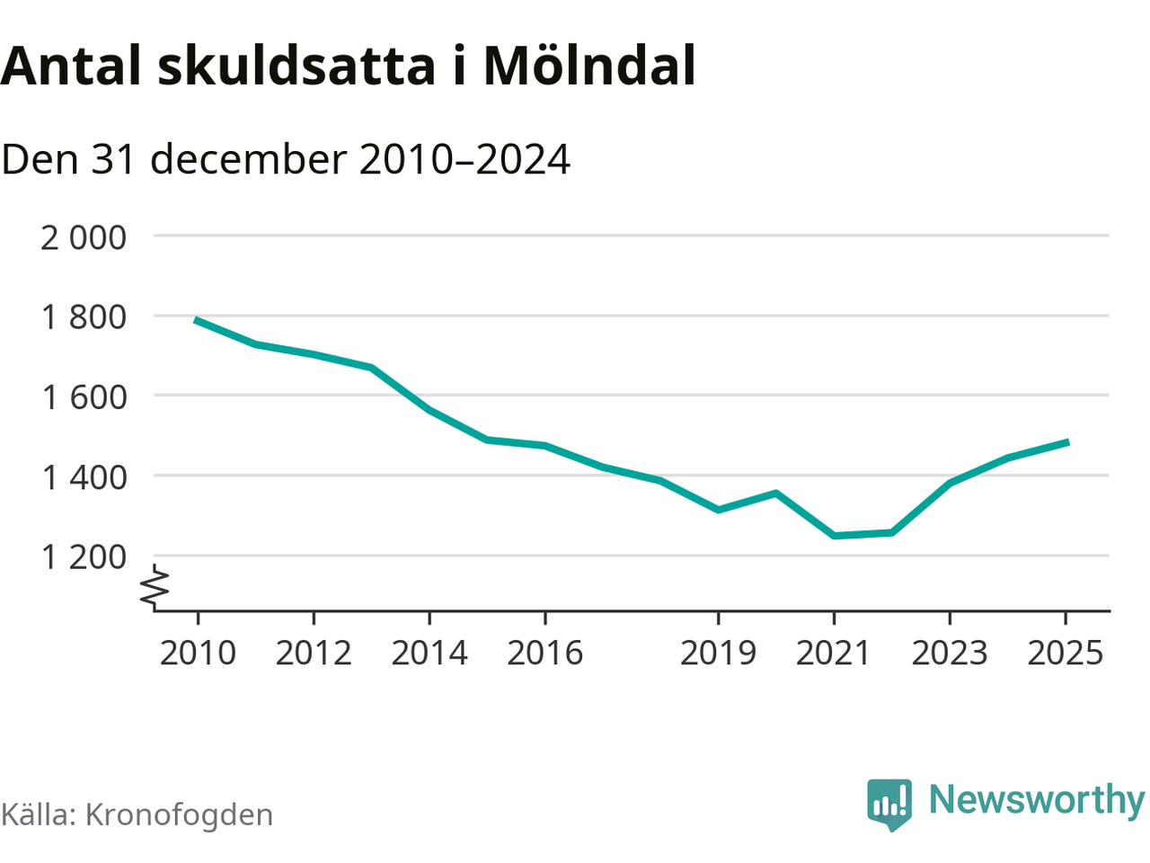 Allt fler Mölndalsbor hamnar hos Kronofogden. Vid årskiftet var 1 480 invånare i kommunen skyldiga totalt 1,6 miljarder kronor. Det är en ökning med 38 personer – eller 3 procent – jämfört med året innan. Det är det högsta antalet sedan 2015.
