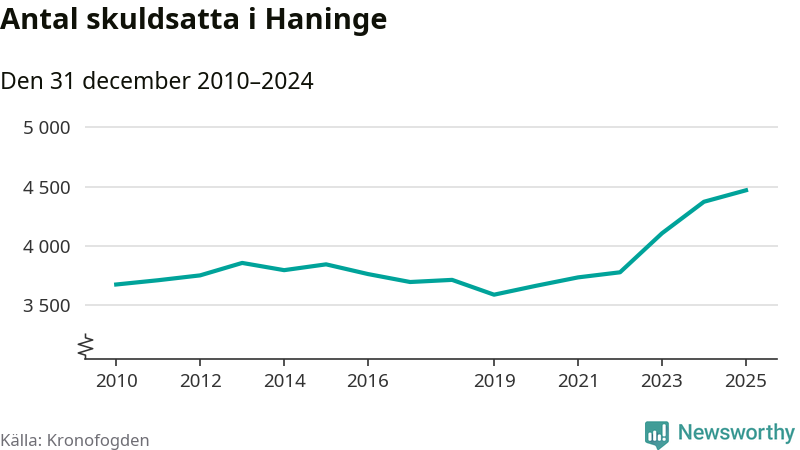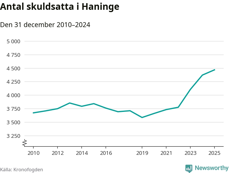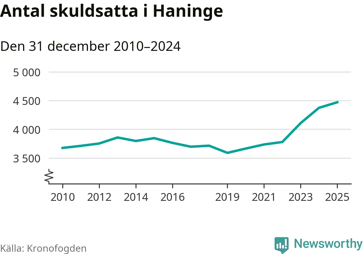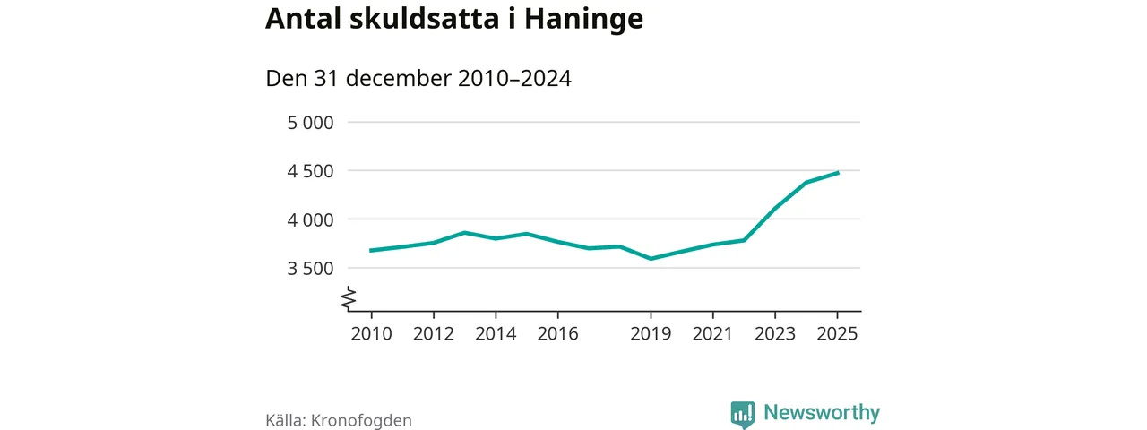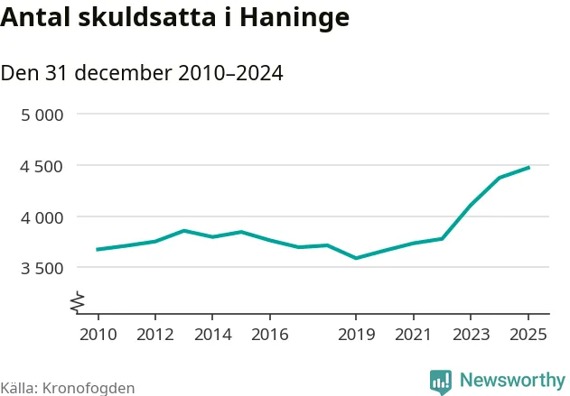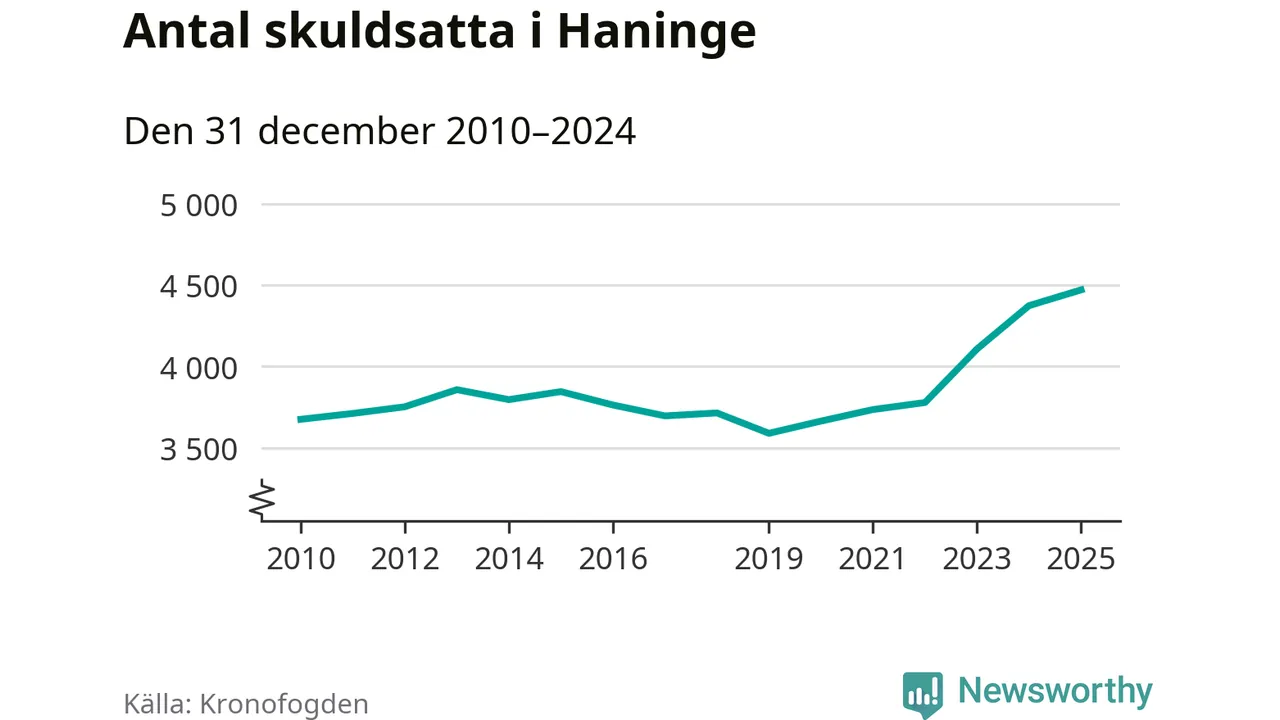 Inte sedan åtminstone 2010 har så många Haningebor hamnat hos Kronofogden. Vid årskiftet var 4 470 invånare i kommunen skyldiga totalt 1,8 miljarder kronor. Det är en ökning med 97 personer – eller 2 procent – jämfört med året innan.
