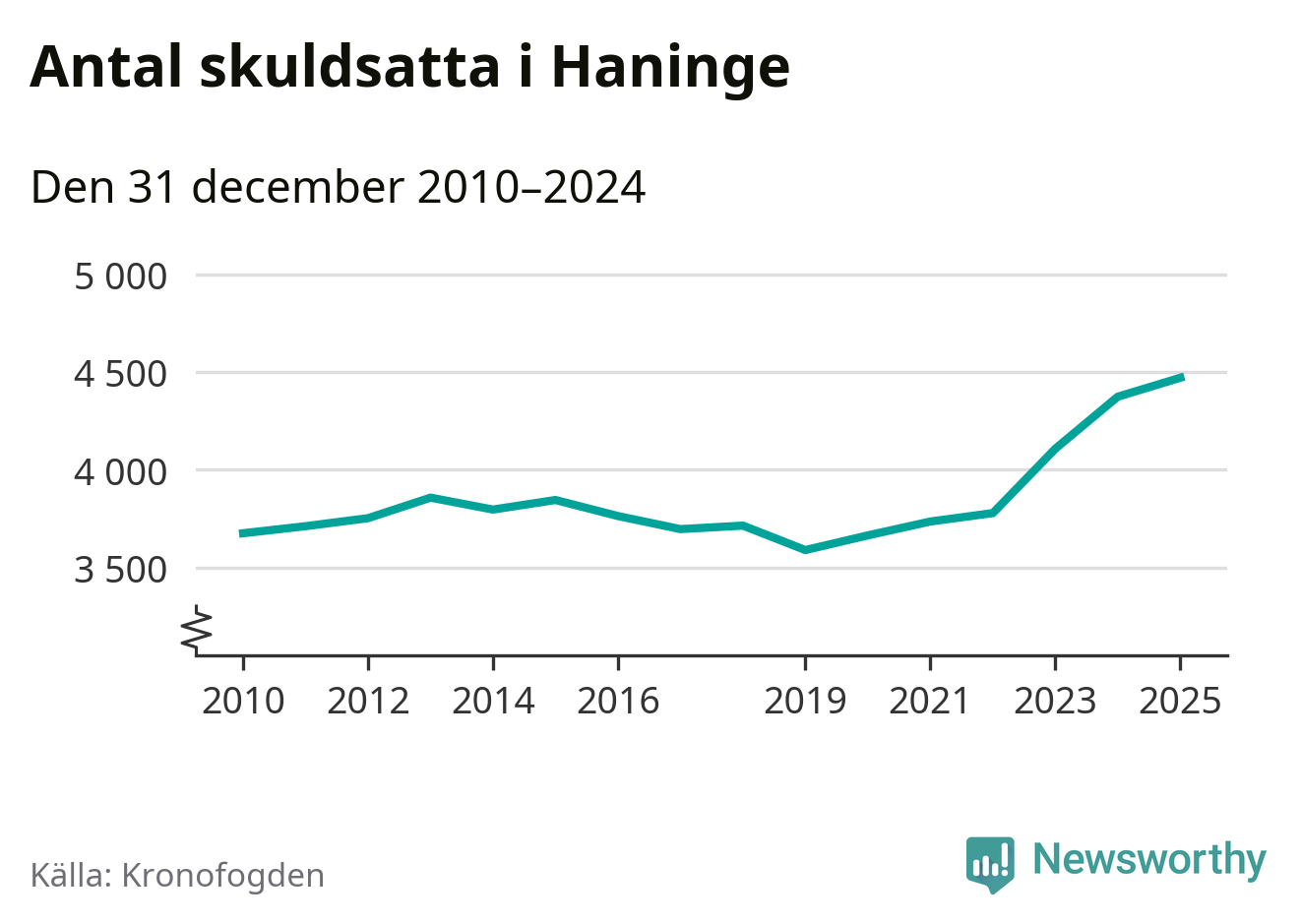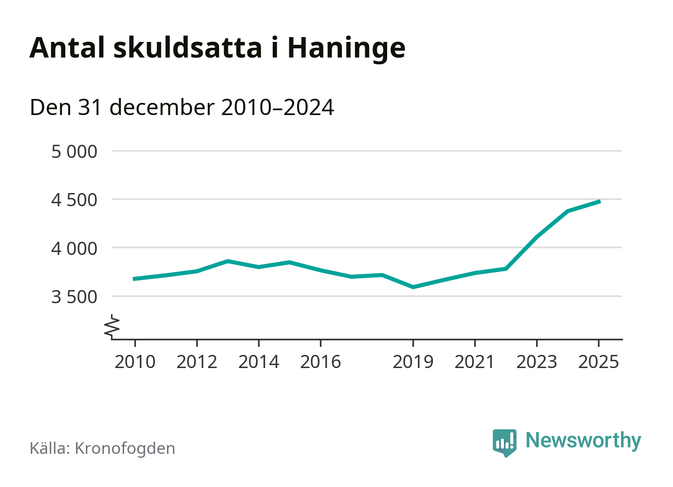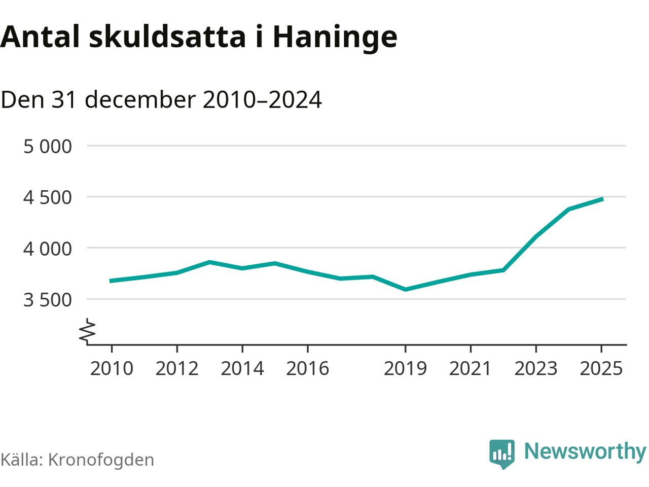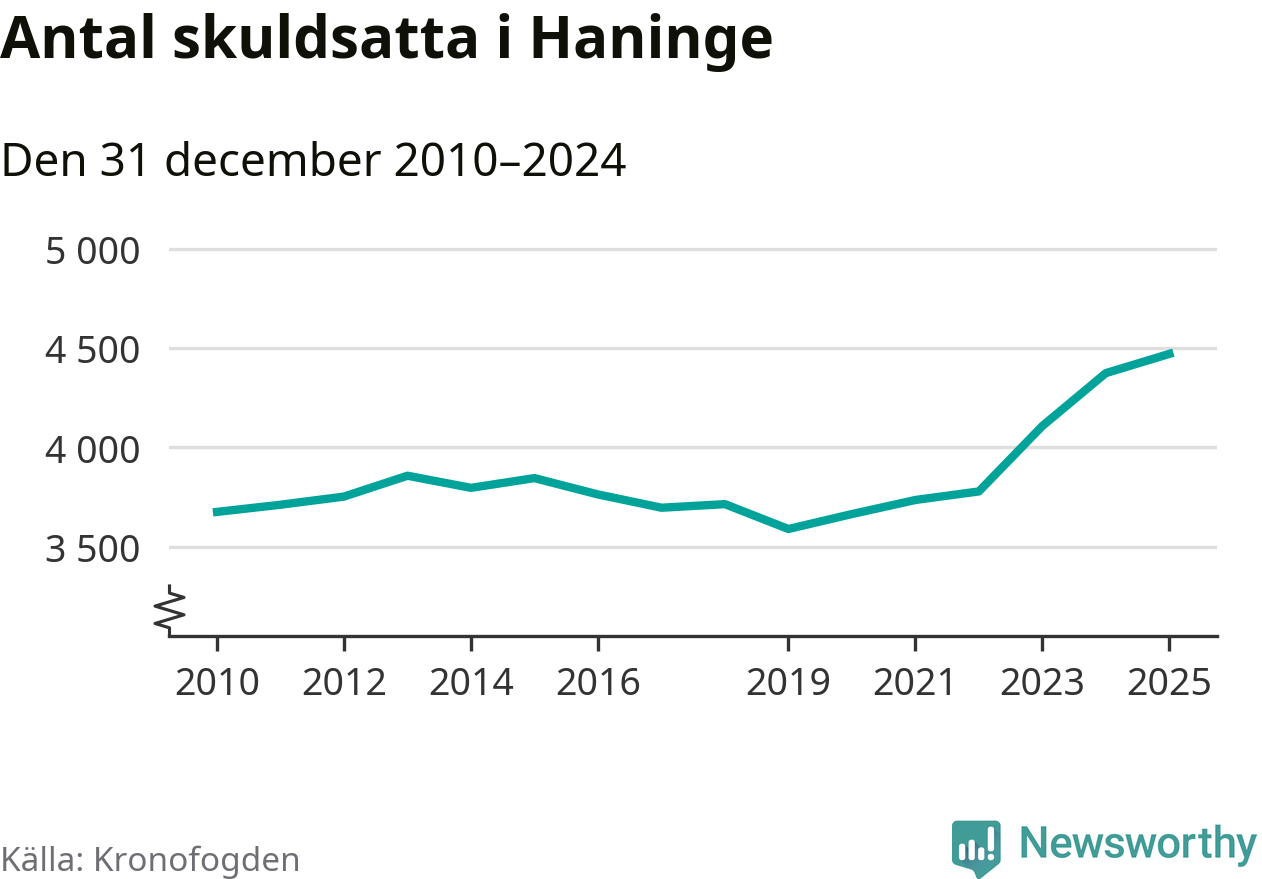 Inte sedan åtminstone 2010 har så många Haningebor hamnat hos Kronofogden. Vid årskiftet var 4 470 invånare i kommunen skyldiga totalt 1,8 miljarder kronor. Det är en ökning med 97 personer – eller 2 procent – jämfört med året innan.