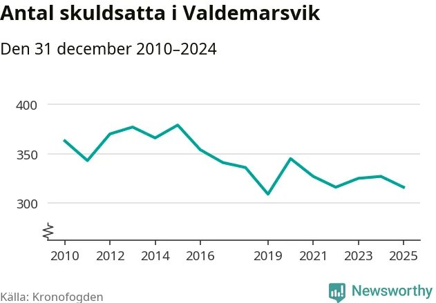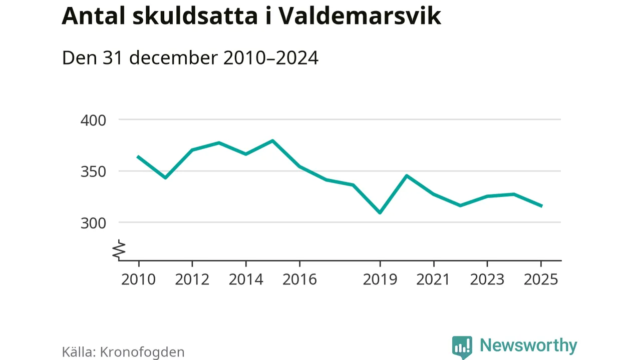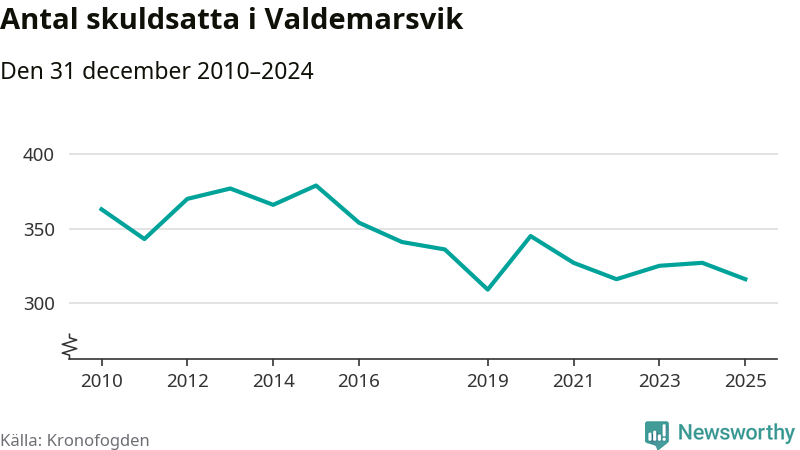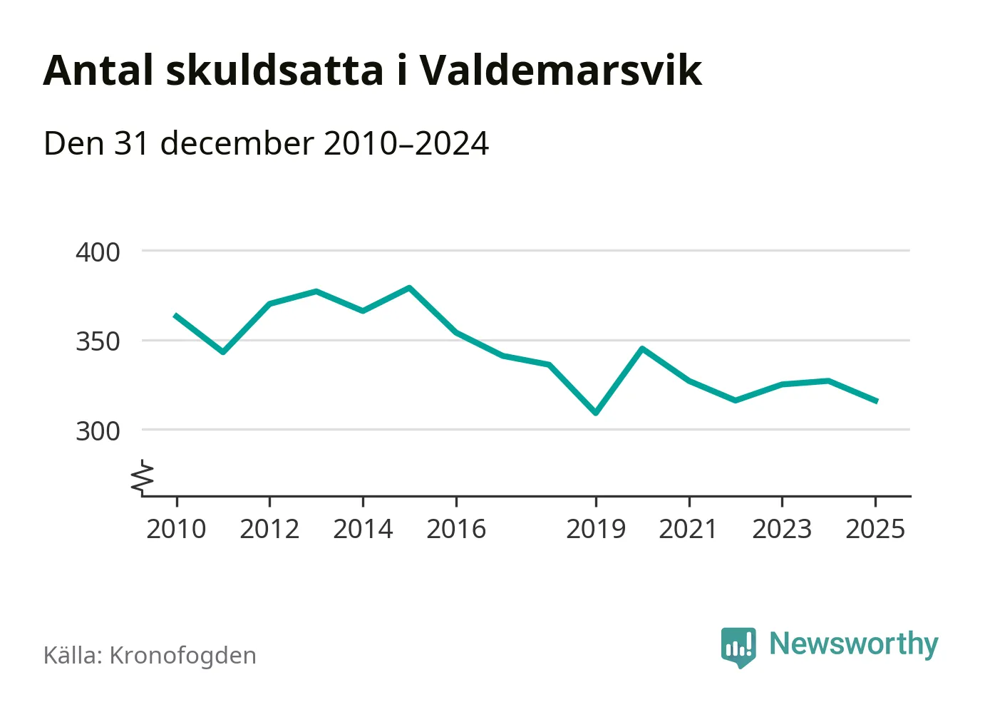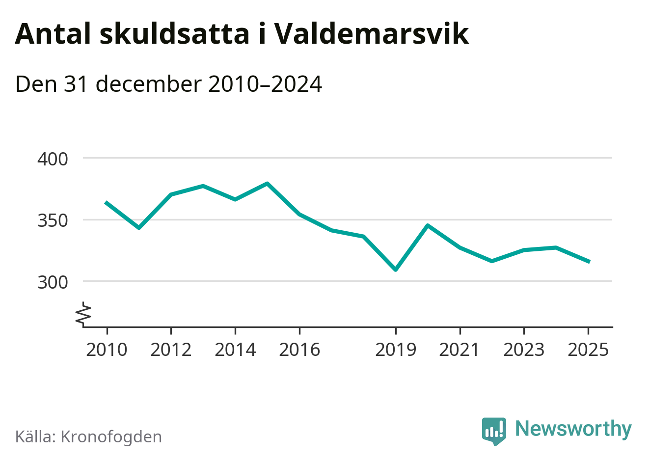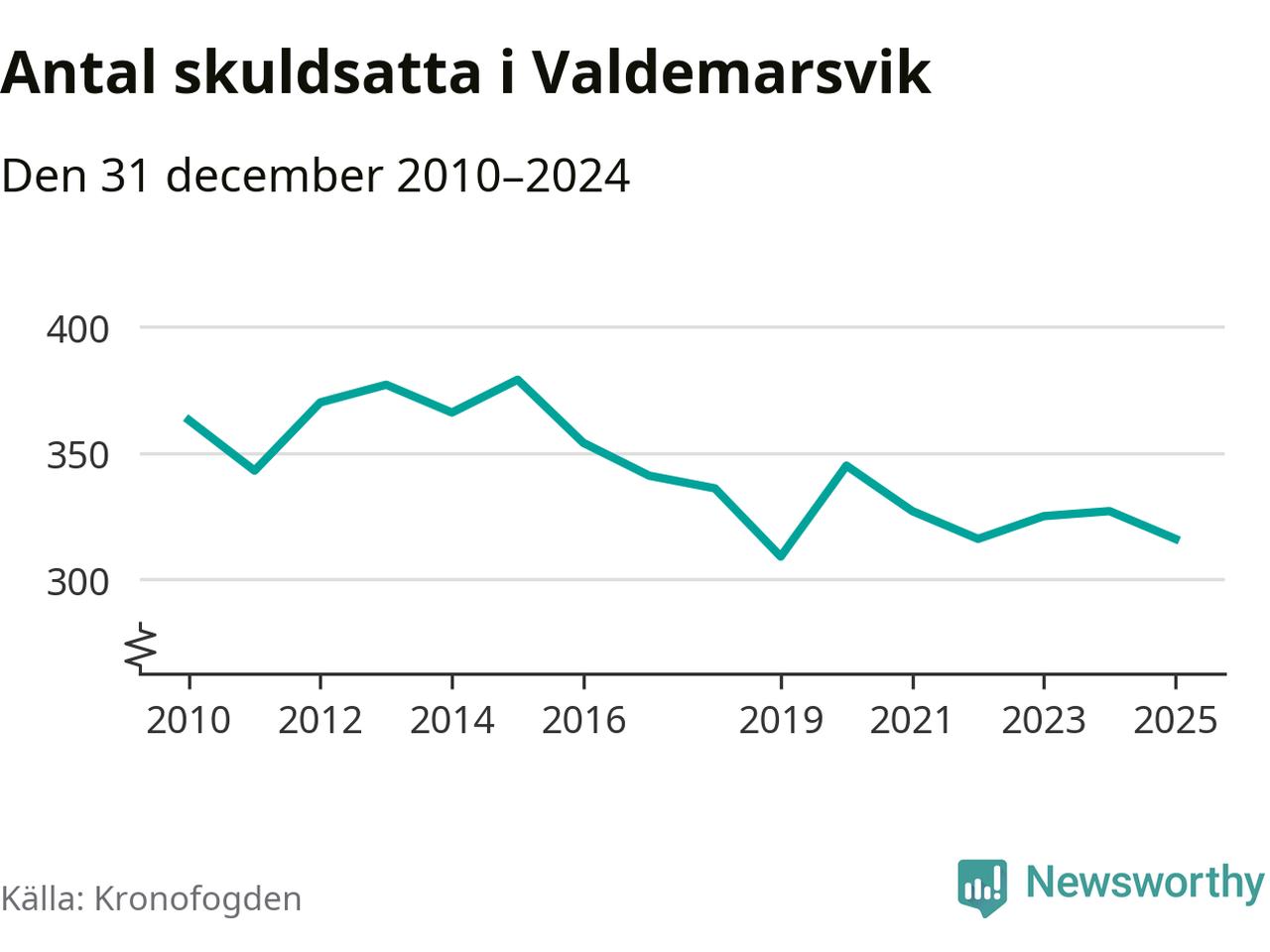 Antalet Valdemarsviksbor hos Kronofogden minskade i fjol. Vid årskiftet var 316 invånare i kommunen skyldiga totalt 105,9 miljoner kronor. Det är en minskning med elva personer – eller 3 procent – jämfört med året innan.