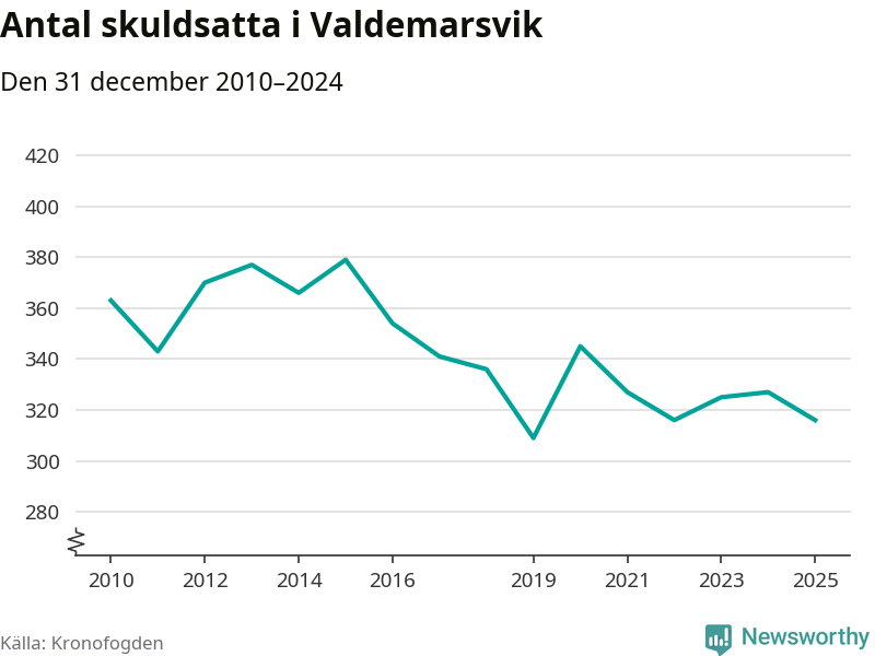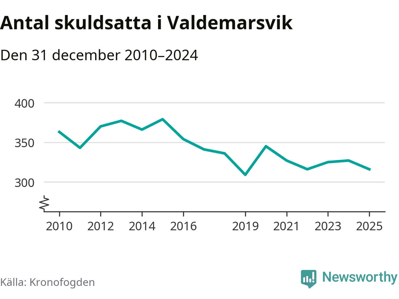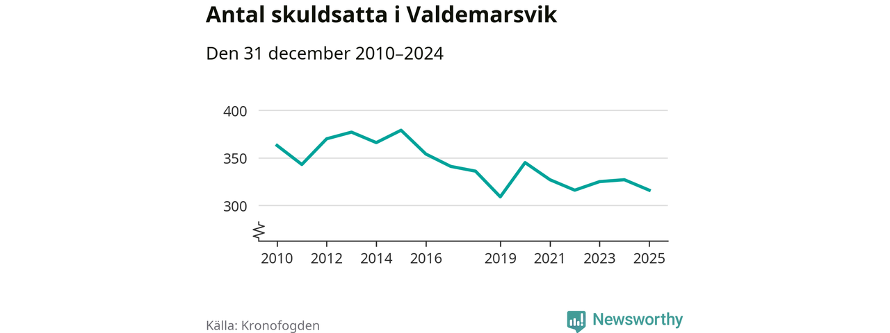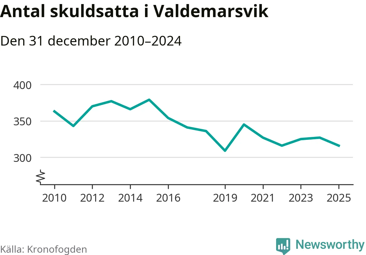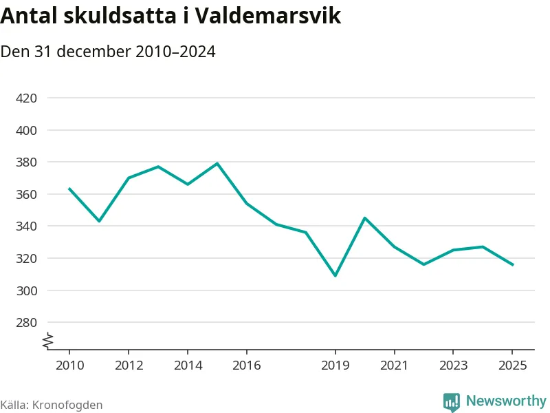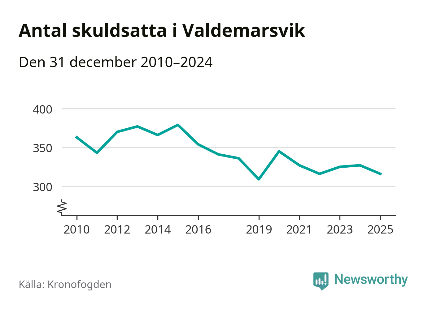 Antalet Valdemarsviksbor hos Kronofogden minskade i fjol. Vid årskiftet var 316 invånare i kommunen skyldiga totalt 105,9 miljoner kronor. Det är en minskning med elva personer – eller 3 procent – jämfört med året innan.