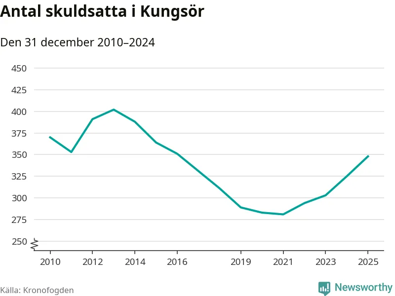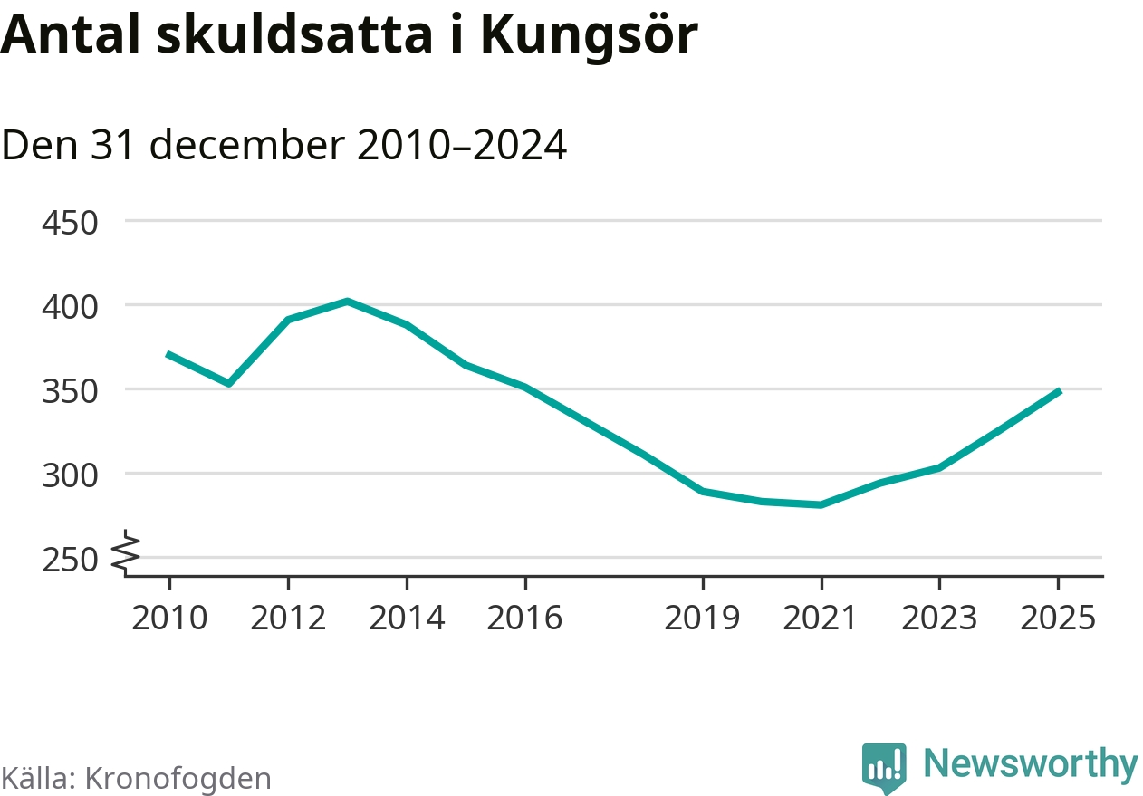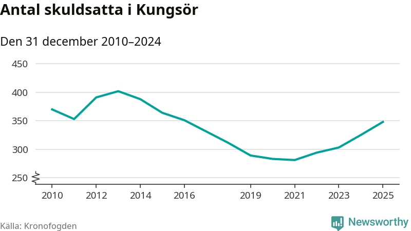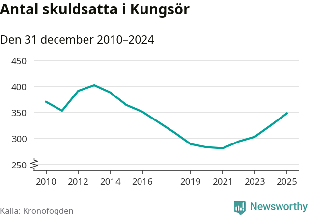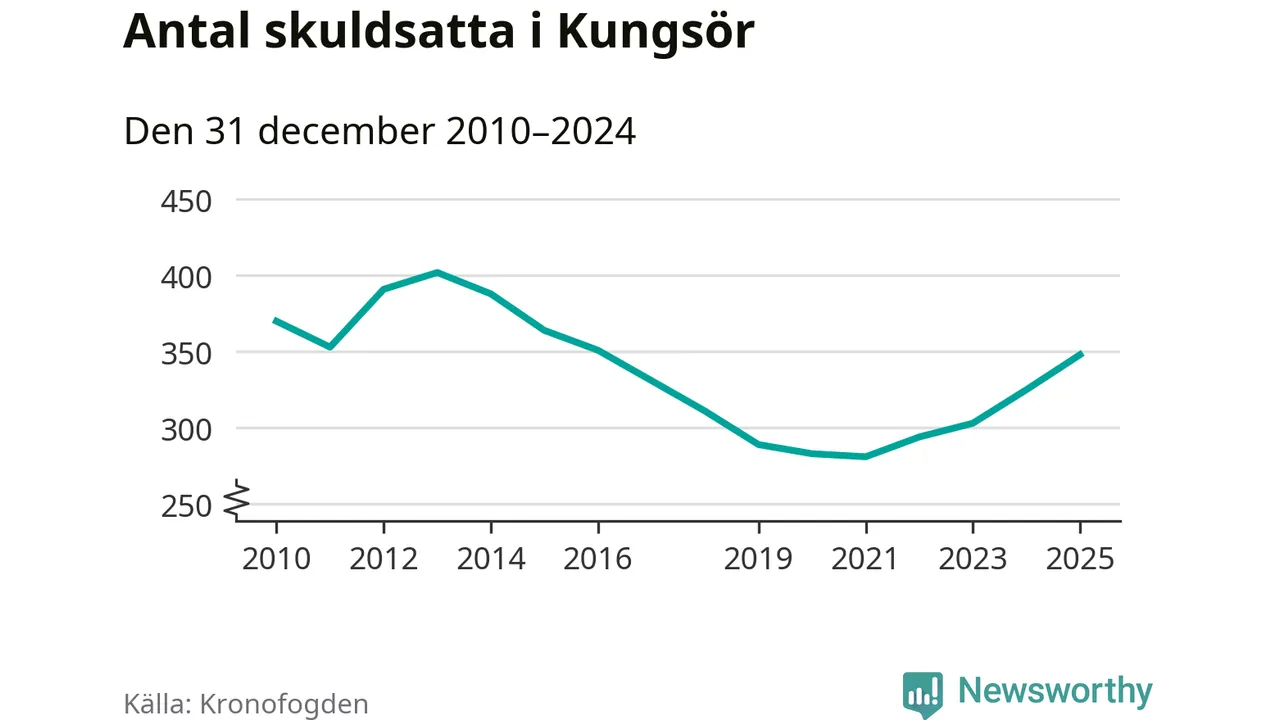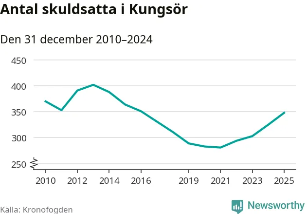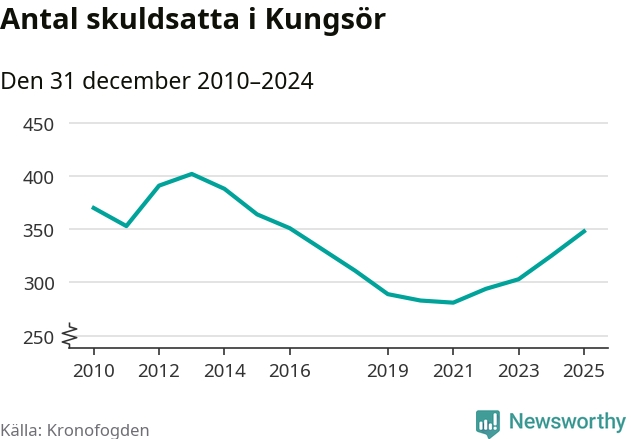 Allt fler Kungsörsbor hamnar hos Kronofogden. Vid årskiftet var 348 invånare i kommunen skyldiga totalt 106,3 miljoner kronor. Det är en ökning med 23 personer – eller 7 procent – jämfört med året innan. Det är det högsta antalet sedan 2016.