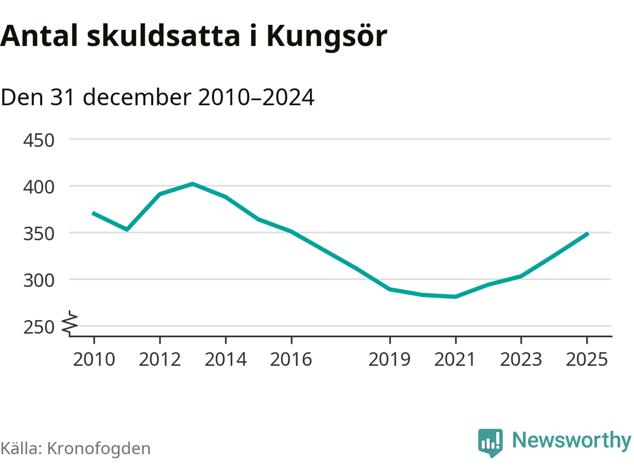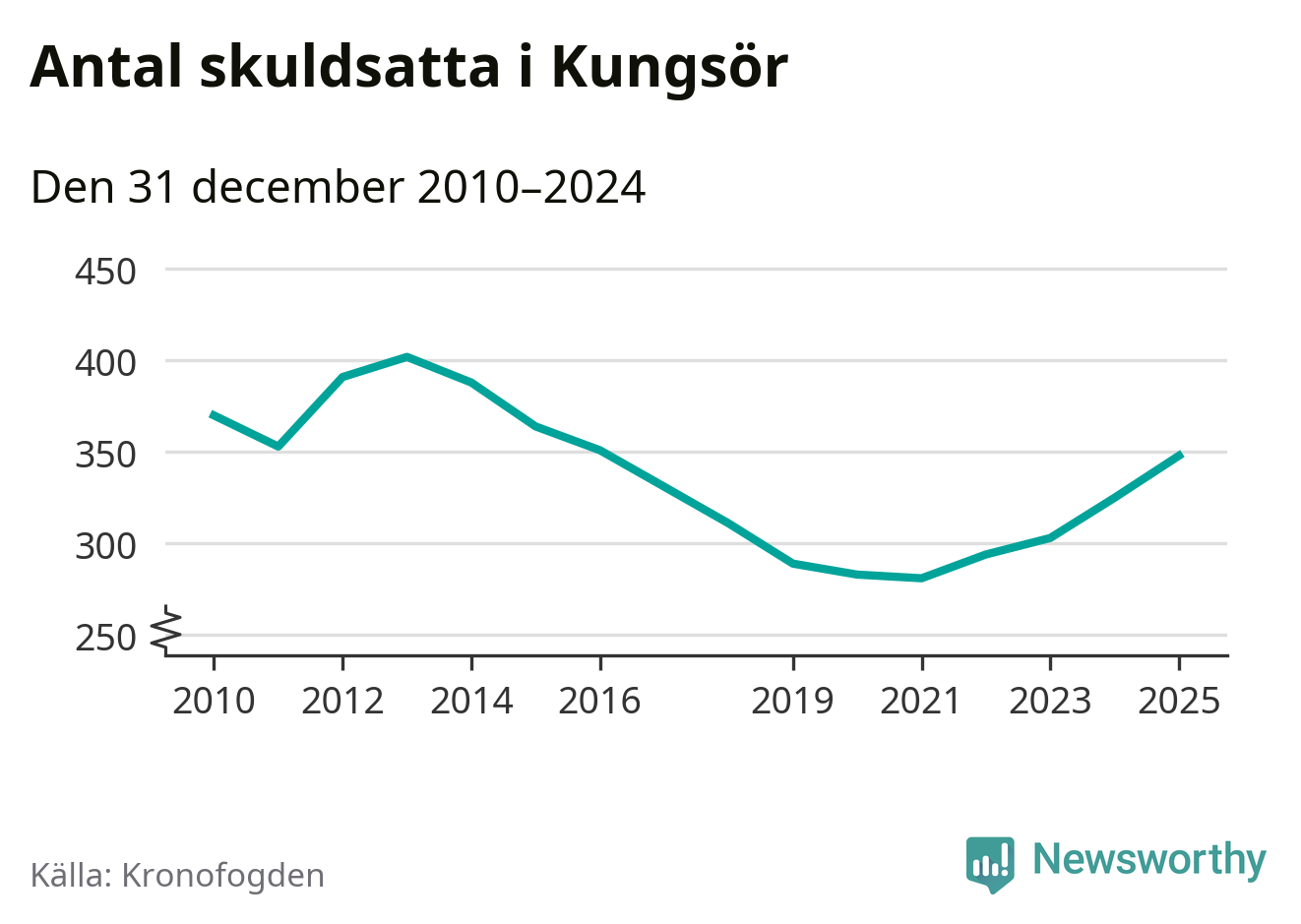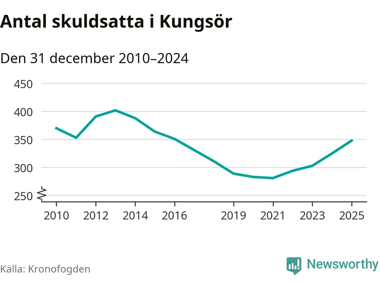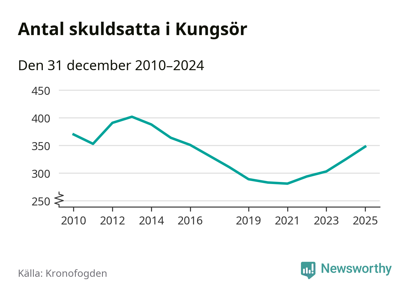 Allt fler Kungsörsbor hamnar hos Kronofogden. Vid årskiftet var 348 invånare i kommunen skyldiga totalt 106,3 miljoner kronor. Det är en ökning med 23 personer – eller 7 procent – jämfört med året innan. Det är det högsta antalet sedan 2016.