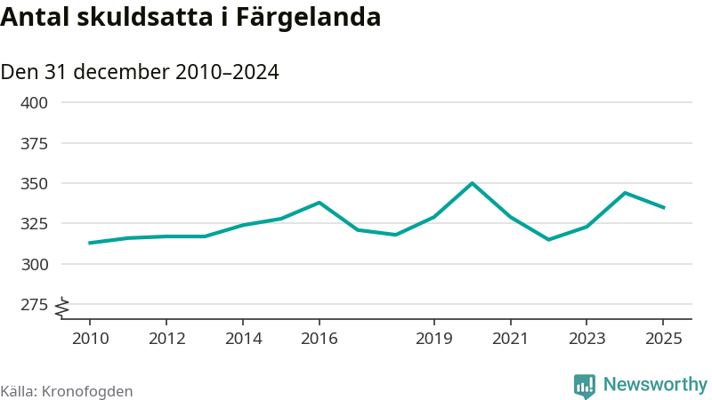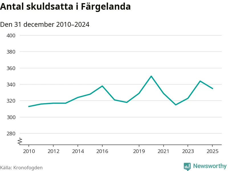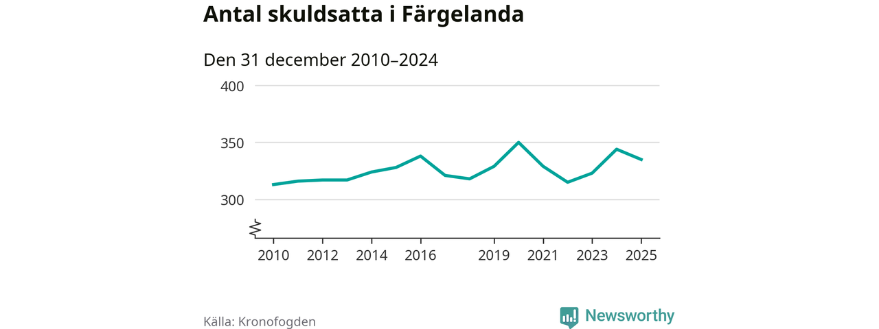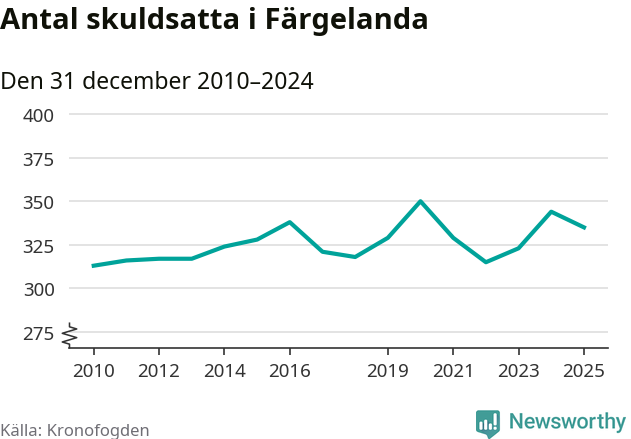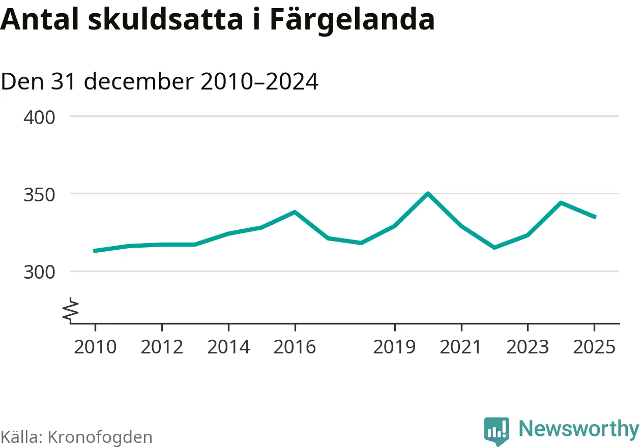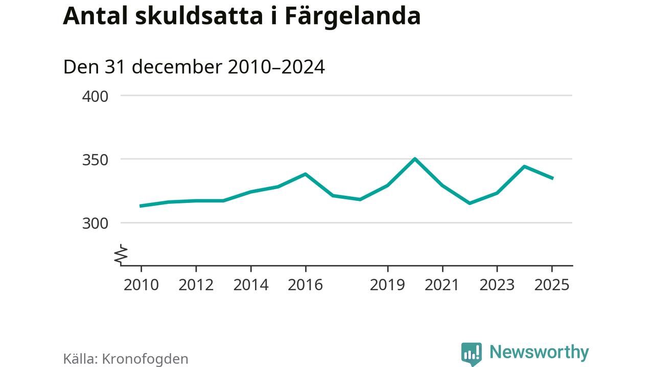 Vid årskiftet var 7 procent av alla Färgelandabor över 18 år registrerade hos Kronofogden. Det är den högsta andelen av alla kommuner i Västra Götaland. Lägst andel skuldsatta i länet finns på Öckerö (2 procent).