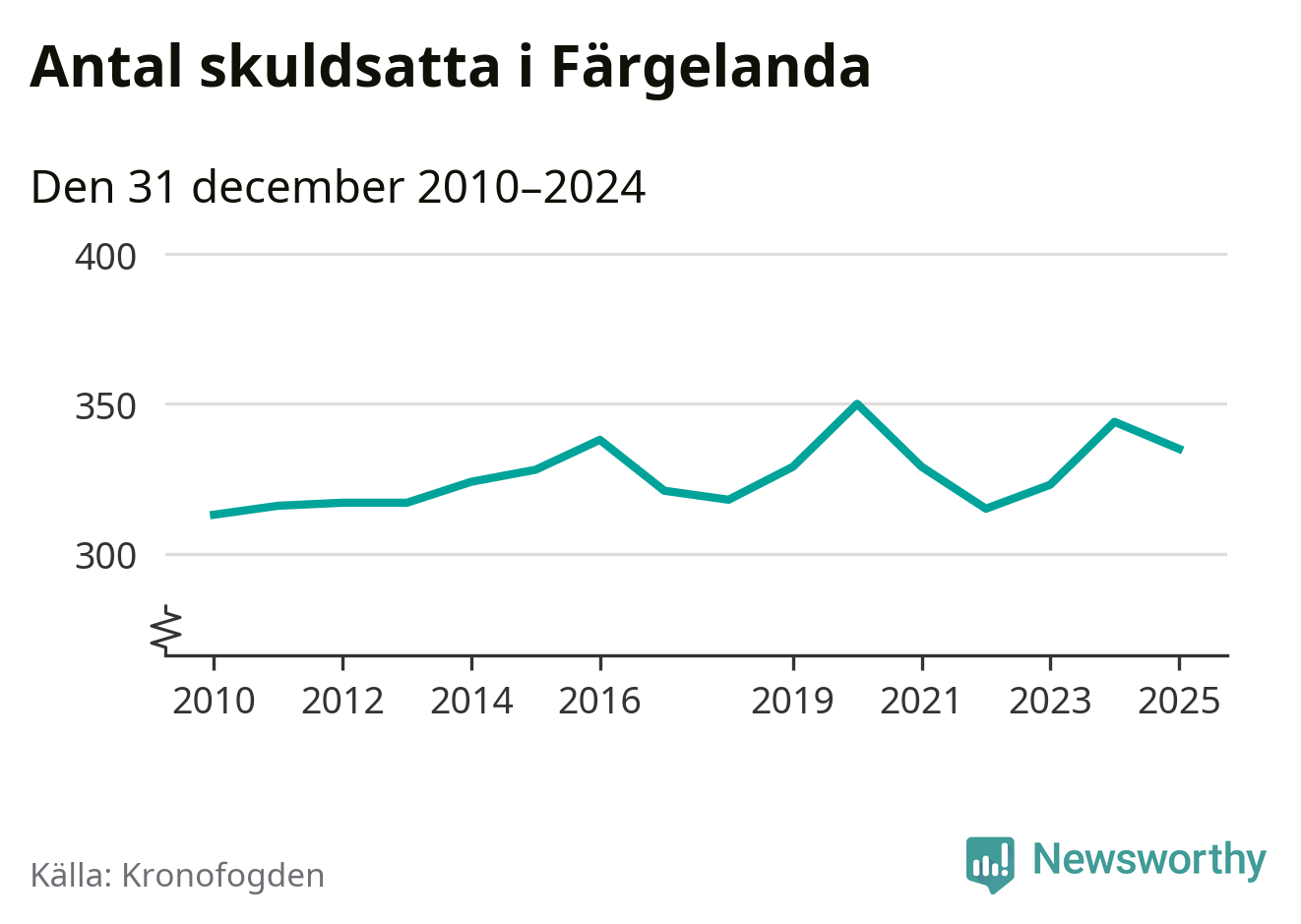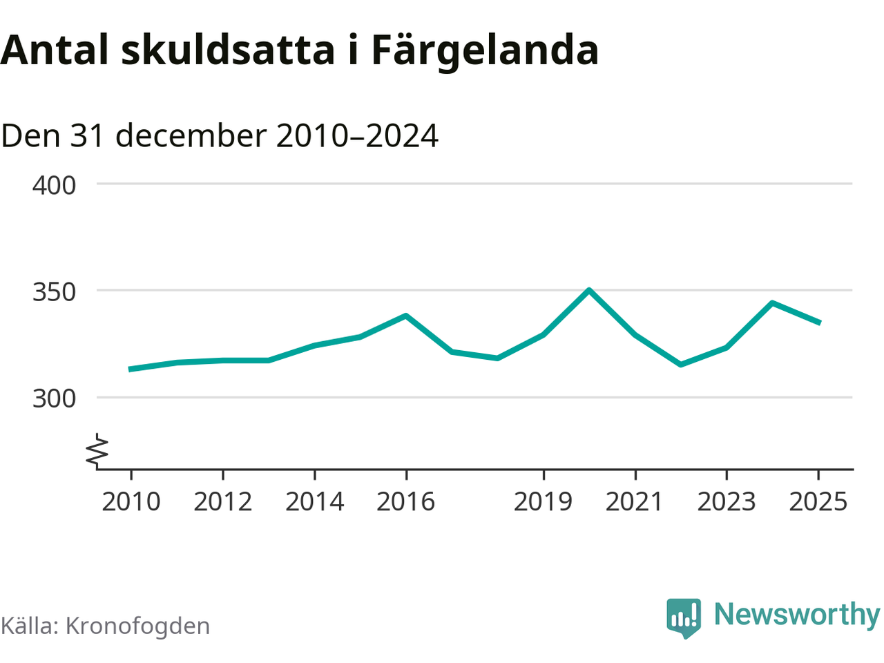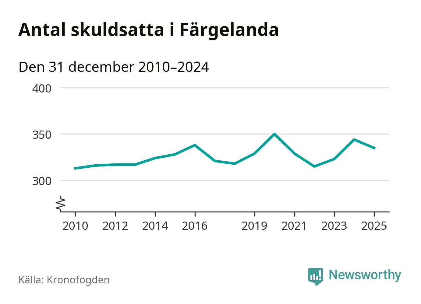 Vid årskiftet var 7 procent av alla Färgelandabor över 18 år registrerade hos Kronofogden. Det är den högsta andelen av alla kommuner i Västra Götaland. Lägst andel skuldsatta i länet finns på Öckerö (2 procent).