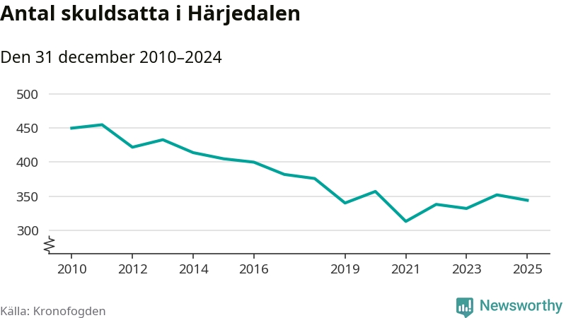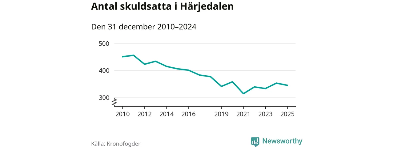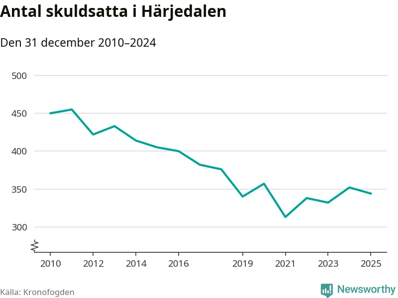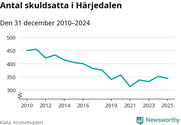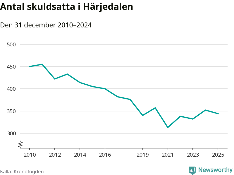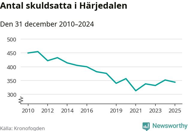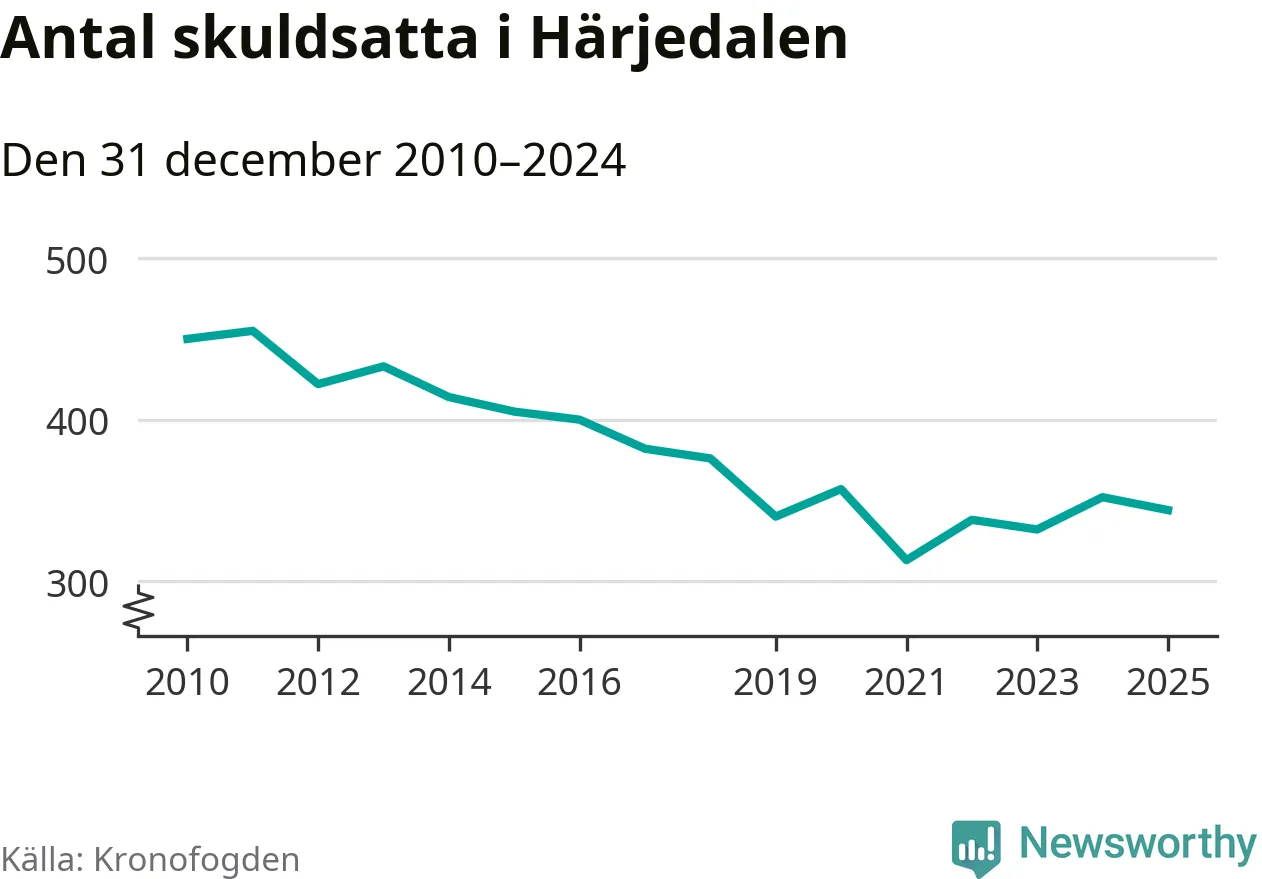 Antalet härjedalingar hos Kronofogden minskade i fjol. Vid årskiftet var 344 invånare i kommunen skyldiga totalt 73 miljoner kronor. Det är en minskning med åtta personer jämfört med året innan.