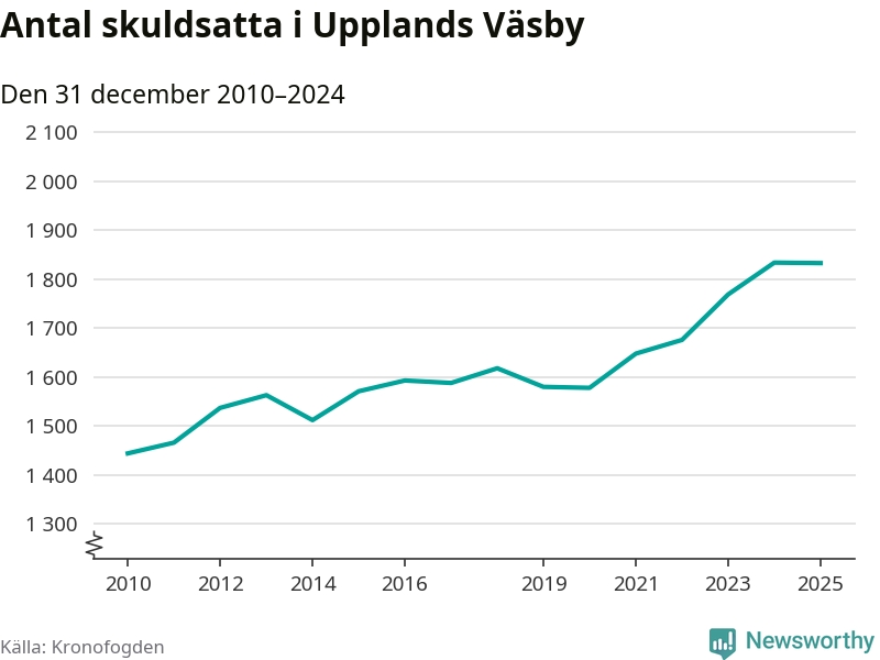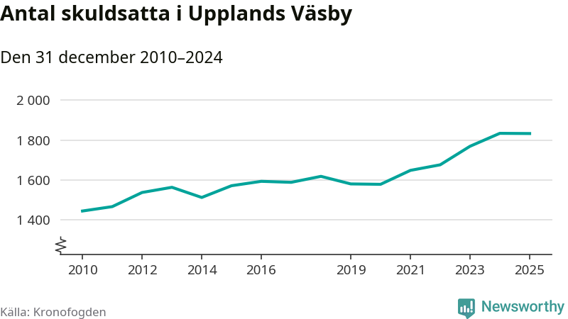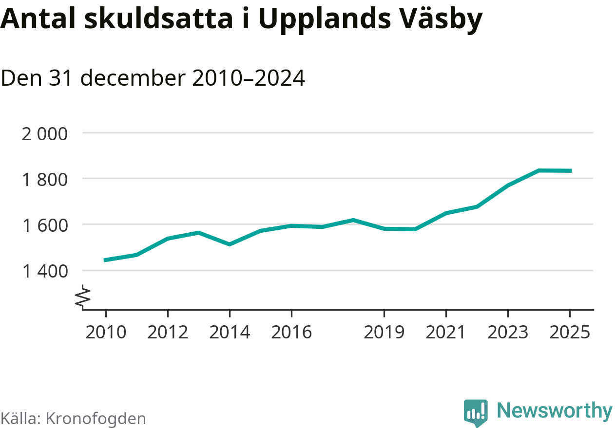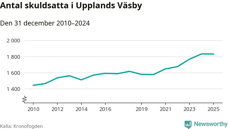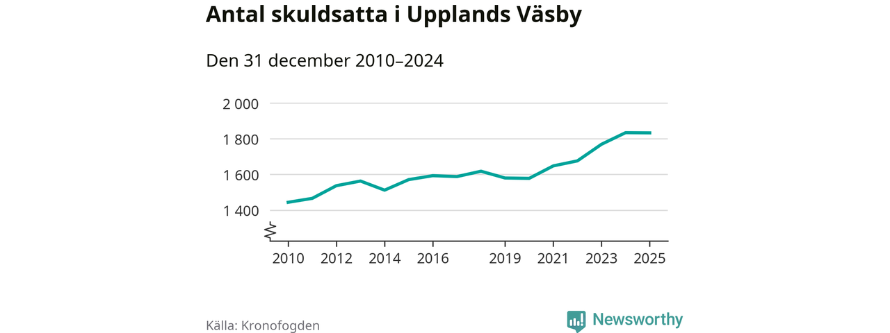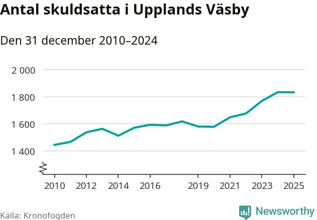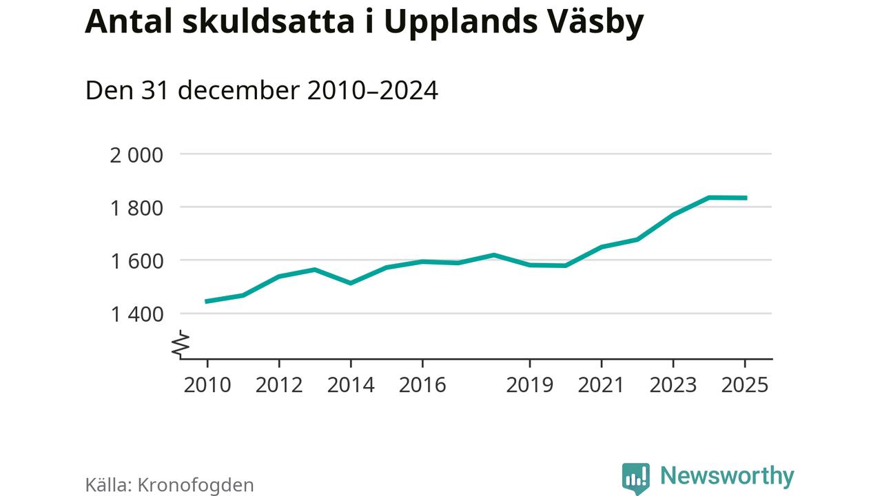 Vid årskiftet var 5 procent av alla Väsby­bor över 18 år registrerade hos Kronofogden. Störst andel skuldsatta i länet finns i Botkyrka (6 procent), medan den lägsta andelen finns i Danderyd (1 procent).