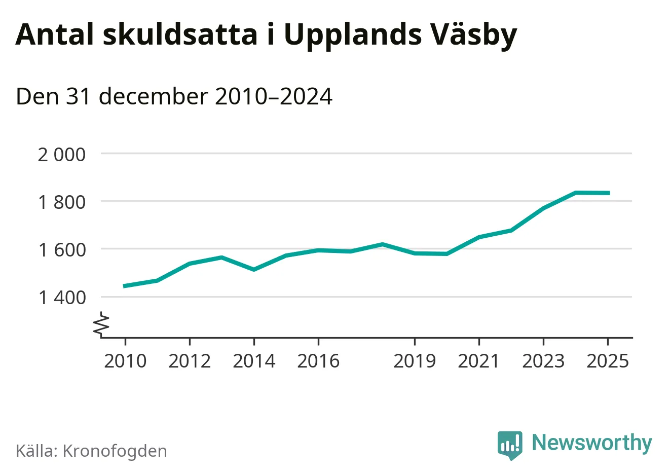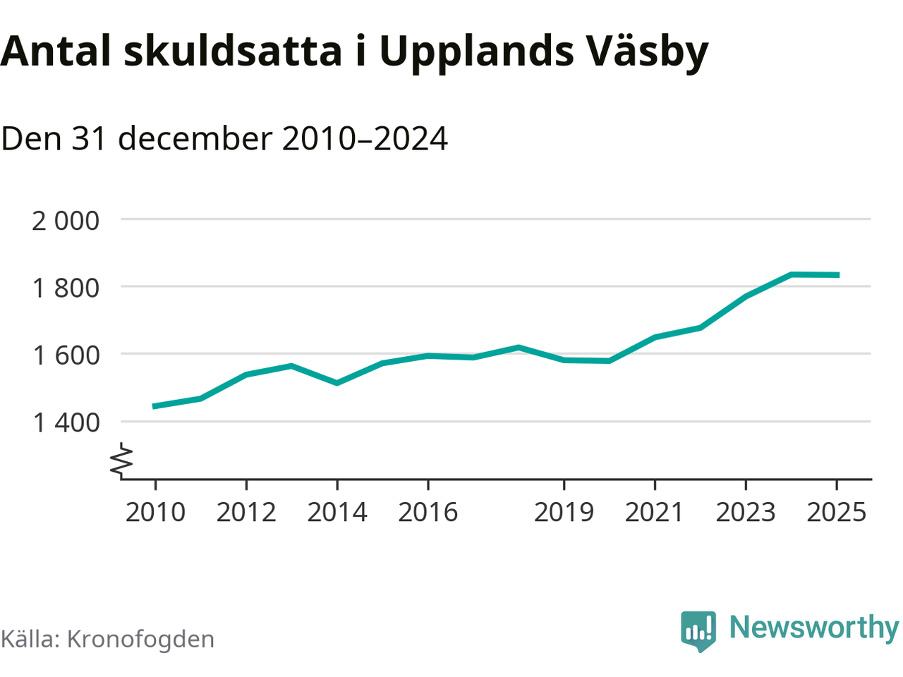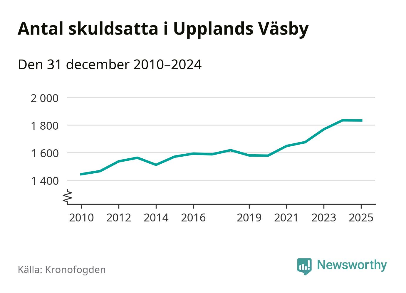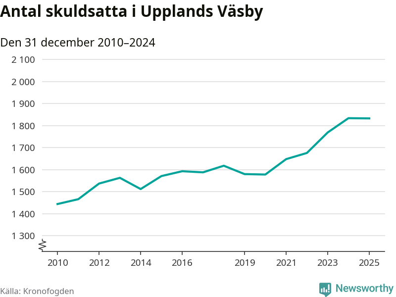 Vid årskiftet var 5 procent av alla Väsby­bor över 18 år registrerade hos Kronofogden. Störst andel skuldsatta i länet finns i Botkyrka (6 procent), medan den lägsta andelen finns i Danderyd (1 procent).