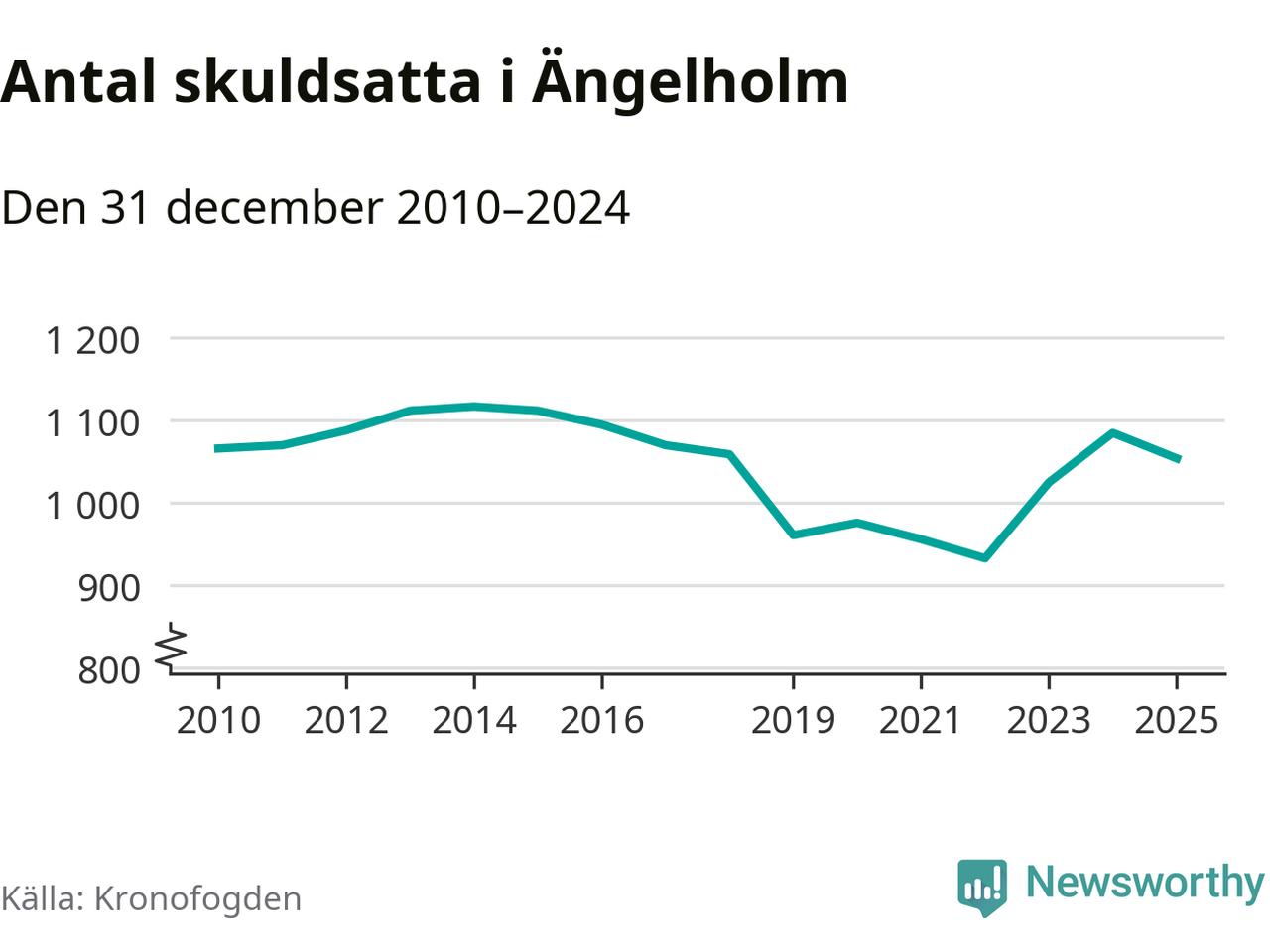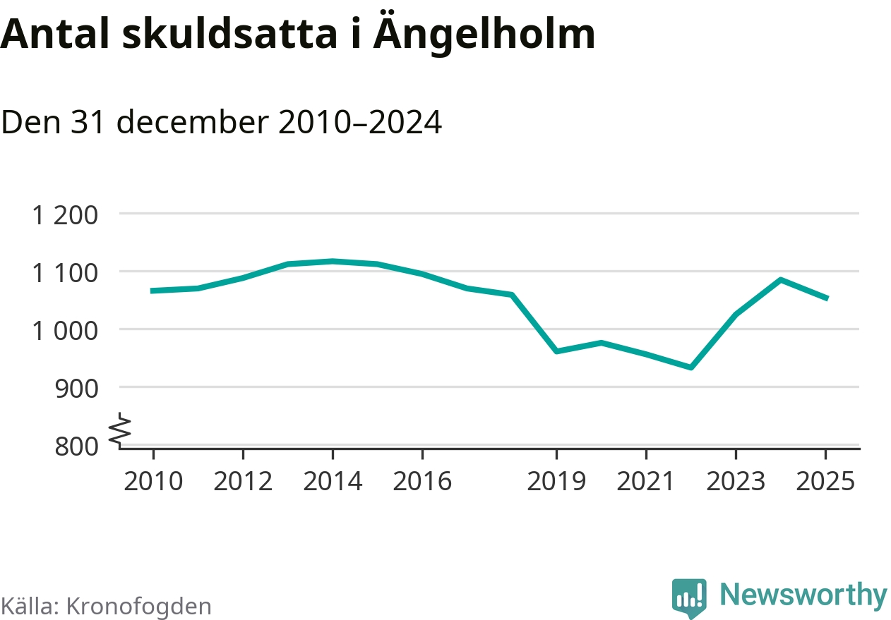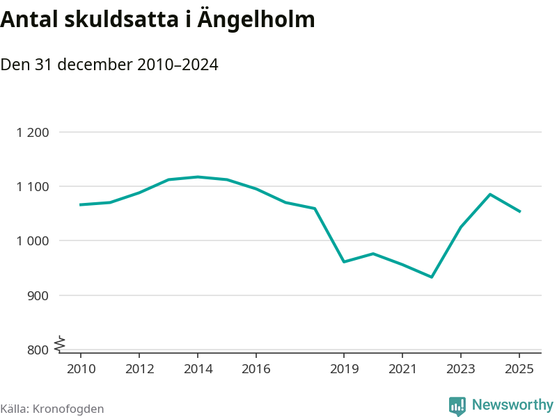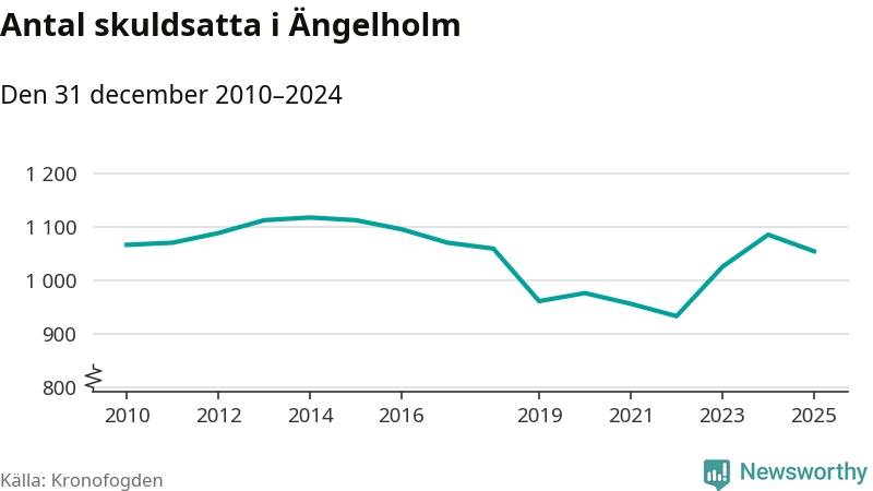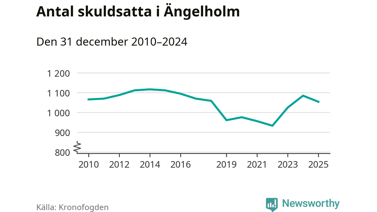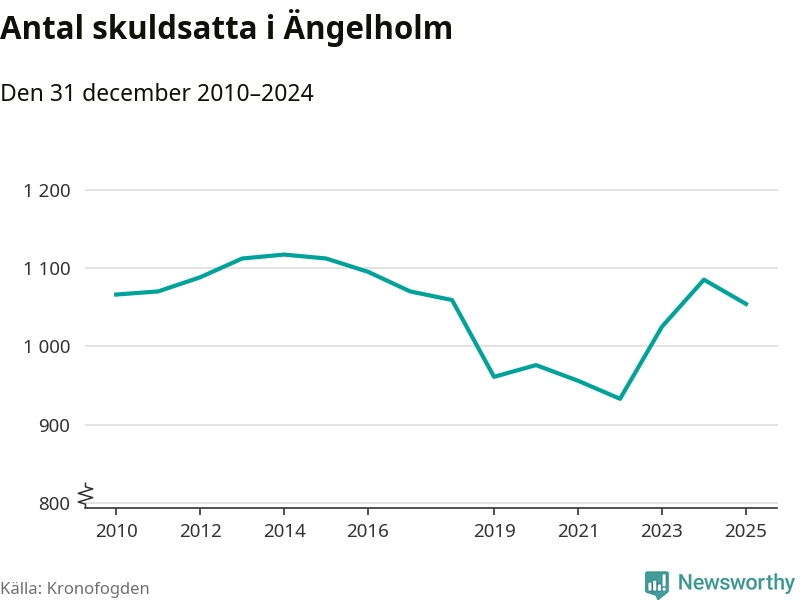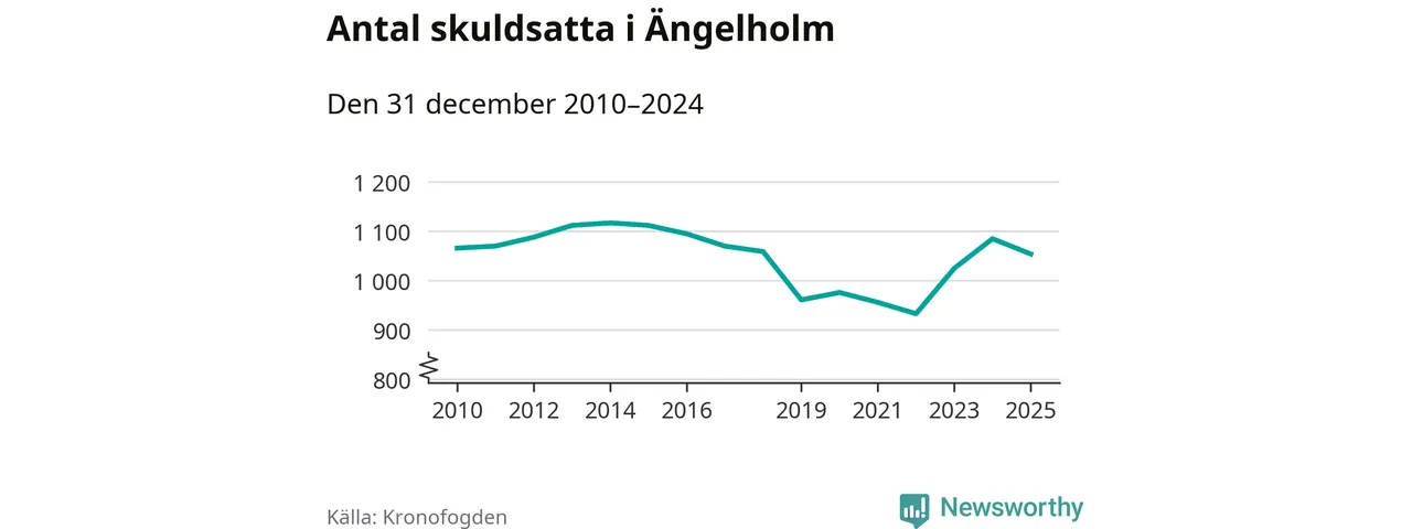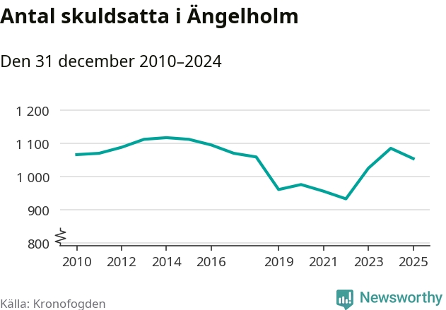 Vid årskiftet var 3 procent av alla Ängelholmsbor över 18 år registrerade hos Kronofogden. Störst andel skuldsatta i länet finns i Perstorp (9 procent), medan den lägsta andelen finns i Lomma (1 procent).