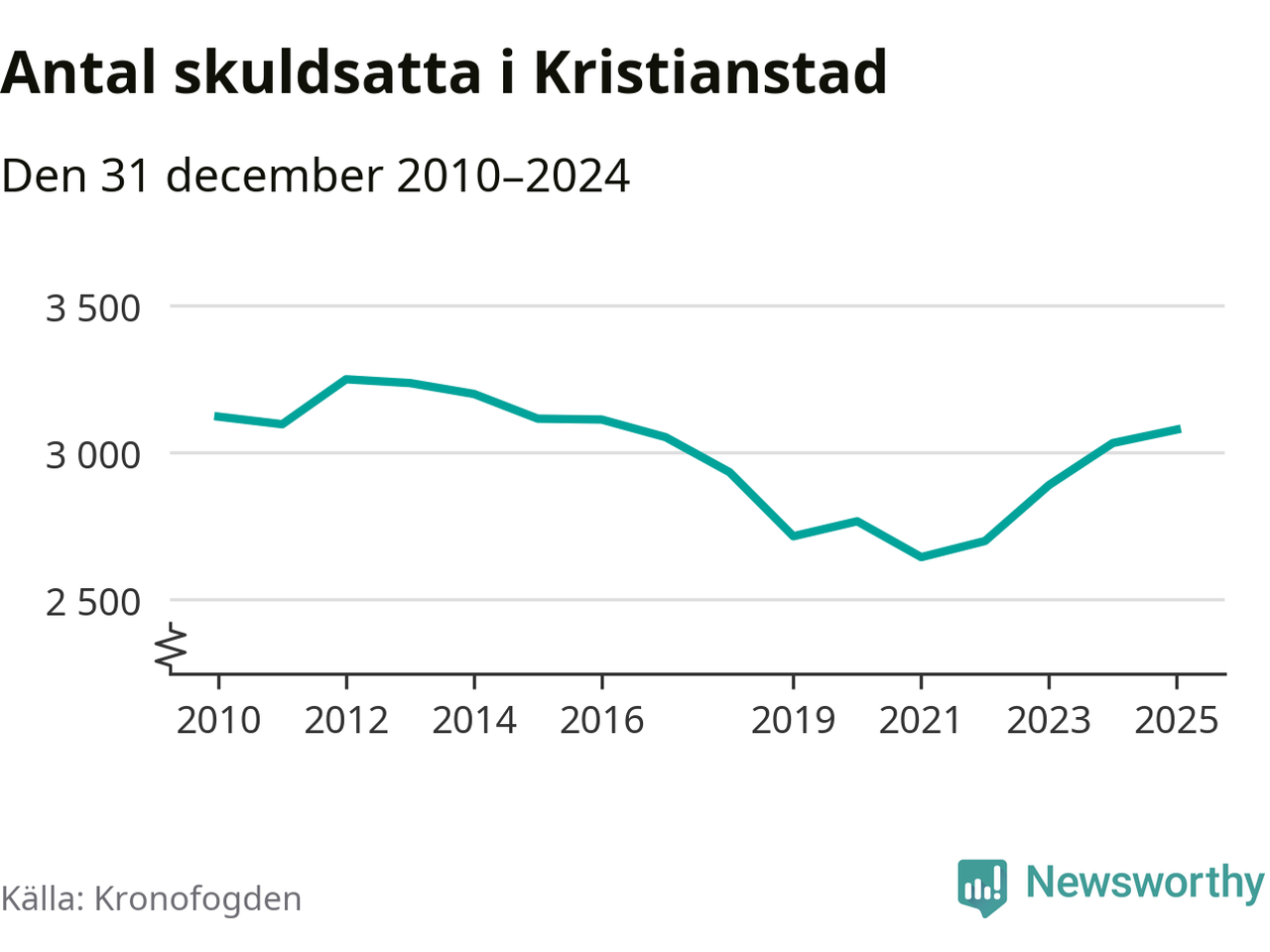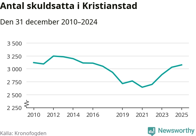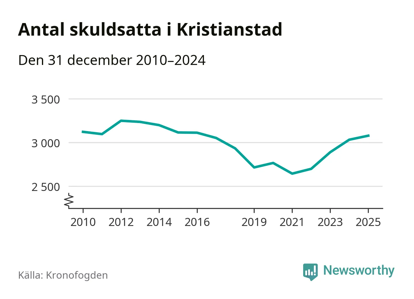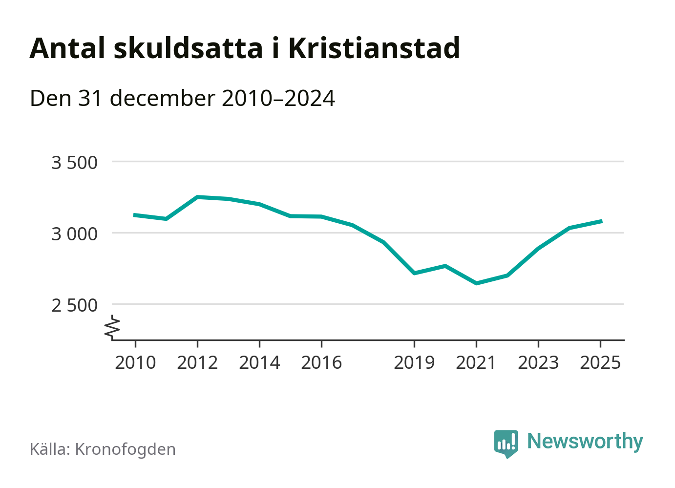 Allt fler Kristianstads­bor hamnar hos Kronofogden. Vid årskiftet var 3 078 invånare i kommunen skyldiga totalt 953,2 miljoner kronor. Det är en ökning med 46 personer – eller 2 procent – jämfört med året innan. Det är det högsta antalet sedan 2016.