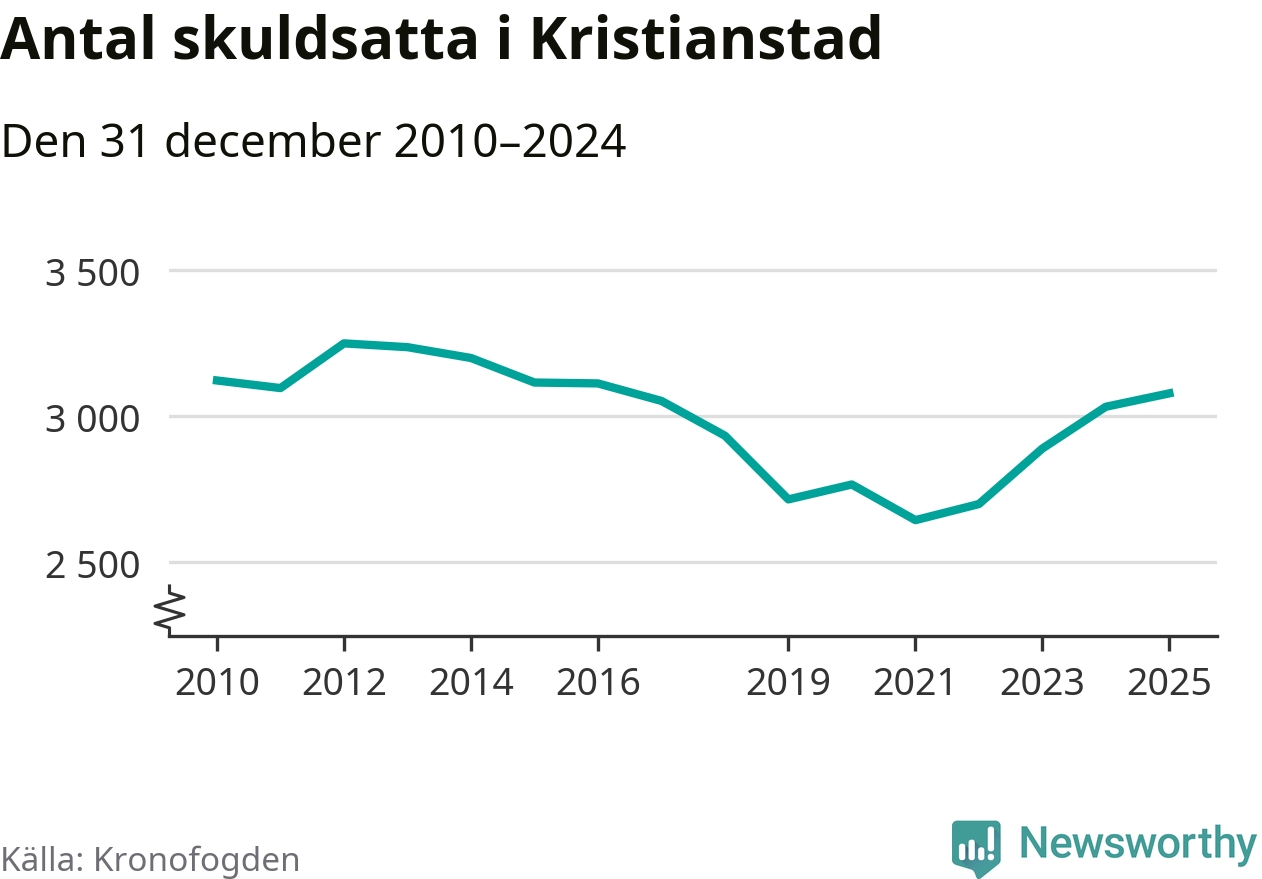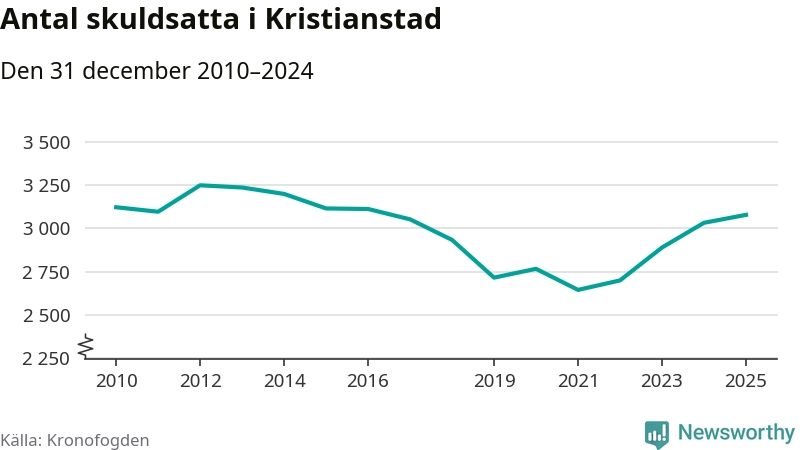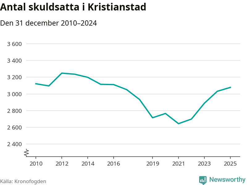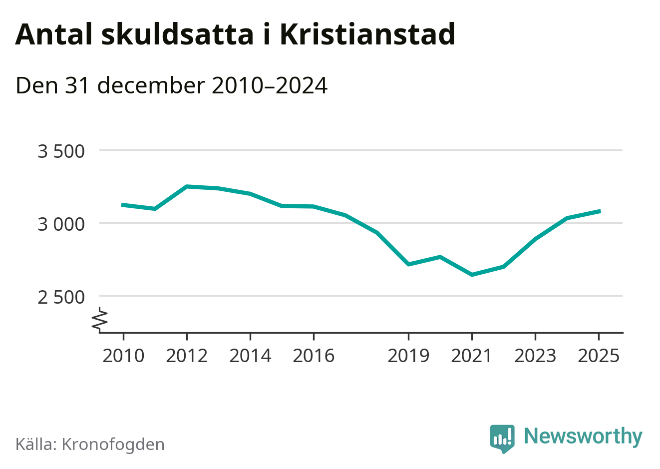 Allt fler Kristianstads­bor hamnar hos Kronofogden. Vid årskiftet var 3 078 invånare i kommunen skyldiga totalt 953,2 miljoner kronor. Det är en ökning med 46 personer – eller 2 procent – jämfört med året innan. Det är det högsta antalet sedan 2016.