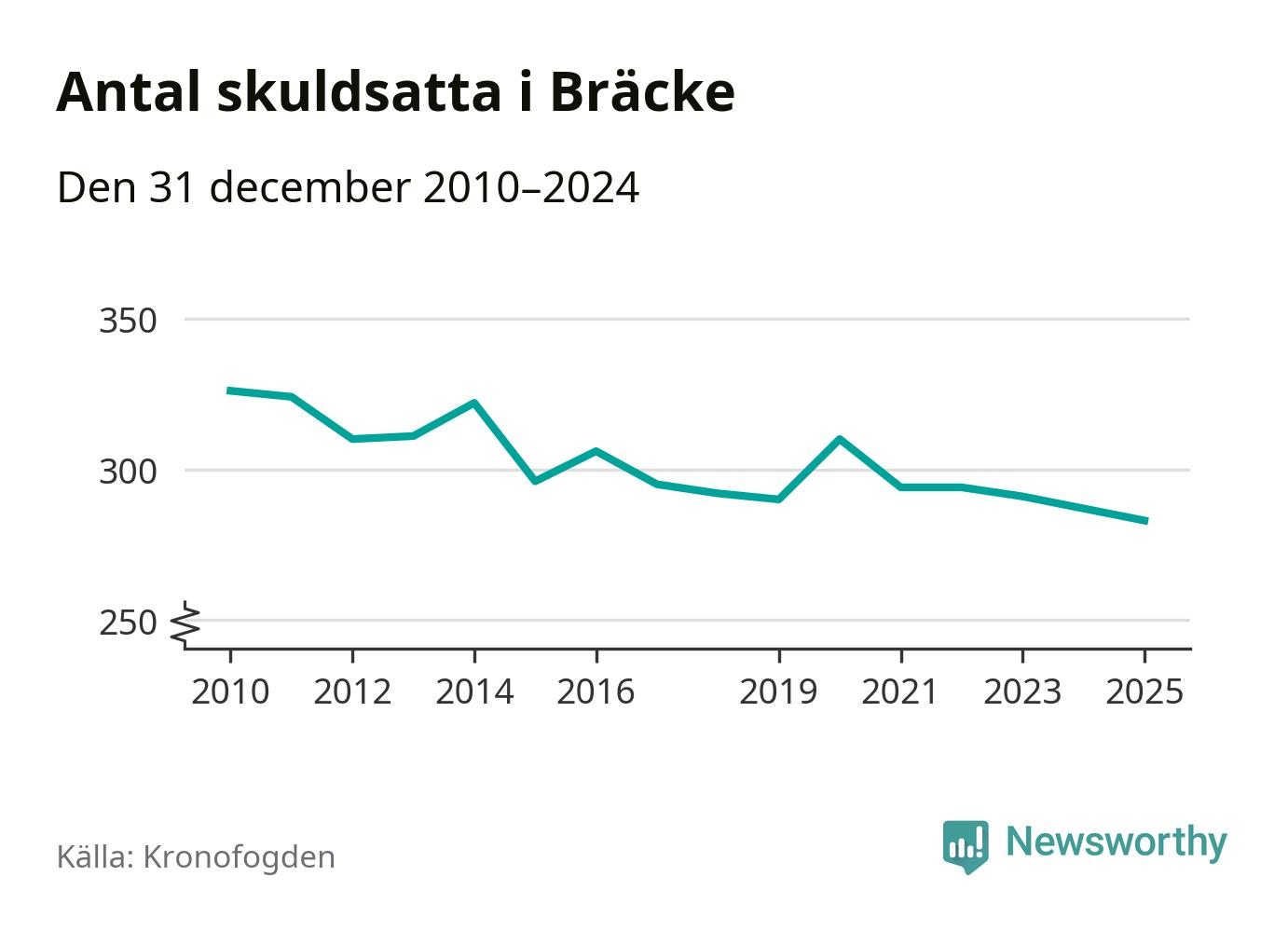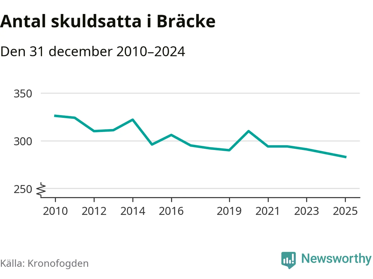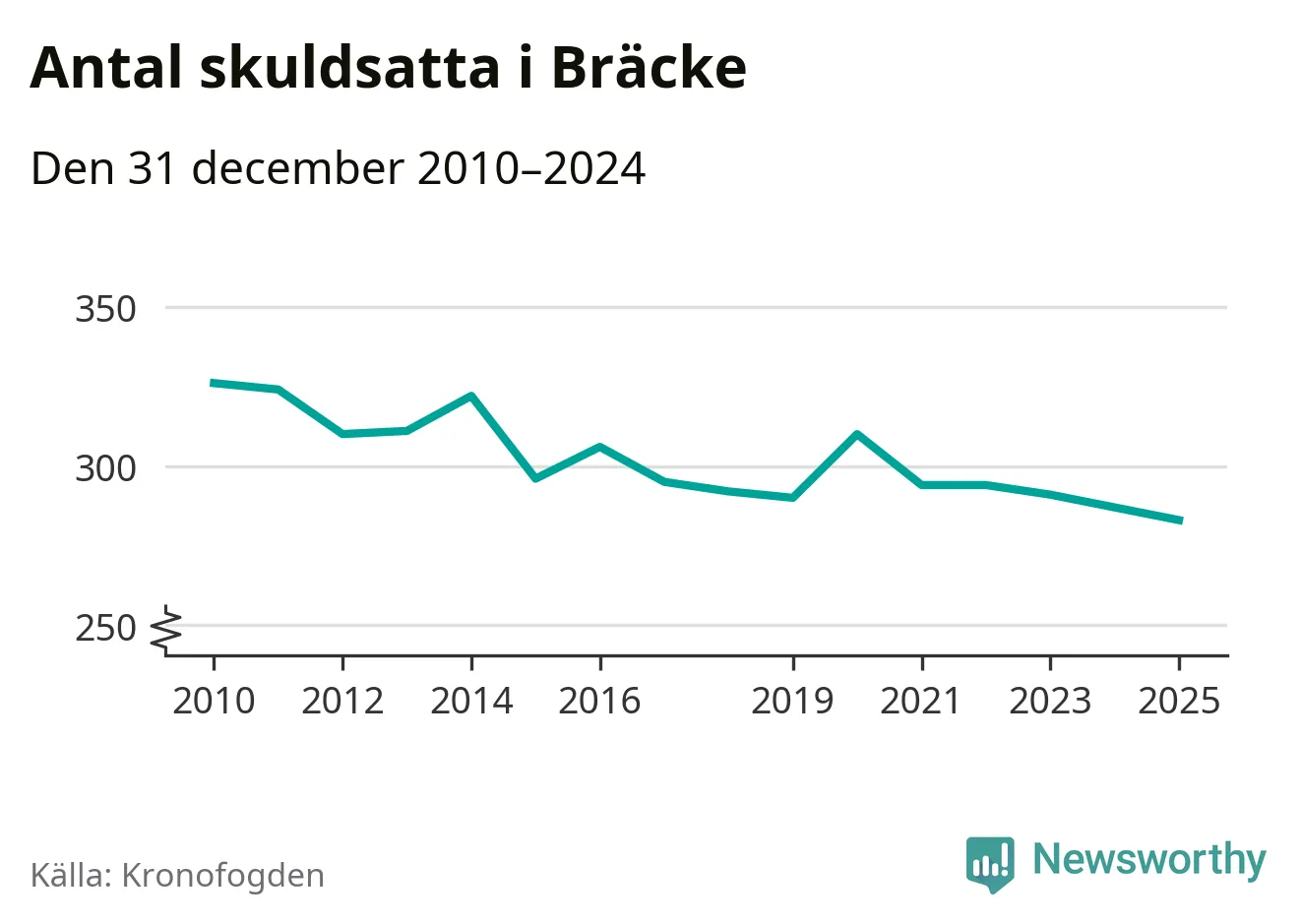 Inte sedan åtminstone 2010 har antalet registrerade hos Kronofogden i Bräcke varit så lågt. Vid årskiftet var 283 invånare i kommunen skyldiga totalt 86,5 miljoner kronor. Det är en minskning med fyra personer jämfört med året innan.