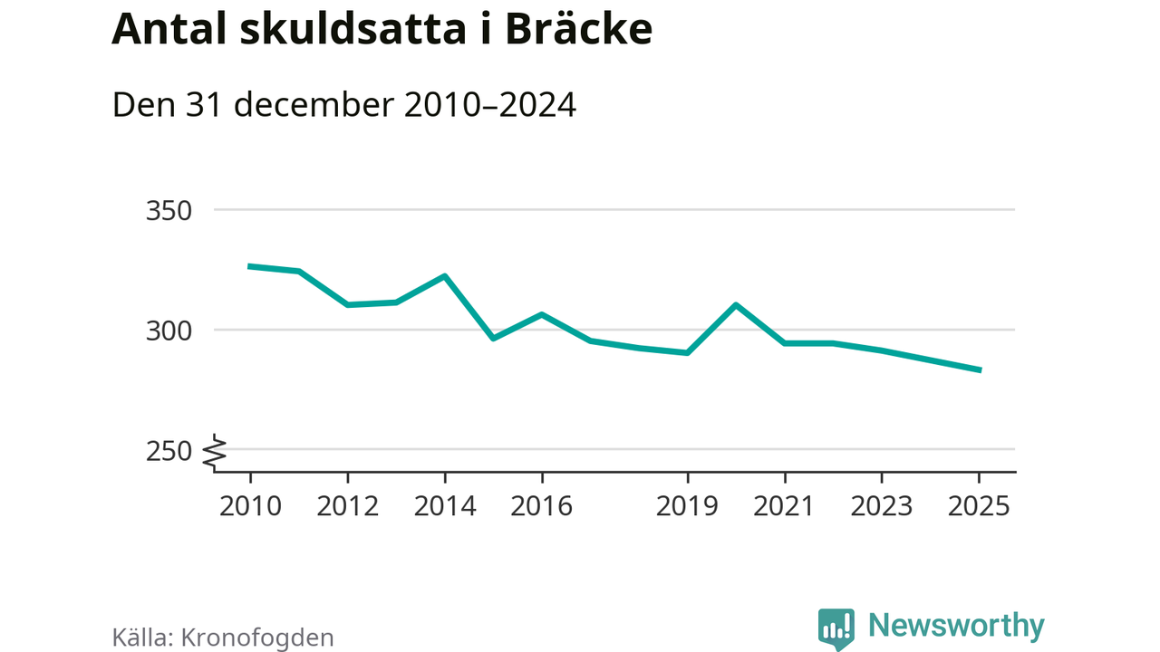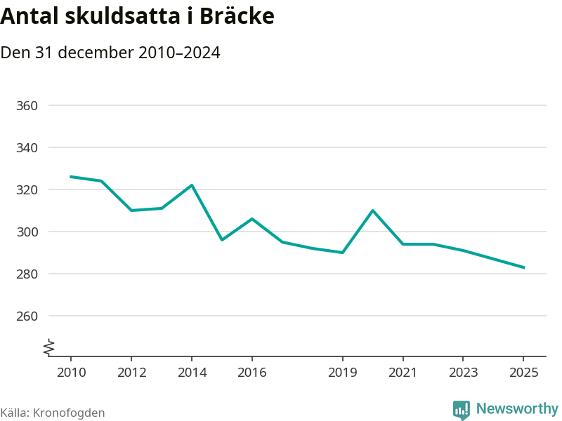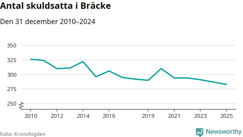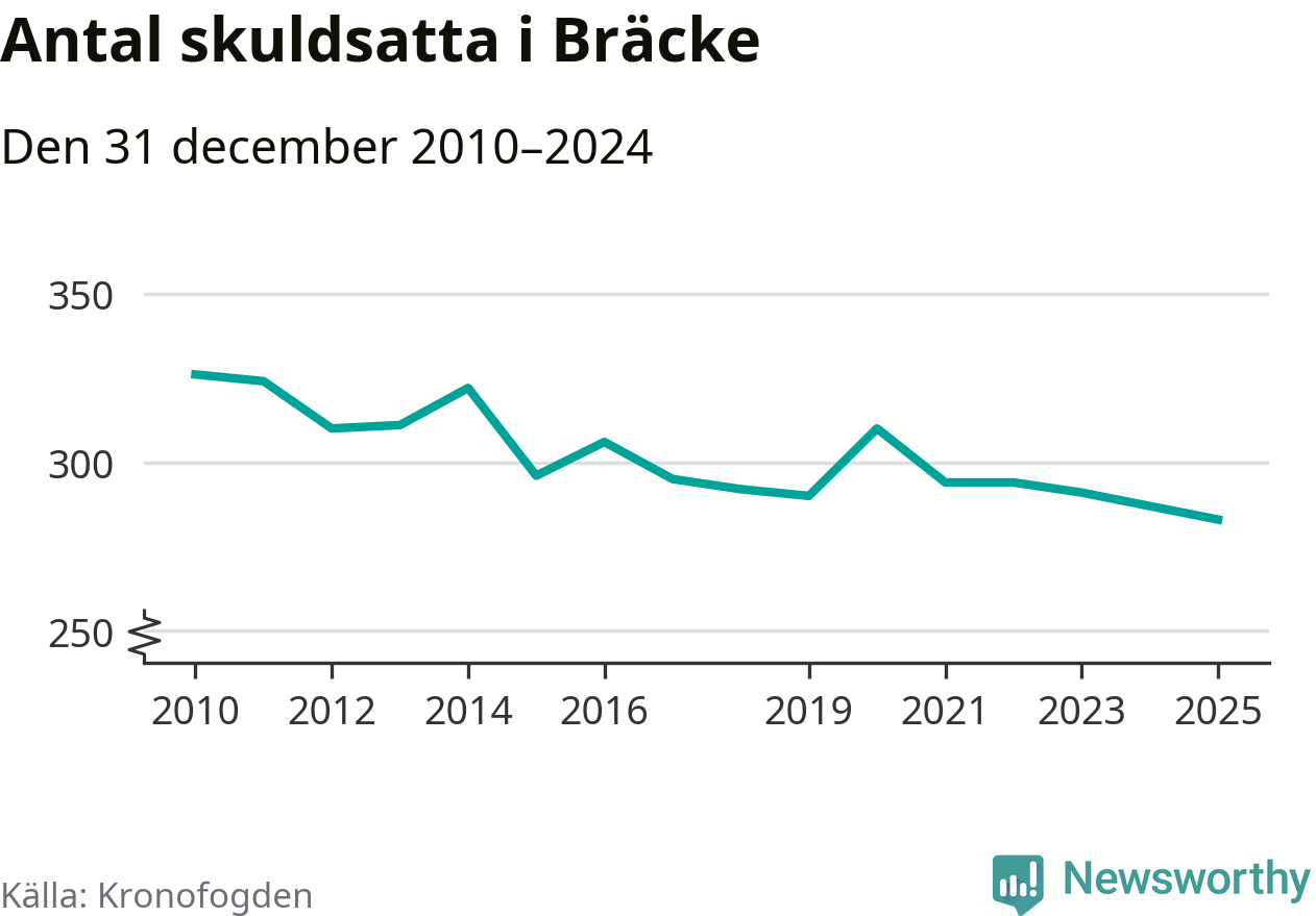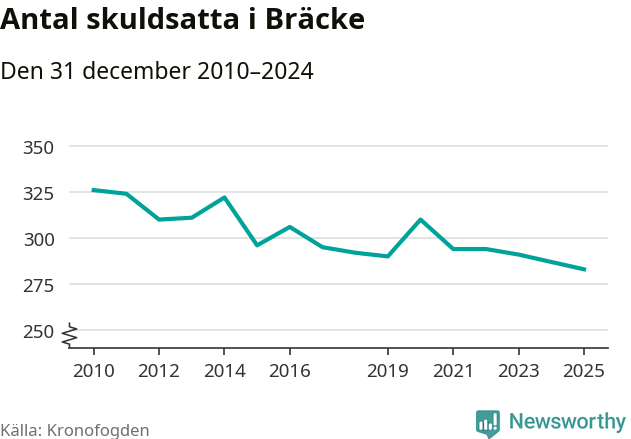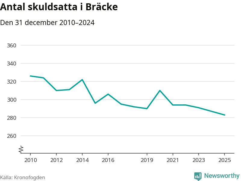 Inte sedan åtminstone 2010 har antalet registrerade hos Kronofogden i Bräcke varit så lågt. Vid årskiftet var 283 invånare i kommunen skyldiga totalt 86,5 miljoner kronor. Det är en minskning med fyra personer jämfört med året innan.