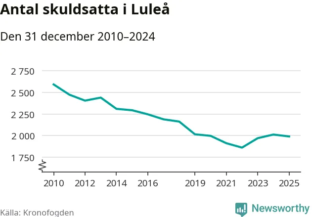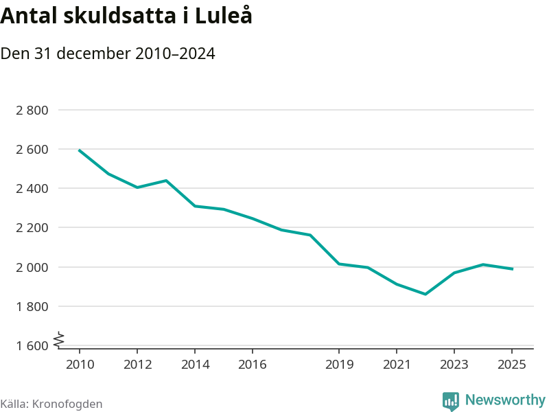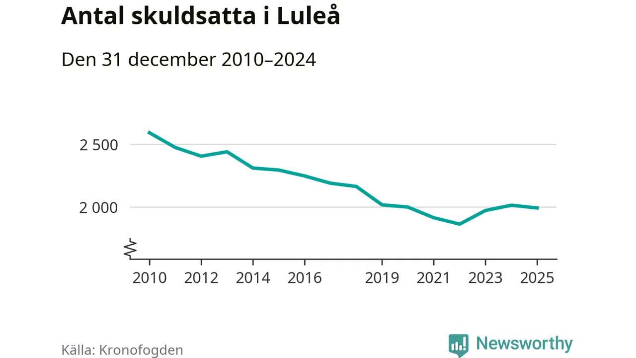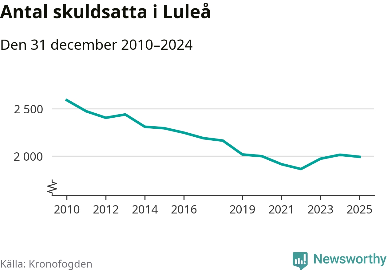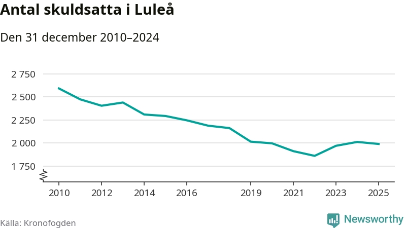 Antalet Luleåbor hos Kronofogden minskade i fjol. Vid årskiftet var 1 990 invånare i kommunen skyldiga totalt 777,5 miljoner kronor. Det är en minskning med 22 personer – eller 1 procent – jämfört med året innan.