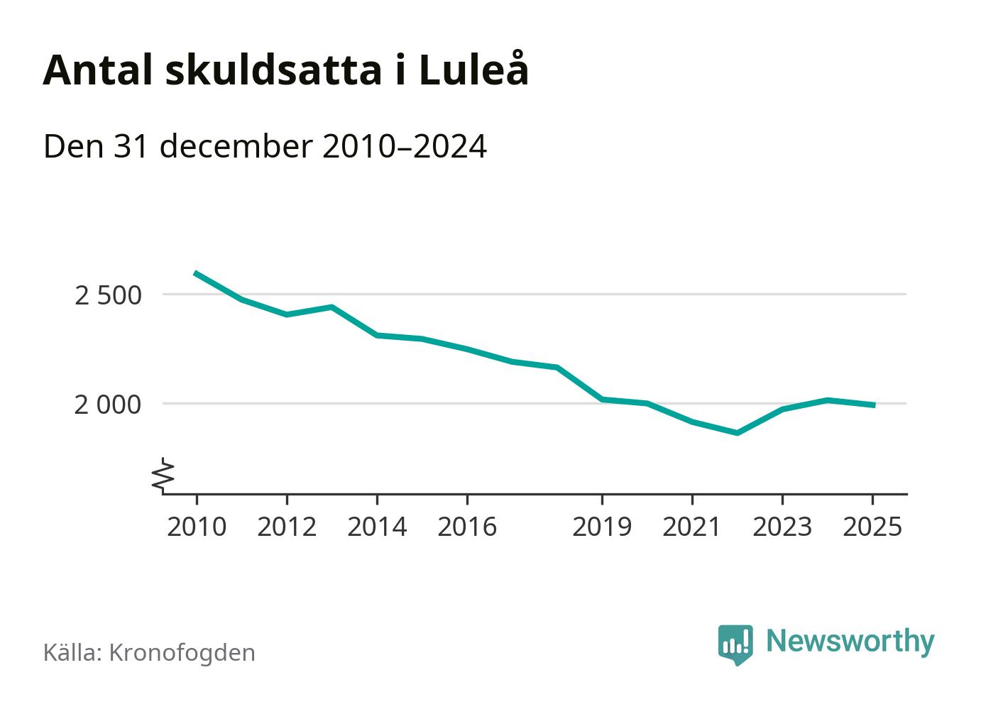Vid årskiftet var 3 procent av alla Luleåbor över 18 år registrerade hos Kronofogden. Störst andel skuldsatta i länet finns i Haparanda (6 procent), medan den lägsta andelen finns i Piteå (3 procent).
