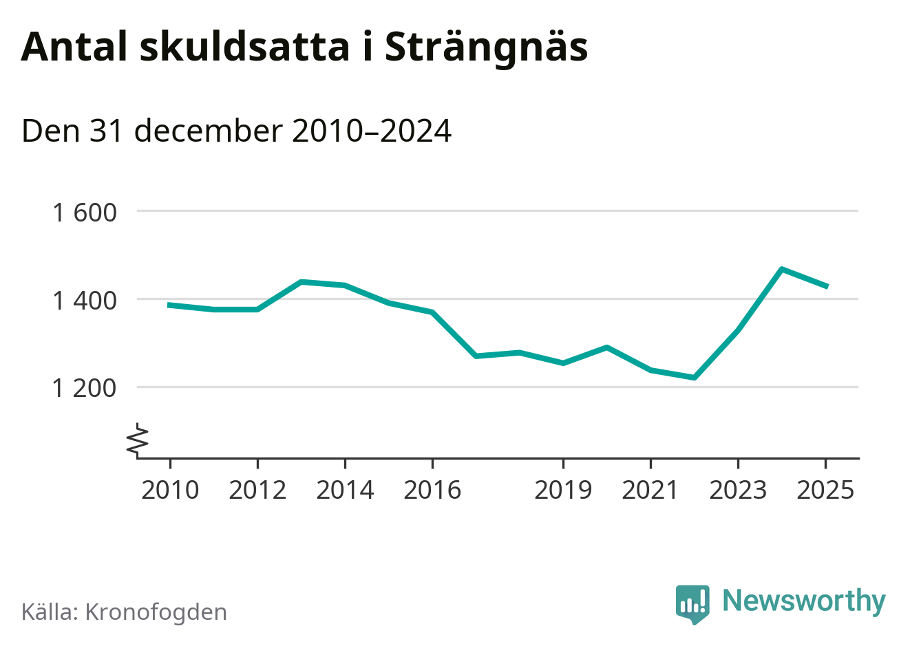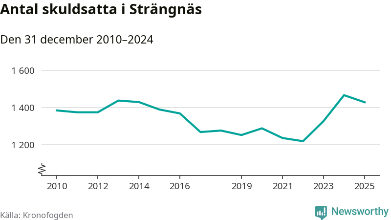Vid årskiftet var 5 procent av alla Strängnäs­bor över 18 år registrerade hos Kronofogden. Störst andel skuldsatta i länet finns i Eskilstuna (6 procent), medan den lägsta andelen finns i Trosa (3 procent).